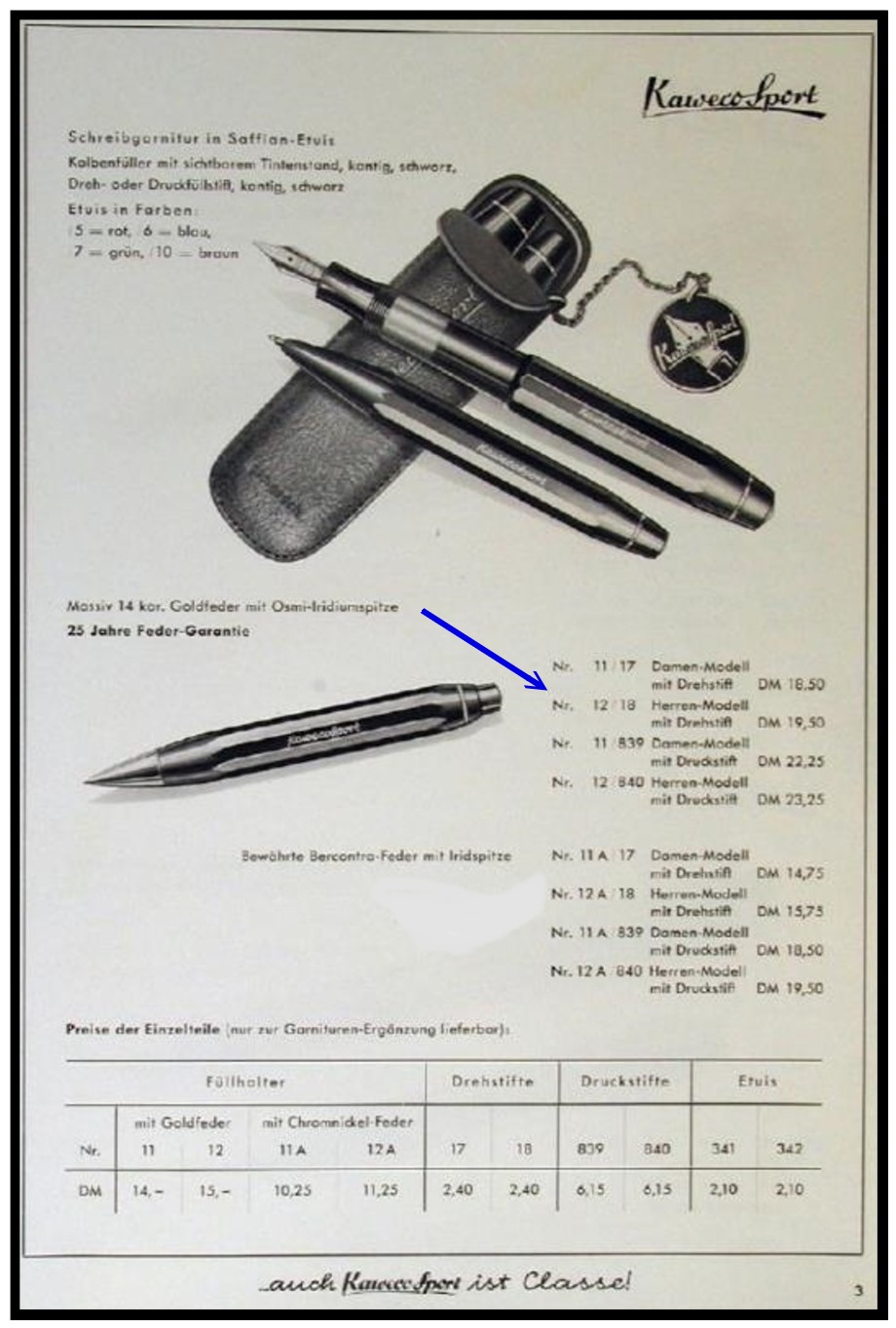 Quanto al cambio di colore della finestrella devo ammettere che è una mia suggestione: il wiki mi è stato di grandissimo aiuto e meno male che avete salvato dall'oblio l'opuscolo storico sulla kaweco. Lì e documentata la ristilizzazione del 1953: nel '49 in effetti la finestrella era ancora verde (versione 112 A) ma tra le immagini che documentano il "revamping" del 53 non figura una Kaweco sport aperta. Il fatto che la finestrella fosse diventata azzurra con l'introduzione della versione 12 (A) è una deduzione da me ipotizzata sulla base della penna che ho tra le mani. Vero è che il medesimo opuscolo documenta la finestrella azzurra nel 1960 (versione 12 G). Il wiki è una miniera esauribile di informazioni.