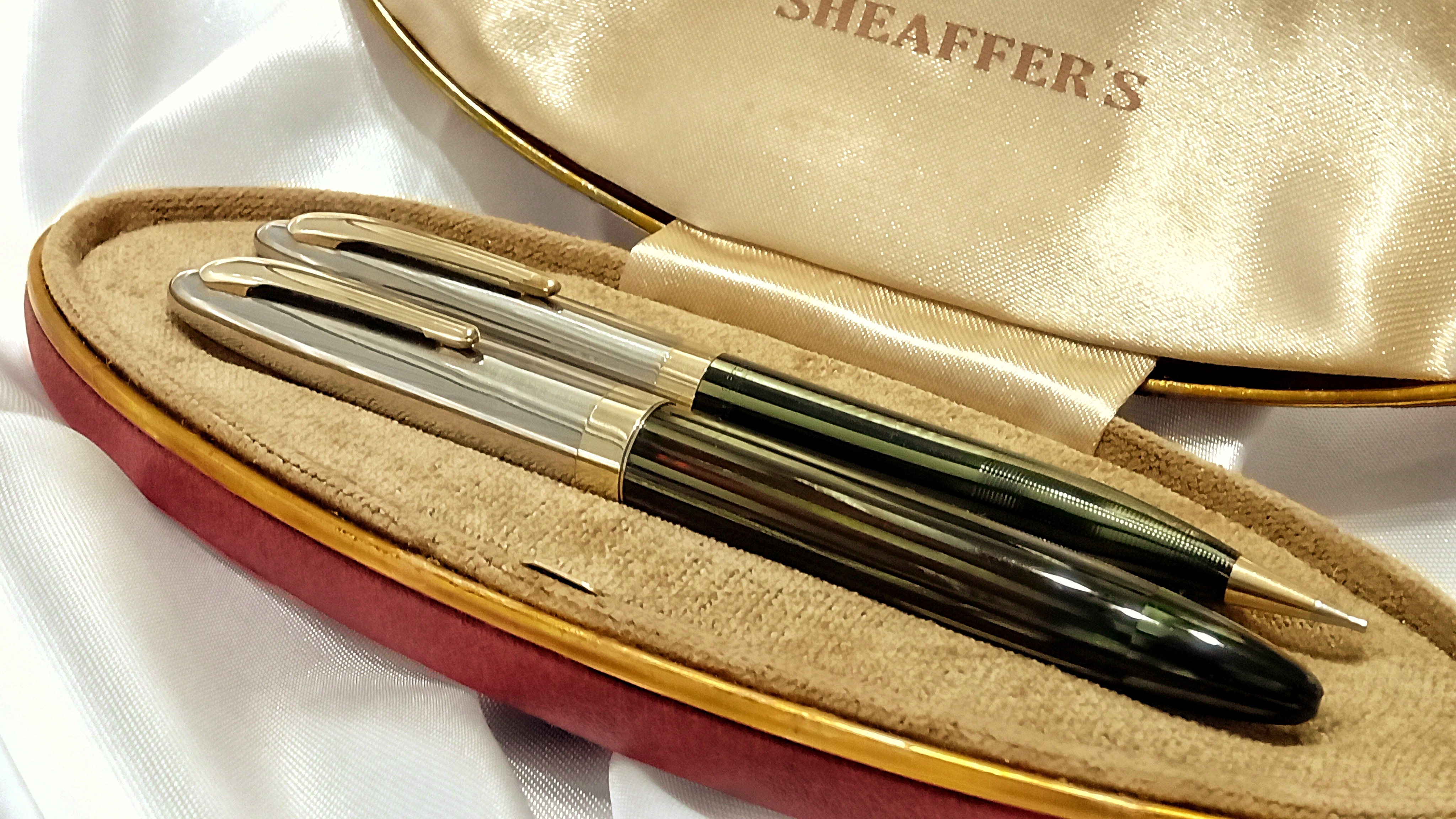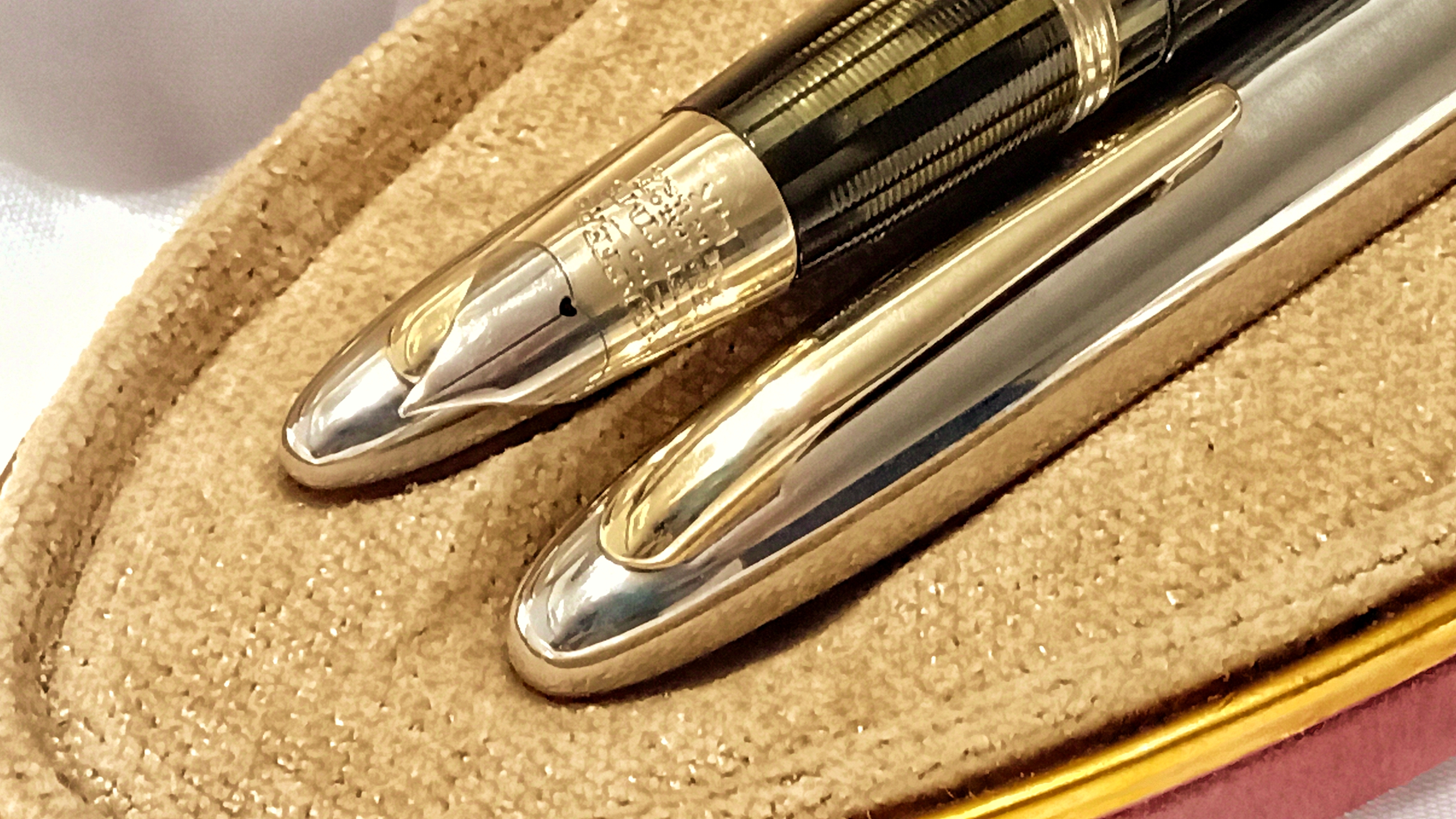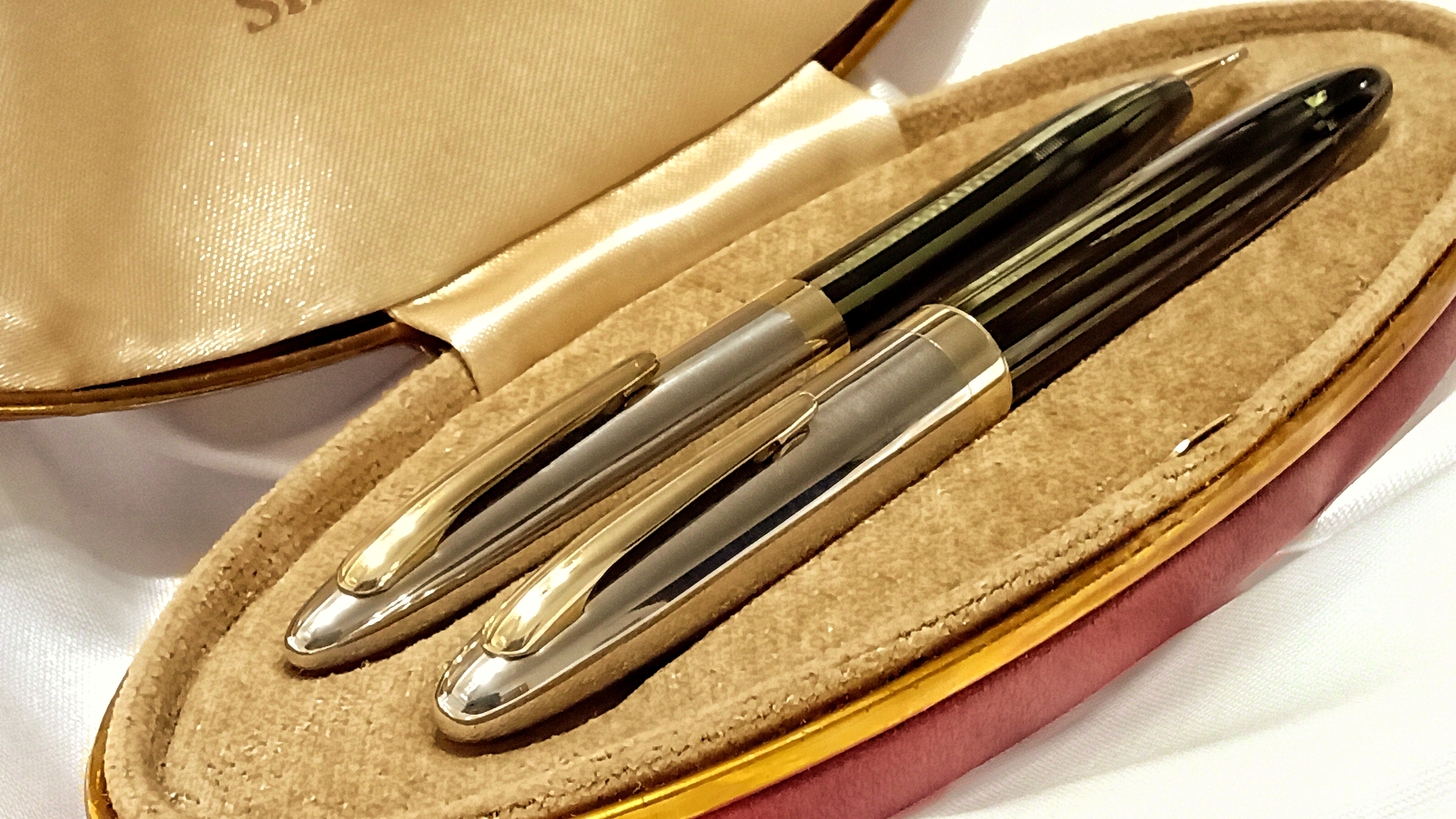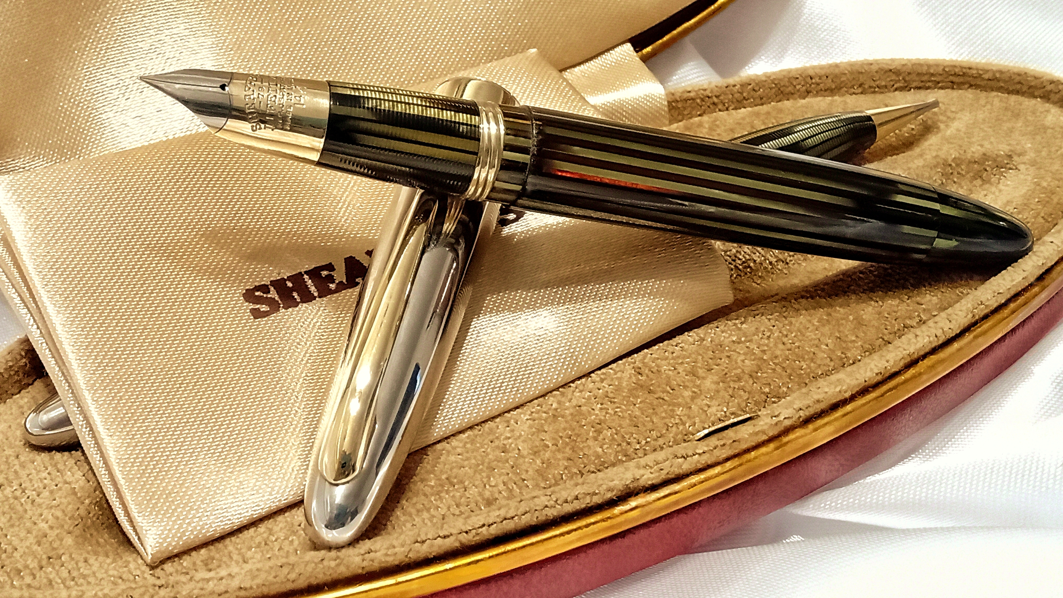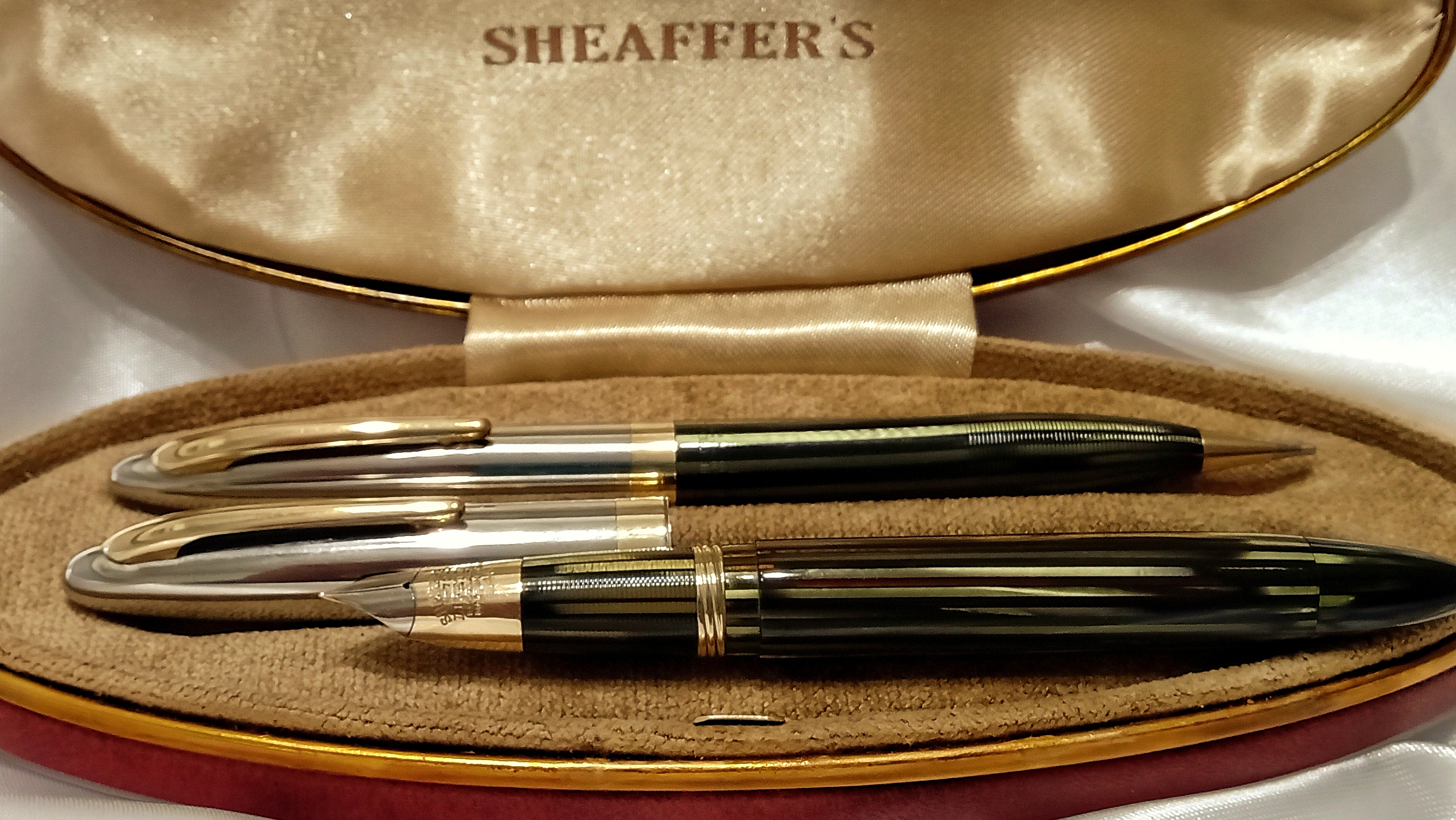 Vi lascio qui questo video del test di caricamento e scrittura che vi dovevo, relativo a questo restauro che ho presentato qualche mese fa ( viewtopic.php?t=27833 ), e che riguardava questo bellissimo set di Sheaffer's Sentinel degli anni '40, prima generazione del sistema di ricarica Vacuum Filling, con pennino conico Lifetime bicolore.