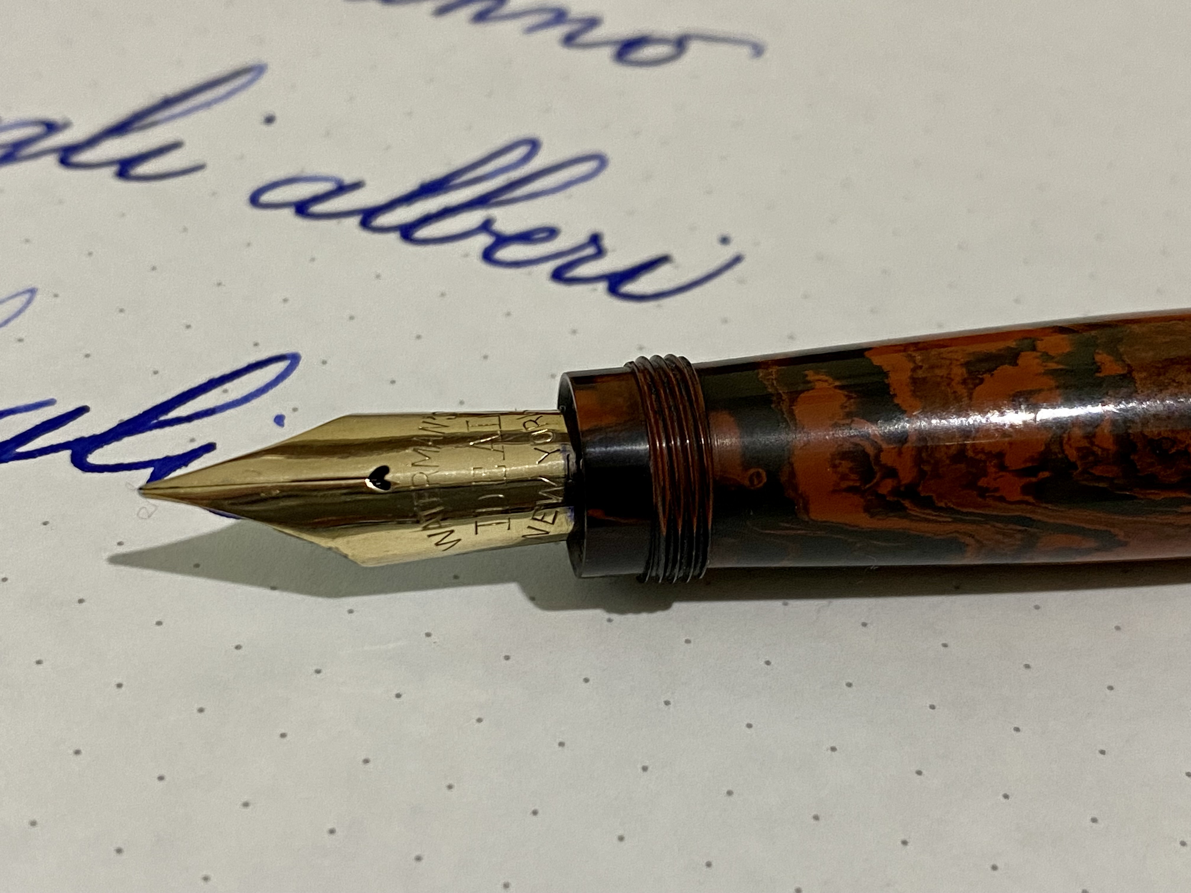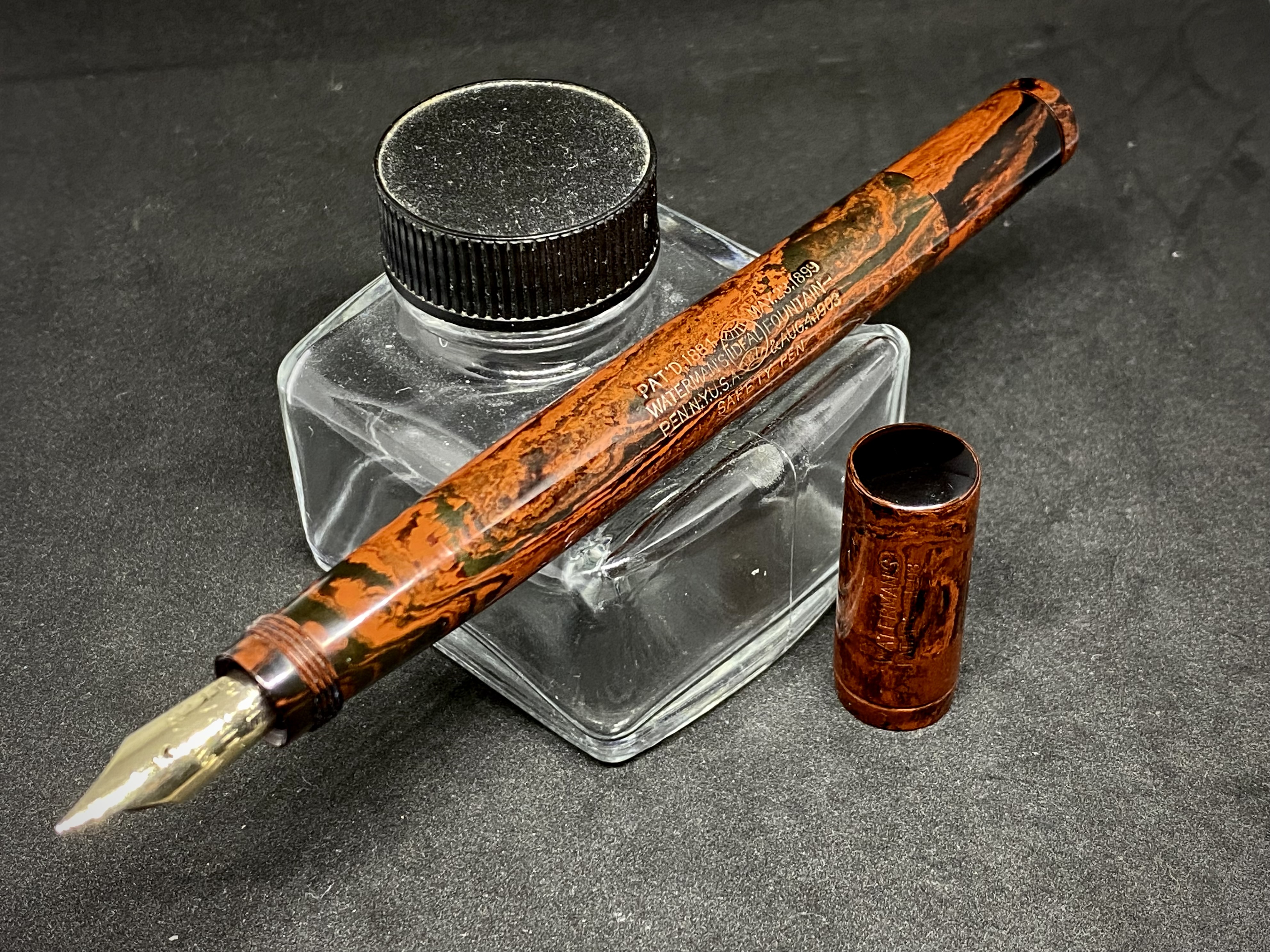 MOTTLED [1]: dal 1892 almeno (fonte Catalogo PCA) fino al 1923, sulle eyedropper e sulle safety (dalla loro introduzione nel 1908), ma non sulle lever filler (dalla loro introduzione nel 1914).