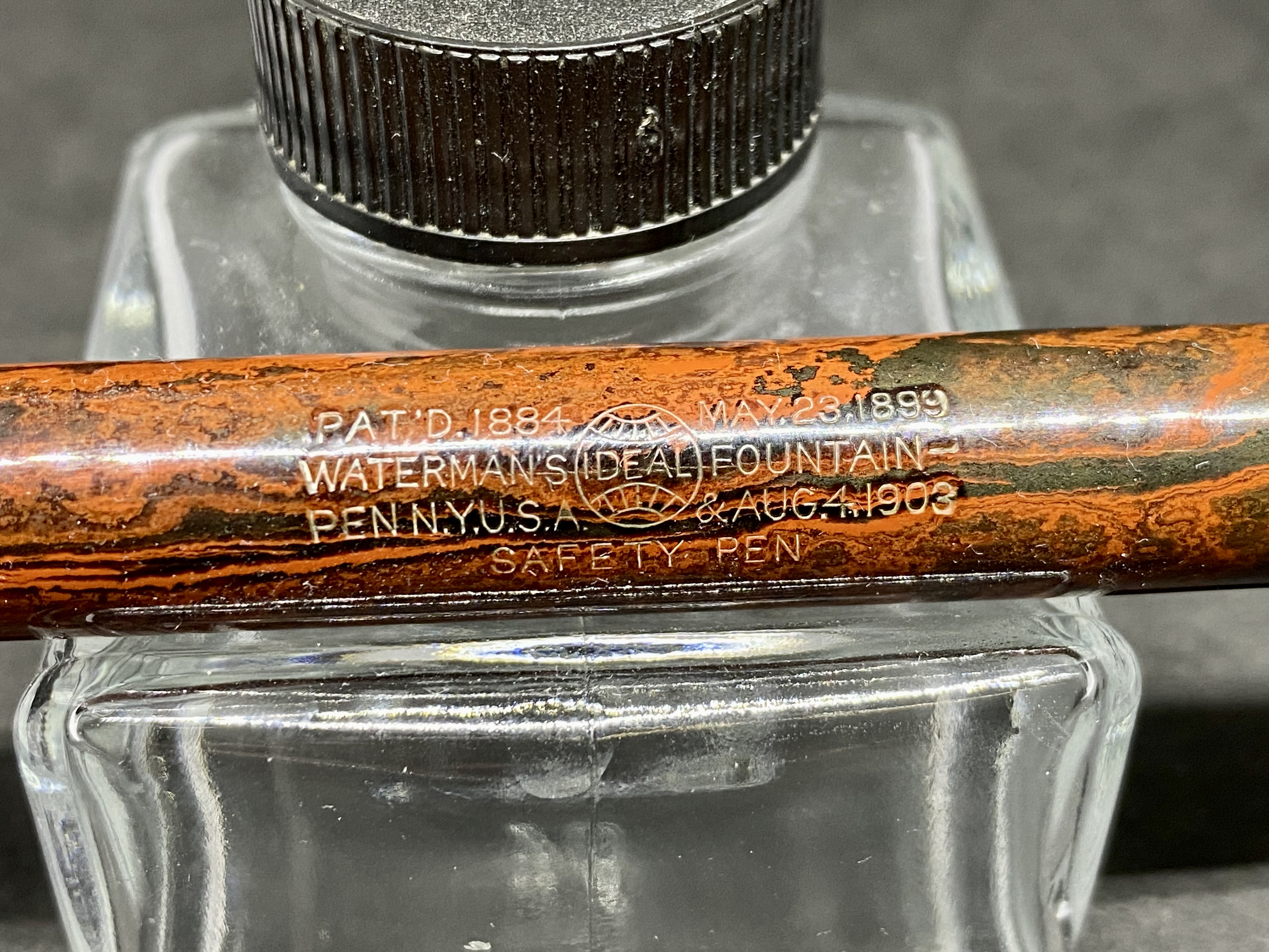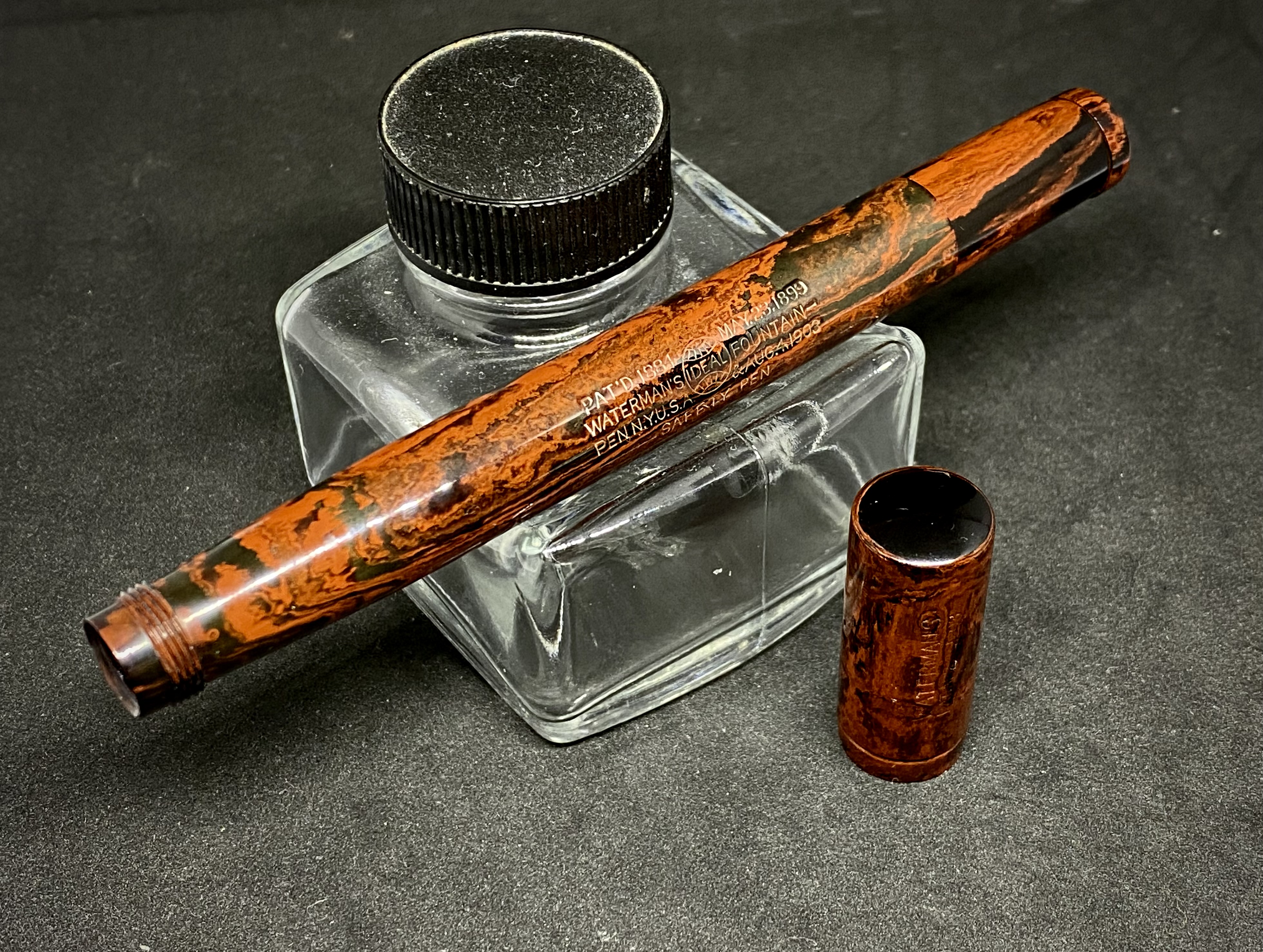 Waterman 15S (Safety pen) in ebanite Mottled Red prodotta tra il 1912, anno in cui venne dismesso il nottolino di estrazione filettato, e il 1917, anno in cui si introdusse il nuovo sistema di numerazione.