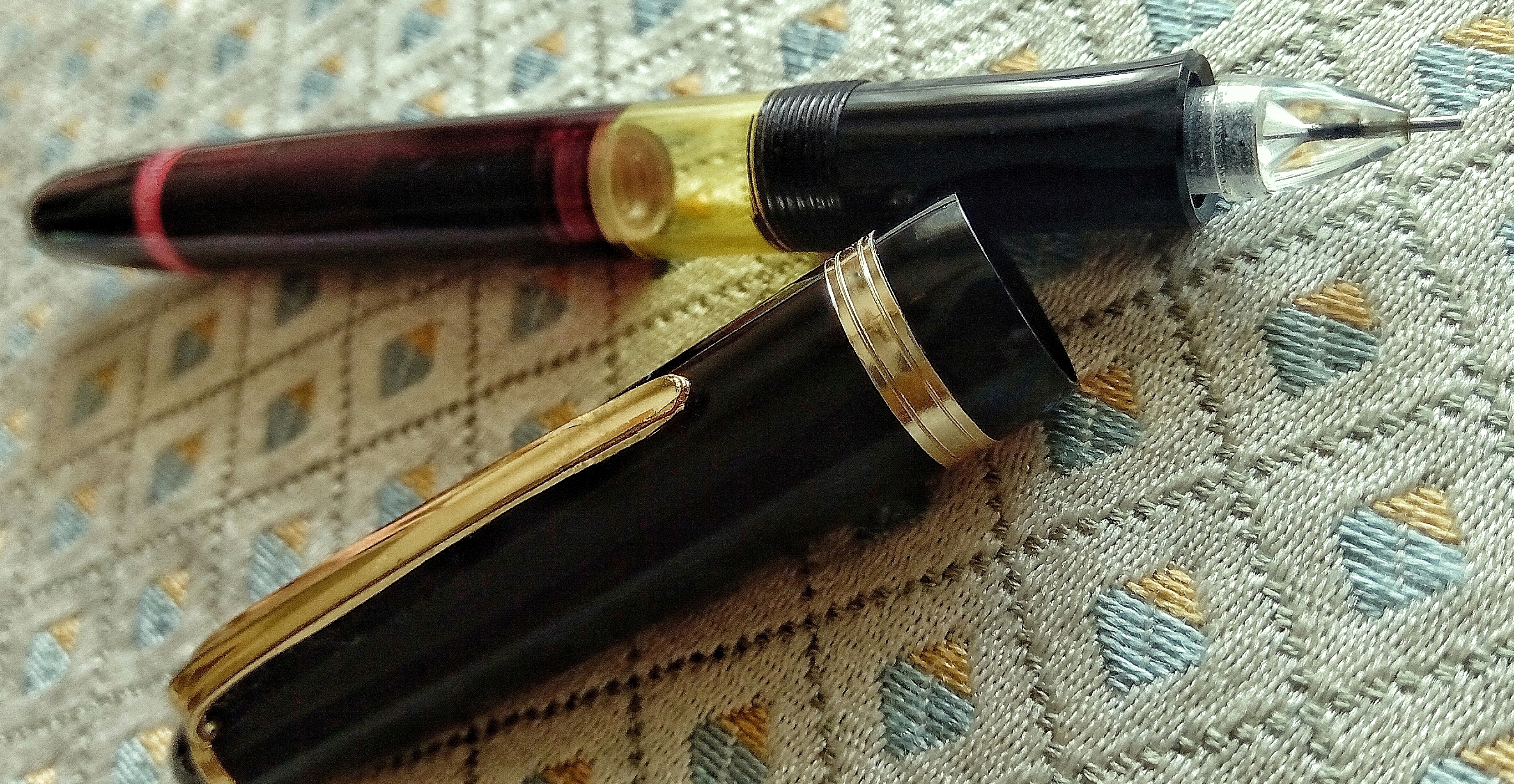 Qui abbiamo il caso di una penna capilografica, una degli ultimi Tintenkuli, di provenienza tedesca e degli anni 50/60, secondo alcuni fabbricata totalmente o parzialmente in Argentina, secondo altri solo assemblata, con punta trasparente, punta in lega di tungsteno, pistone di carica, cappuccio in celluloide nera con anello dorato e clip placcata oro, corpo trasparente colorato nero con finestra del livello dell'inchiostro non colorato, anello di caricamento in celluloide rossa, manopola di caricamento e cappuccio cieco in celluloide nera, un gioiello di ingegneria che funziona come quando è partito la fabbrica...!!!