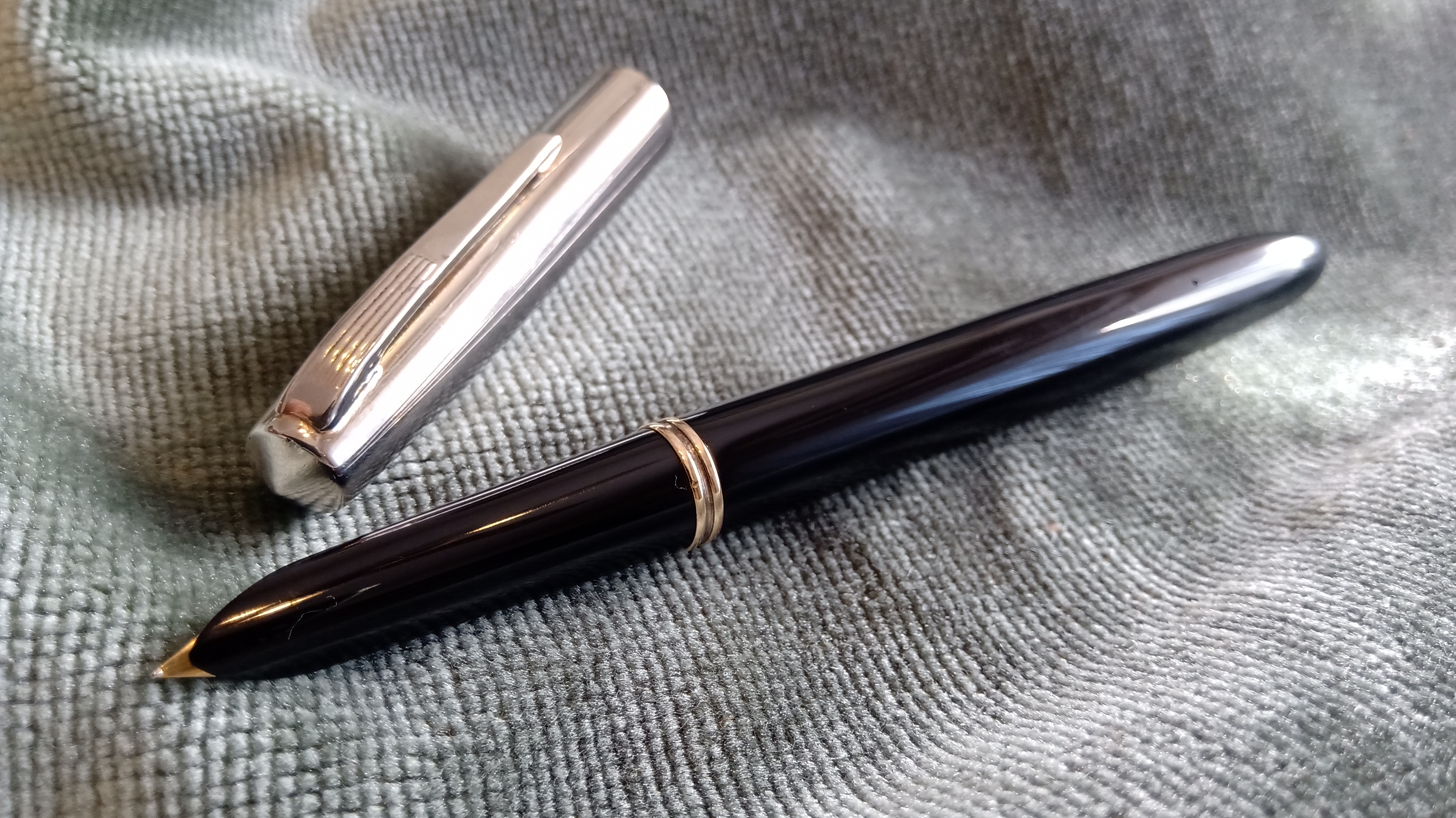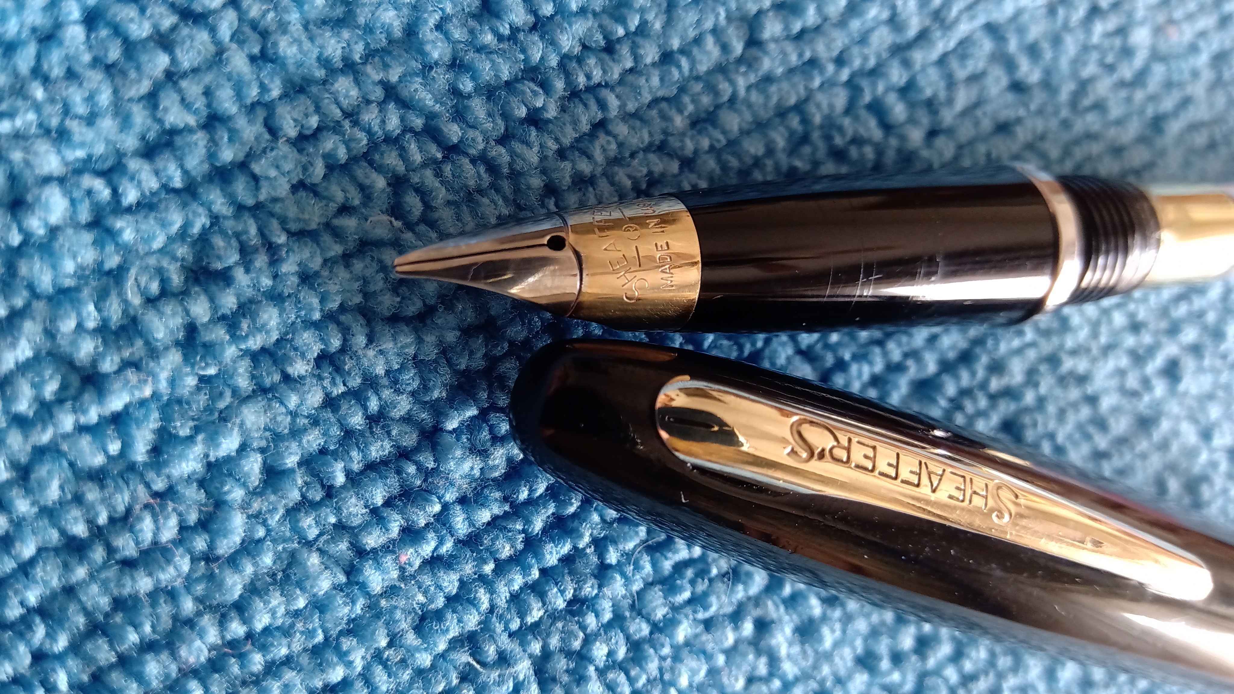 Si tratta di una Sheaffer's degli anni 60/70 quasi interamente prodotta in Argentina, e dico Sheaffer's e non Sheaffer, Imperial 777, Stylist Lifetime, con corpo, cappuccio e clip placcati oro incisi, con sistema di conversione aerometrica originale, impugnatura in acrilico nera, e un magnifico pennino corto conico originale, in argento palladio prodotto negli Stati Uniti, che ad un certo punto gli ho presentato nel forum e che scrive meravigliosamente...!!!