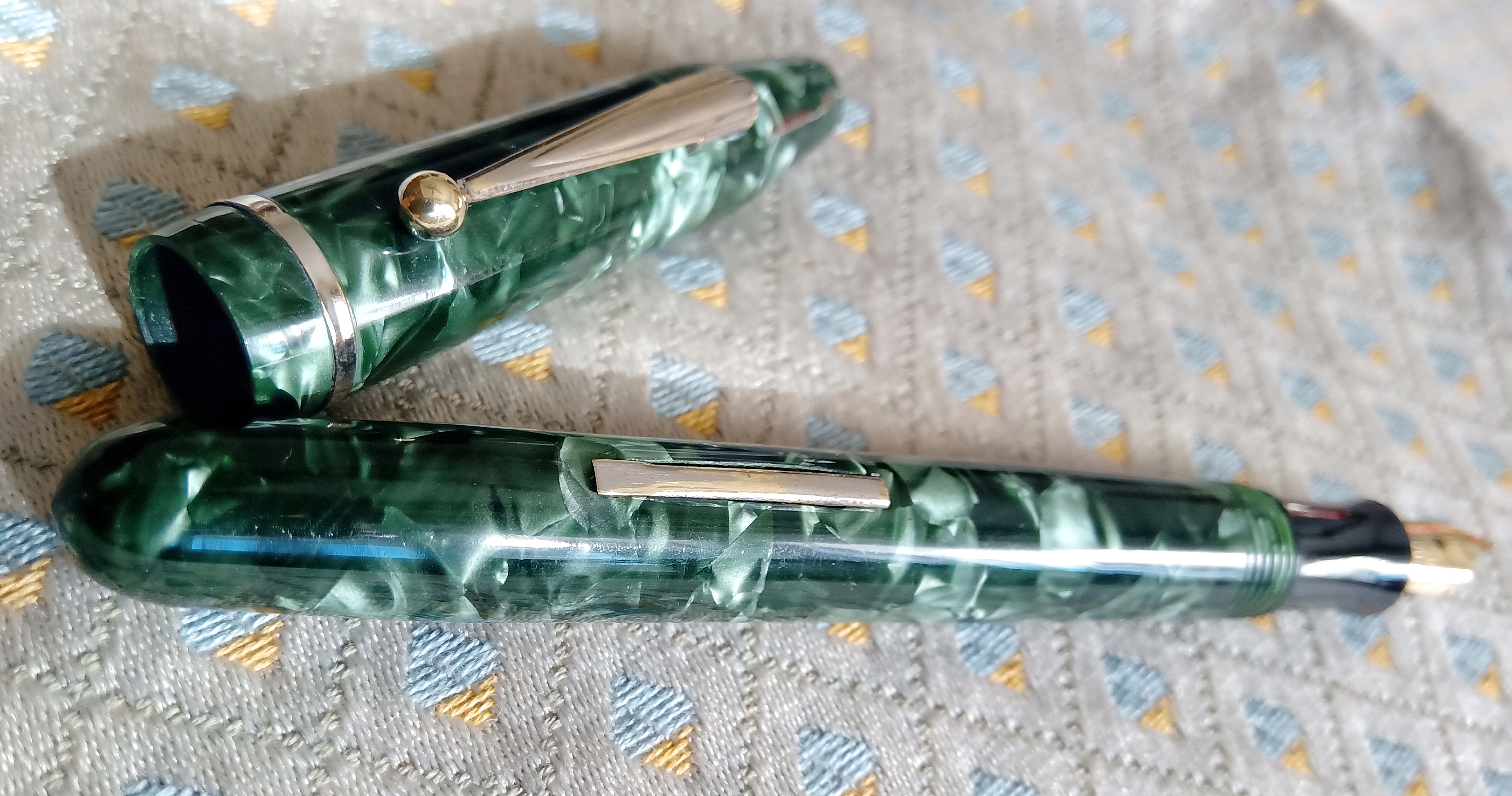 Altro marchio made in Argentina, Federal..., anni 40, con sistema di caricamento a leva, pennino aperto Signature non originale placcato oro, impugnatura in ebanite, corpo e cappuccio in celluloide laminata argento perlescente marmorizzato e un bellissimo verde bosco, levetta, clip e ampia fascia sul cappuccio con incisione dell'orologiaio placcata in oro...