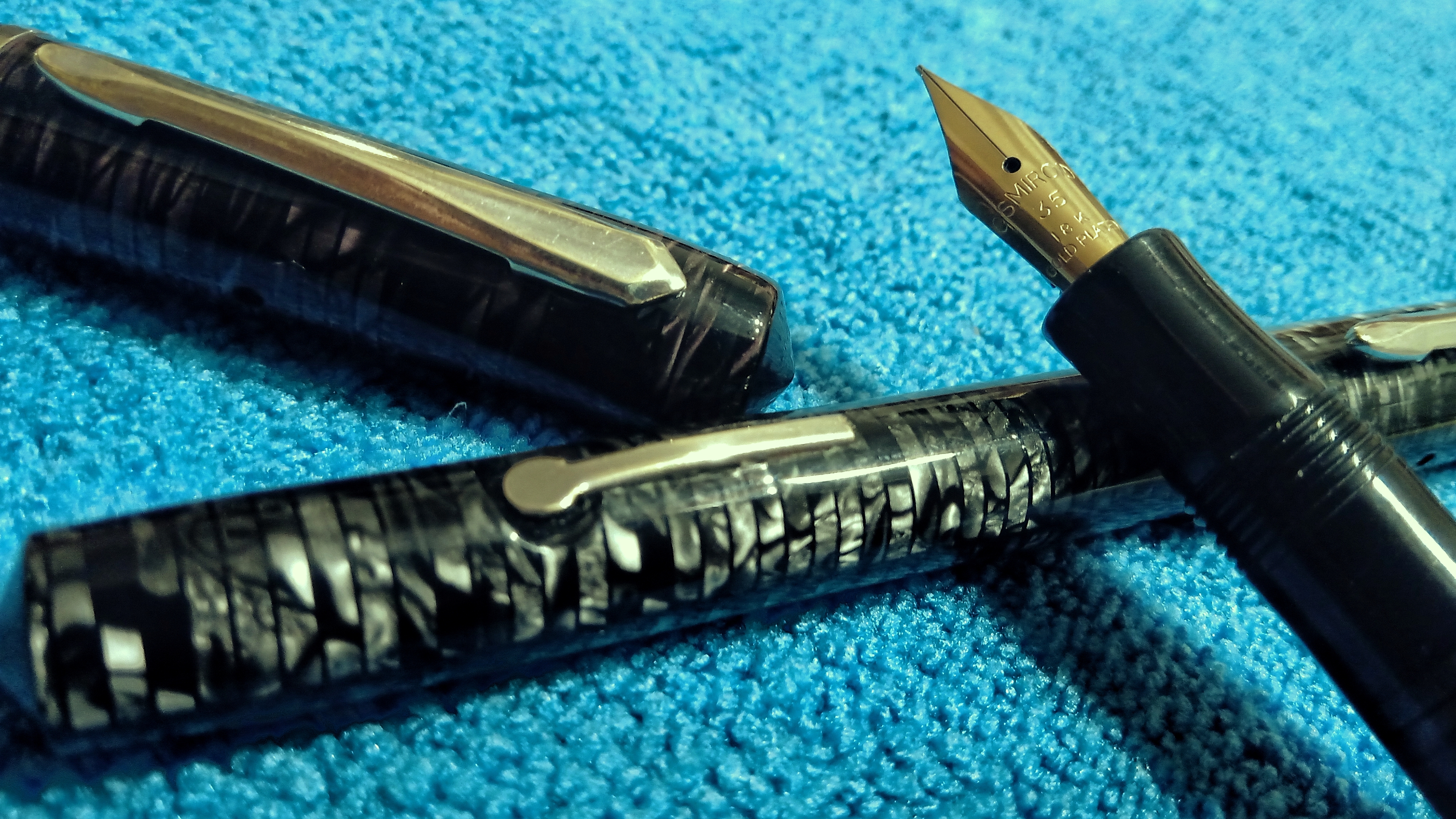 Più un caso dove non si conosce la marca ma appare l'impronta d'origine... Una penna stilografica degli anni 50/60 circa, con impugnatura in ebanite nera e corpo in galatite grigia, sistema di caricamento aerometrico, clip e cappuccio cromati, ed un non originale pennino ricoperto in oro con marchio Hunt Co. prodotto negli U.S.A....