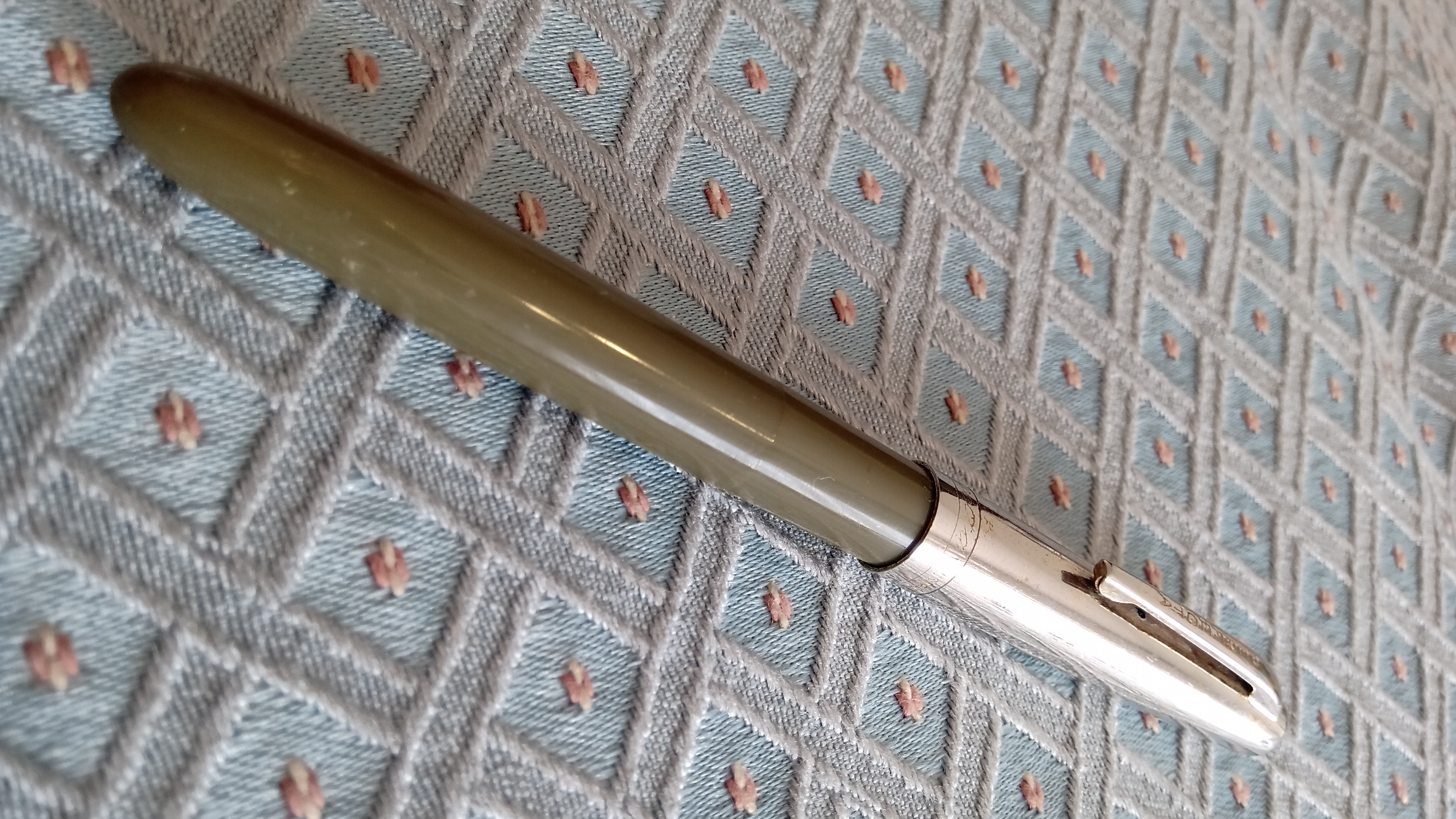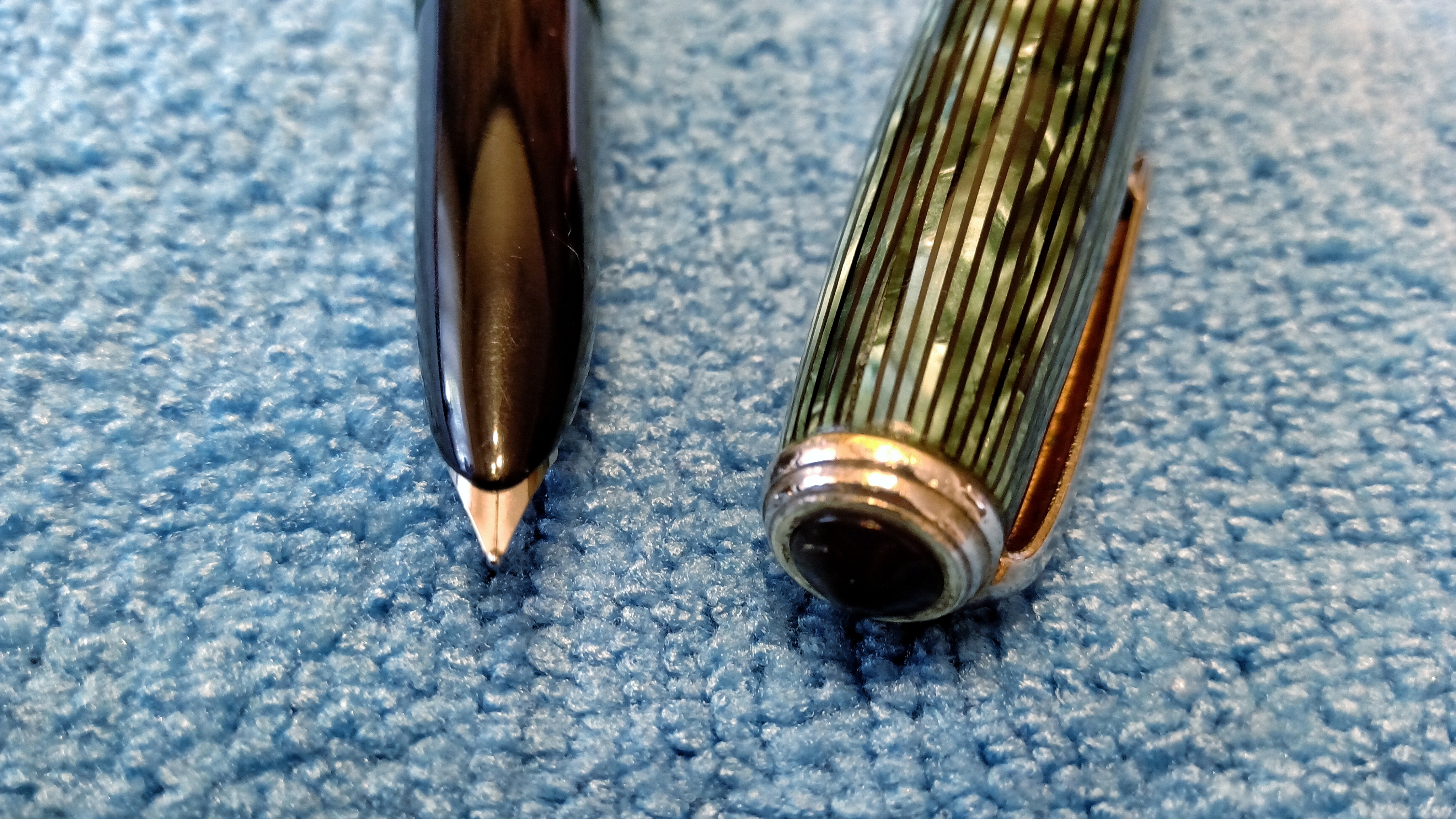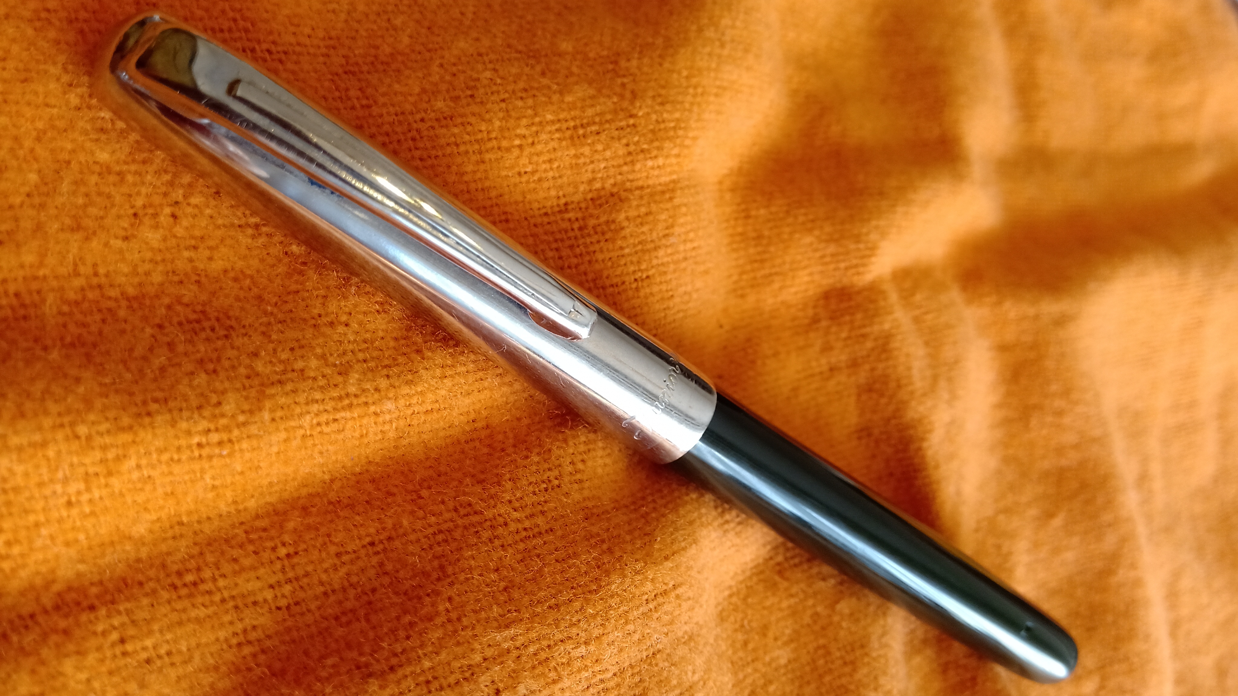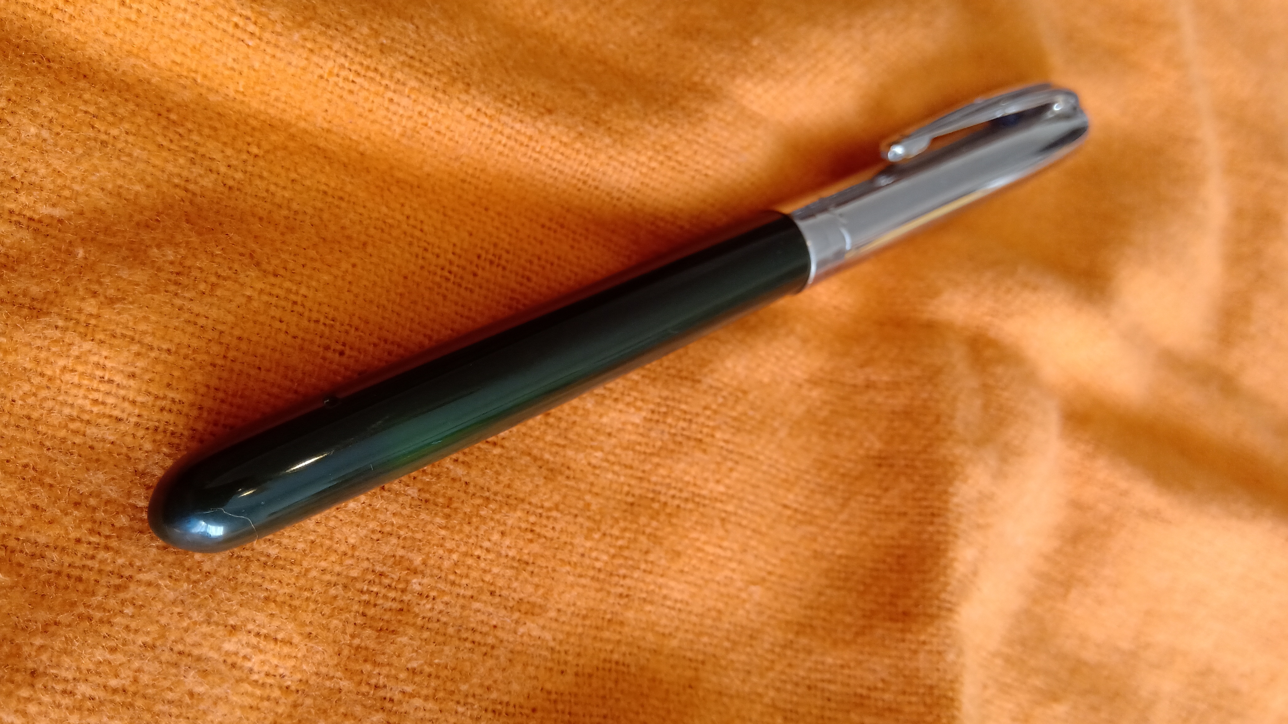 Quest'altra marca Junior's degli anni 50 con impugnatura in ebanite nera e corpo in galatite verde, sistema di caricamento aerometrico, clip e cappuccio cromati e pennino a vista non originale marca Hunt Co. dorato prodotto negli U.S.A., una bella piccola penna stilografica...