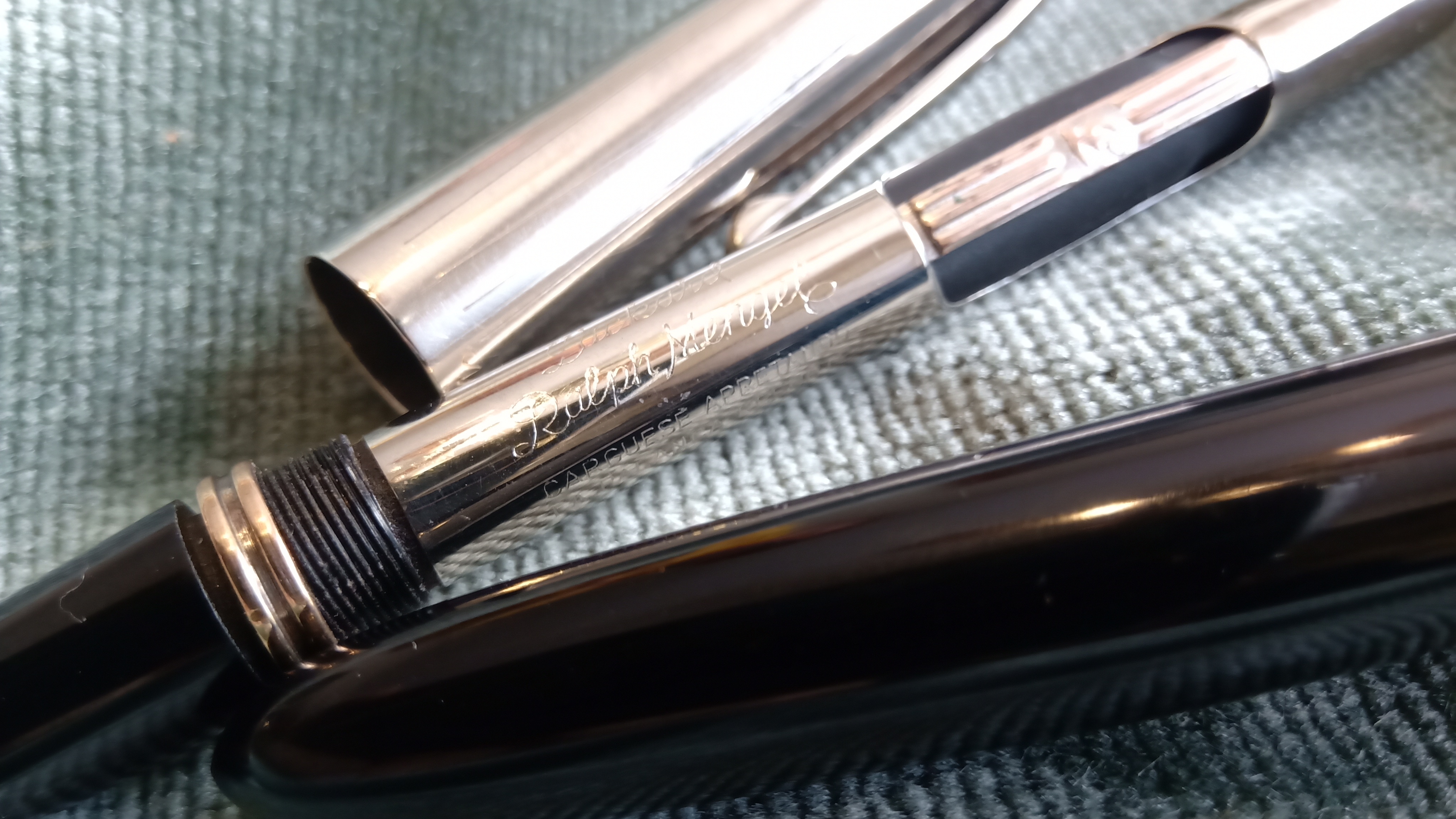 Ora è la volta di una bellissima penna stilografica Packard Ralph Mengel modello Wembley 200 anni 50/60 con sistema di caricamento aerometrico, impugnatura in ebanite nera e corpo in galatite nera, cappuccio e clip incisi e dorati, pennino ricoperto Hunt Co. placcato in oro e prodotto negli Stati Uniti....