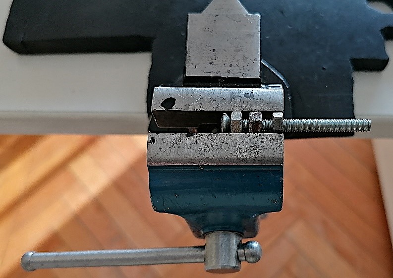 ho inserito una vite con filettatura del diametro di 3.8 mm orizzontalmente su un morsetto (v. foto), bloccando insieme alla vite anche un capo del filo d’acciaio. Con l’uso della mano (ovviamente ricoperta da un guanto da lavoro per evitare tagli e per poter ottenere maggior forza e aderenza) ho avvolto strettamente il filo sulla vite, utilizzando la filettatura della stessa, per creare spire strette e più regolari possibili. (sul web è comunque possibile trovare una costruzione della molla meno “amanuense”, utilizzando un avvitatore a pile per avvolgere il filo d’acciaio sulla filettatura della vite).