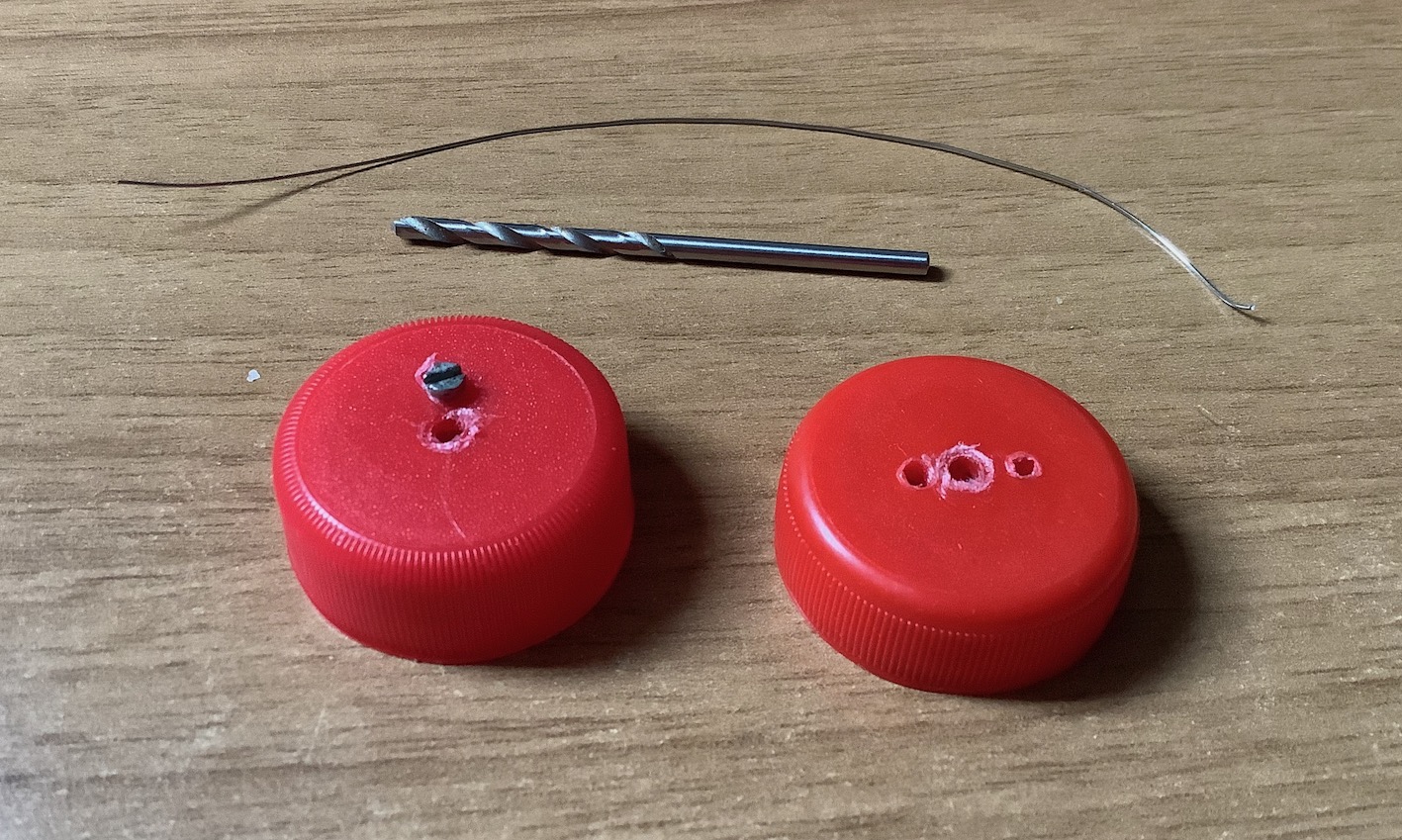 Due semplici tappi di bottiglia in plastica , entrambi con un foro centrale di diametro pari al diametro della molla che voglio ottenere; su un tappo fisso una vite piccina che abbia una testa relativamente alta e piatta, sul secondo tappo , a lato del foro centrale faccio un altro piccolo foro nel quale andrà infilato una parte del filo di acciaio che dovrò girare a spirale.
