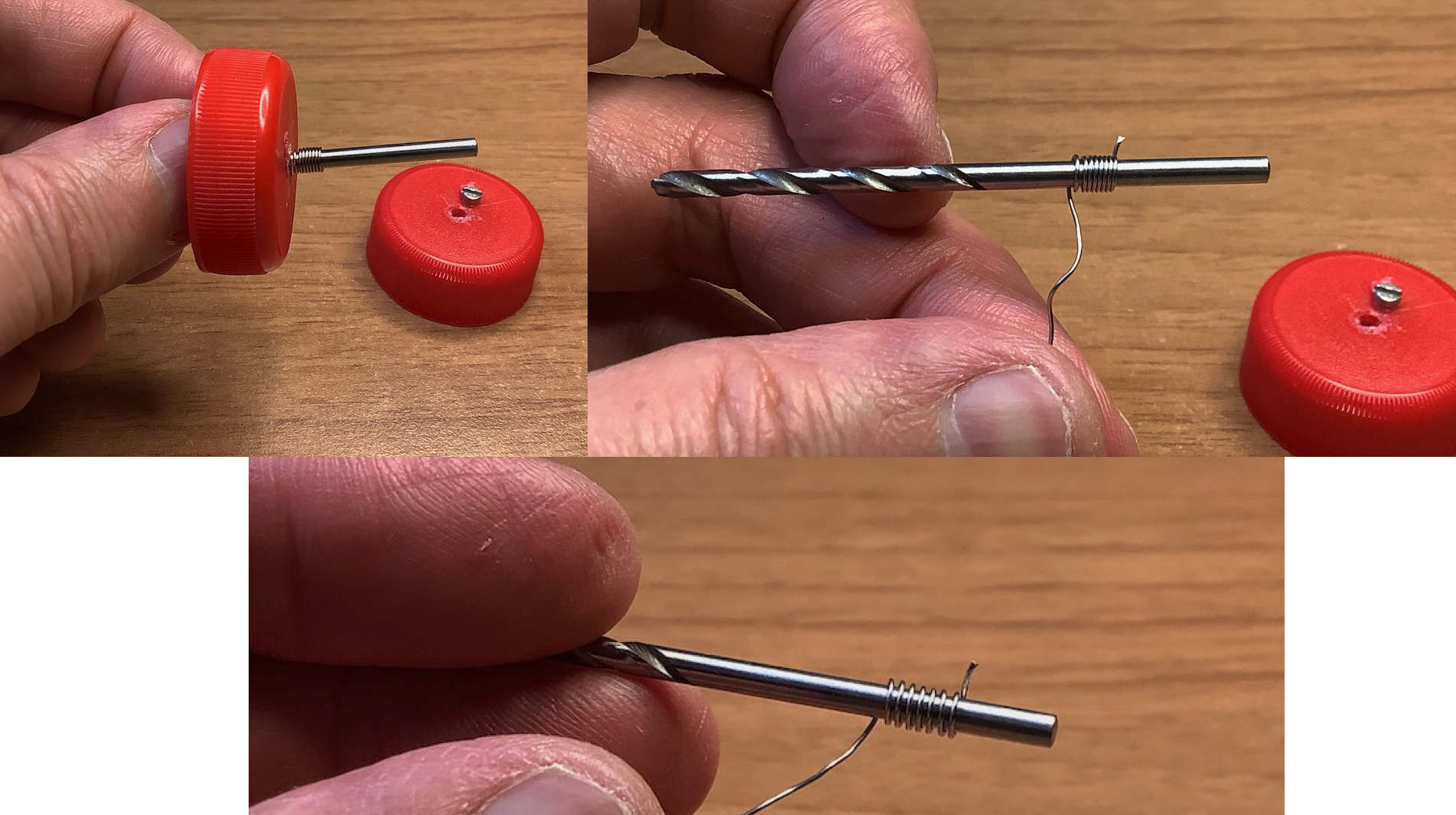 Poi prendo una punta da trapano o qualcosa di simile con il diametro della molla , la infilo nel foro centrale del tappo, infilo il filo di acciaio nel piccolo foro accanto e con il pollice e l'indice tengo fermo il filo all'asta della punta da trapano (1). Faccio a mano due o tre giri del filo di acciaio (2) e poi inserisco il secondo tappo (quello con la vite) sulla punta da trapano e inizio a girare il tappo con fissata la vite , tenero leggermente premuto verso l'altro tappo (3). In questo modo la vite forza il filo di acciaio ad arrotolarsi sulla punta del trapano con spire belle serrate ed uniformi (bisogna comunque prenderci un poco la mano le prime volte) e poi fine del filo e fine del gioco (4).
