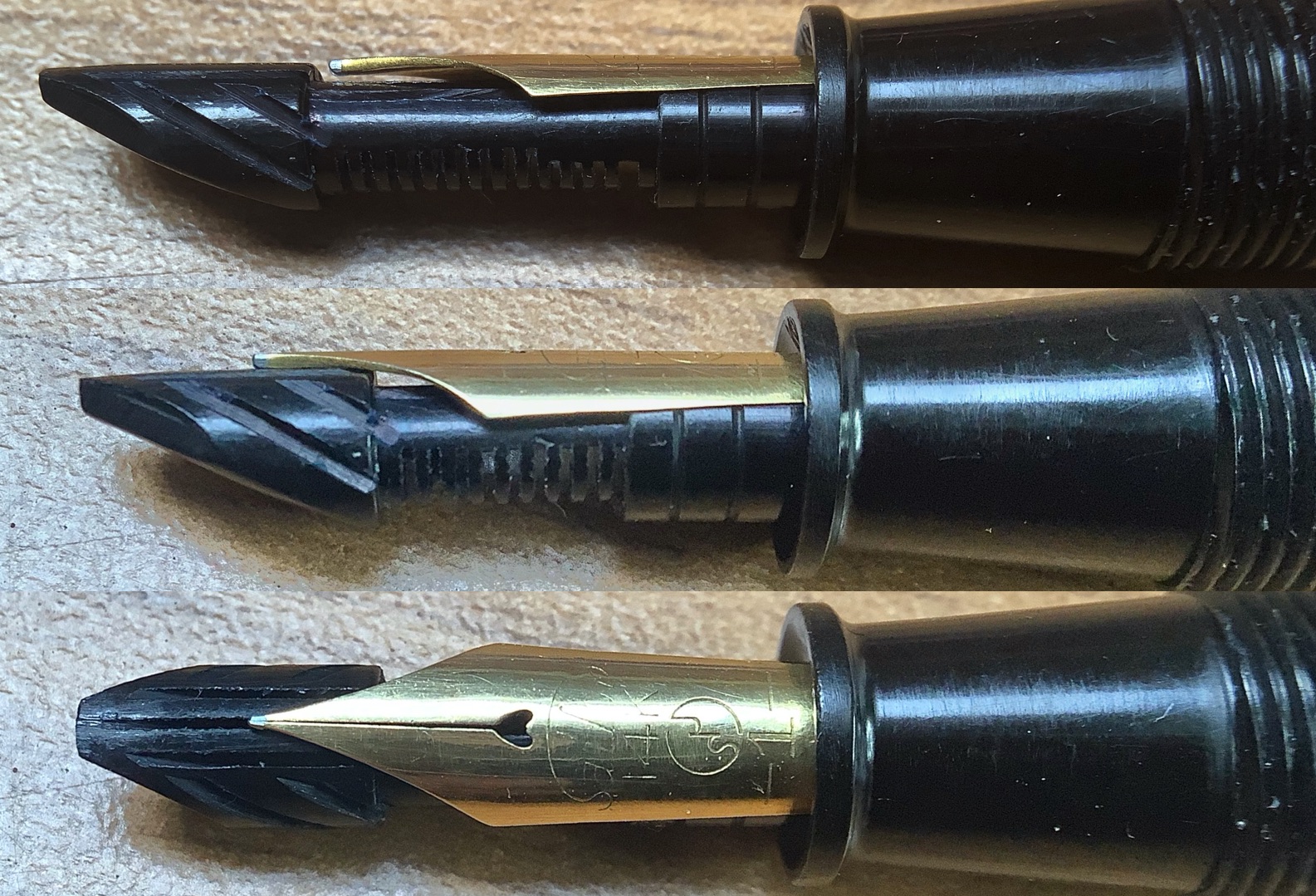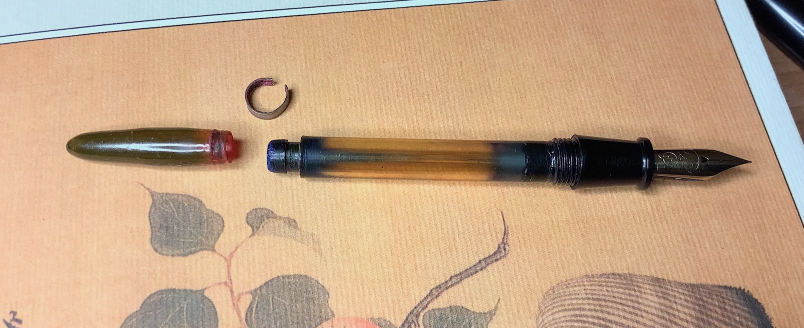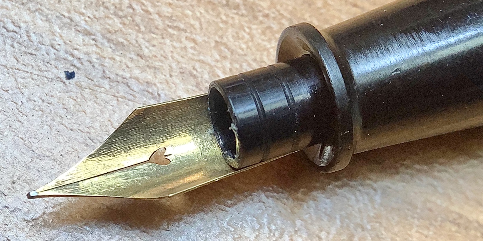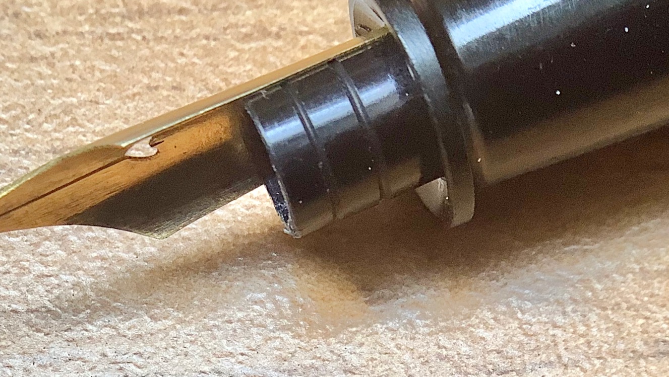 Effettivamente qualcosa di strano è saltato fuori; in questa penna l'assemblaggio e l'accoppiamento del pennino all'alimentare è eseguito in modo che trovo alquanto curioso. C'è da dire che è una penna di piccole dimensioni, idem il pennino, e quindi ben si presta a questo tipo di soluzione tecnica (pensiero mio eh...)