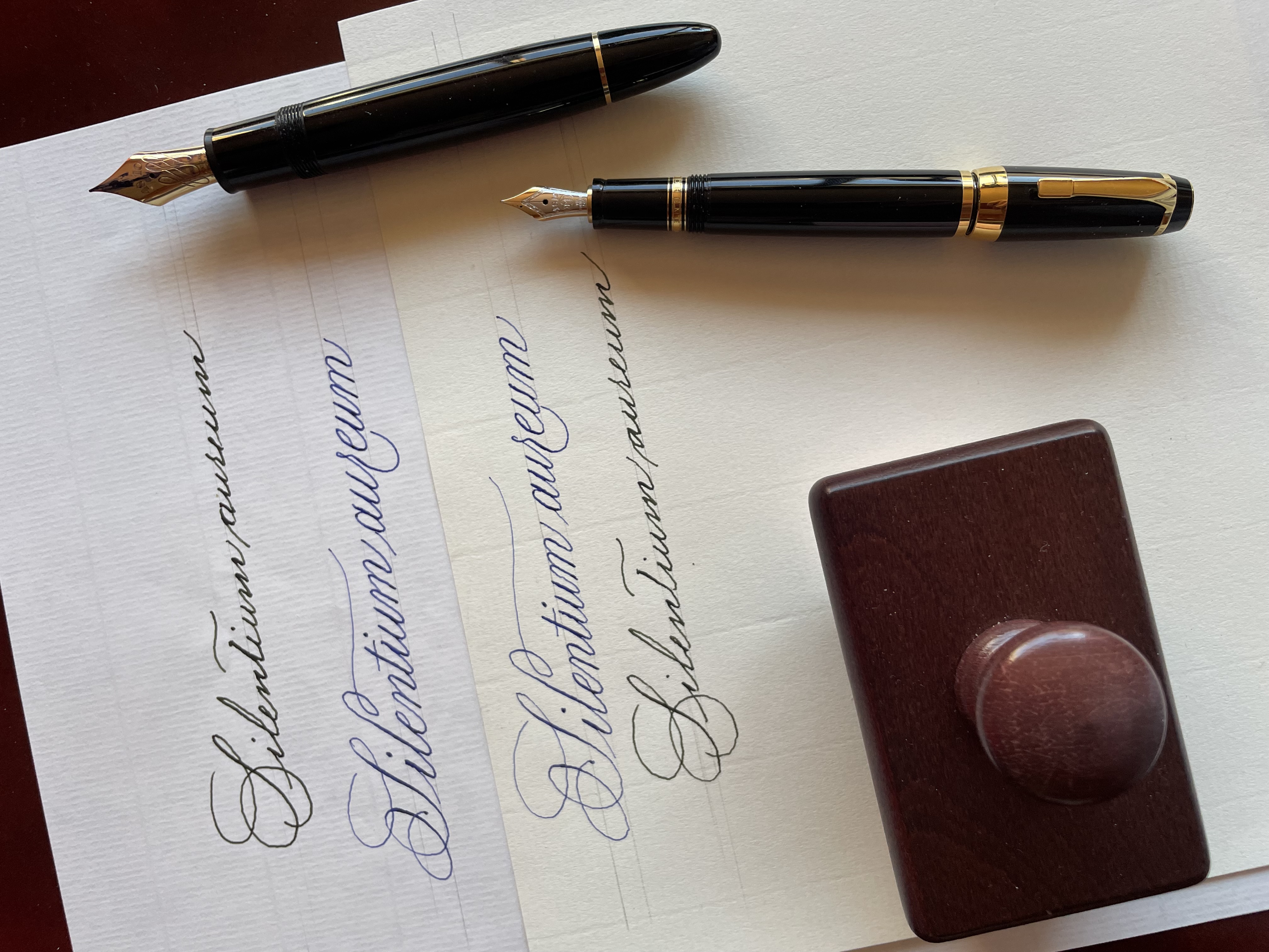 Dunque due sole penne, assai diverse tra loro, una Montblanc 149 con pennino flessibile extra-fine e una Bohème con pennino fine. Anche i due inchiostri sono differenti: il MB Blue Permanent - usato nella 149 Calligraphy - è un “nanopigmentato” di certa densità e magro, mentre la Bohème usa un classicissimo - e purtroppo dismesso da tempo - Racing Green, sempre di Montblanc.