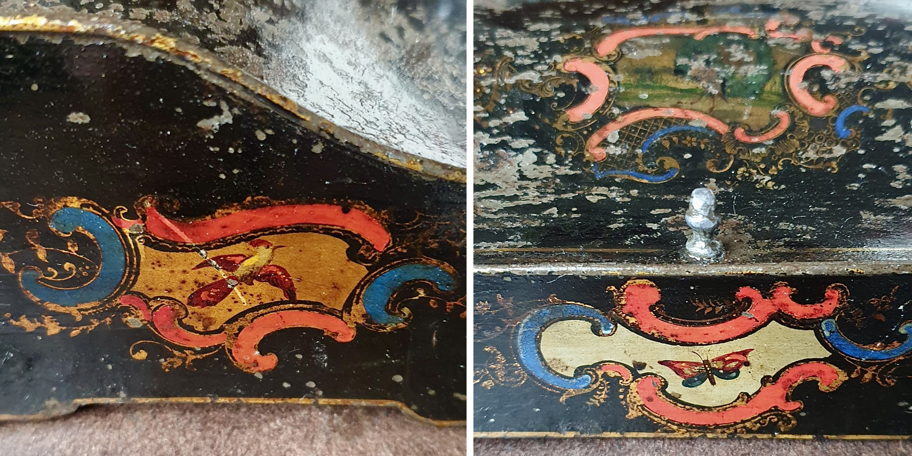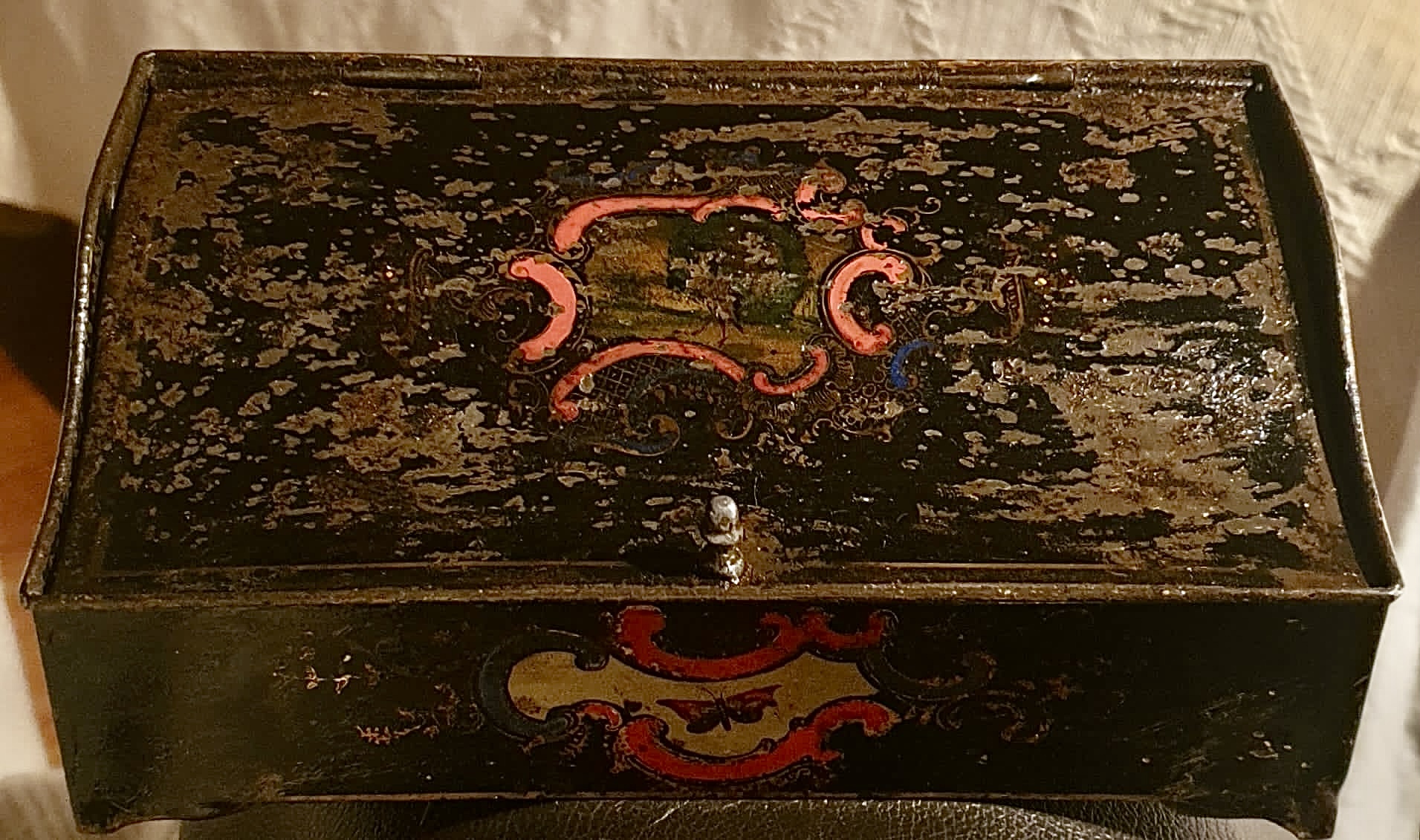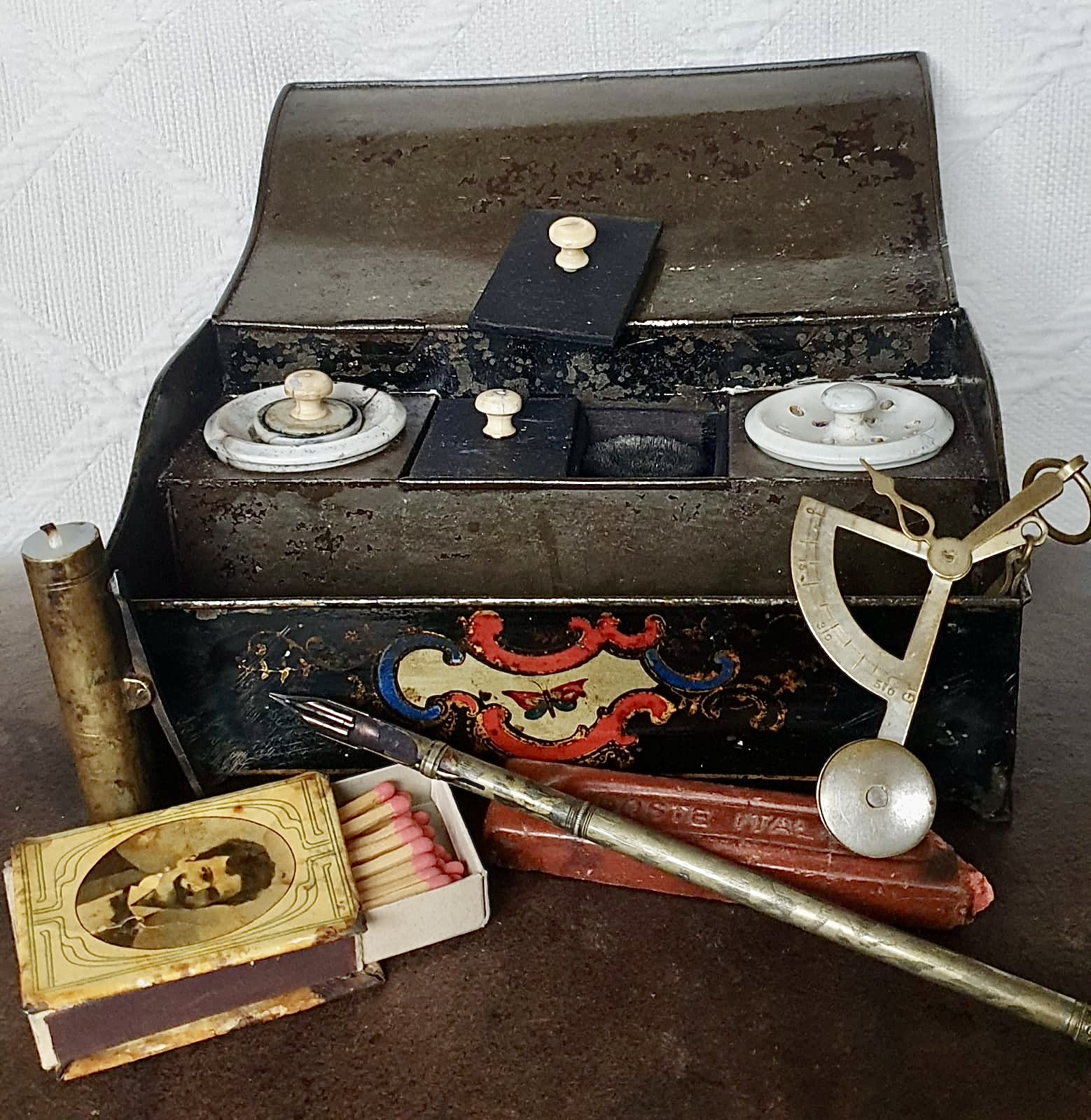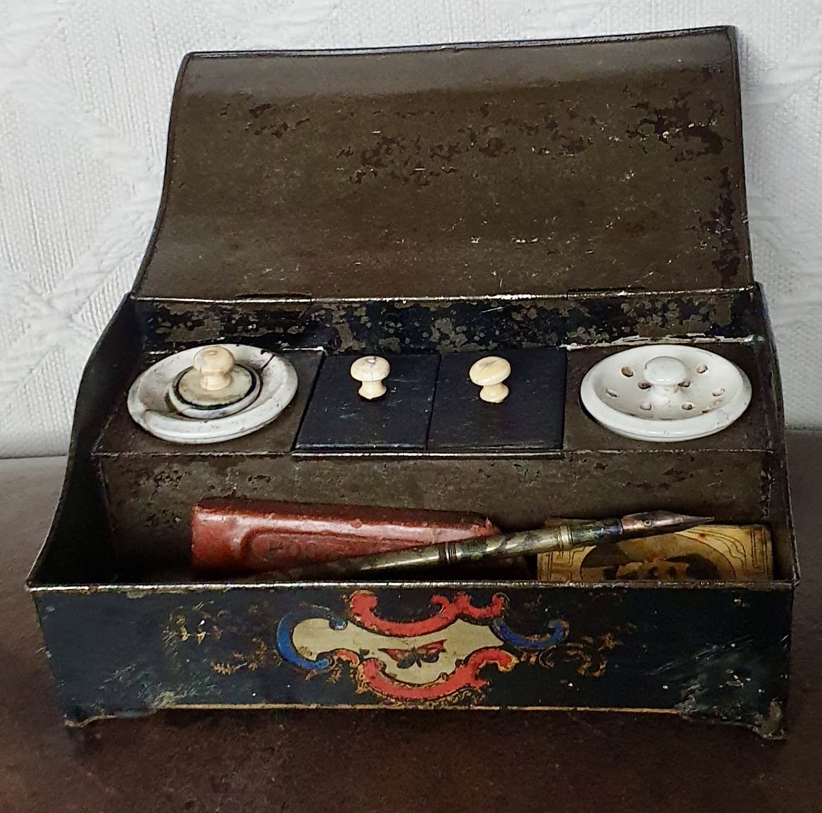 Piccolo tesoretto: scrittoio portatile in latta litografata e accessori
