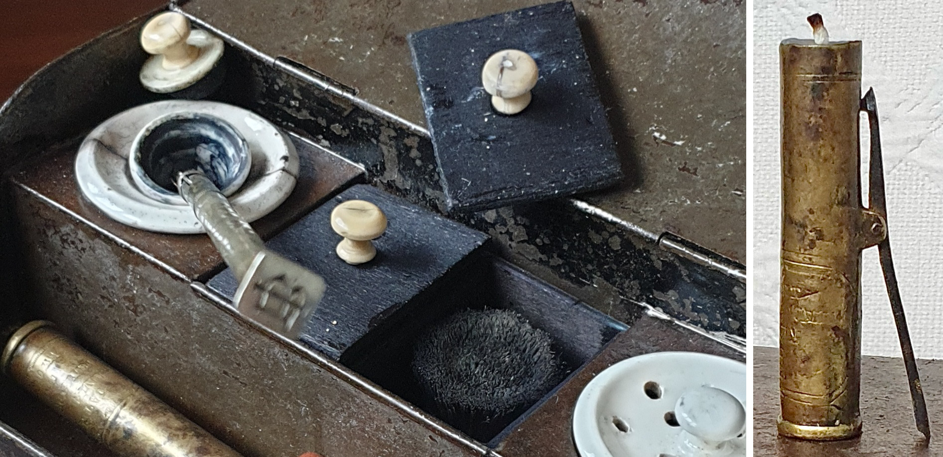 Si possono notare inoltre il porta fiammiferi in latta con rivestimento di carta, il porta candela (brevettato) per sciogliere la ceralacca, la cannuccia con sigillo e la staderina pesa lettera.