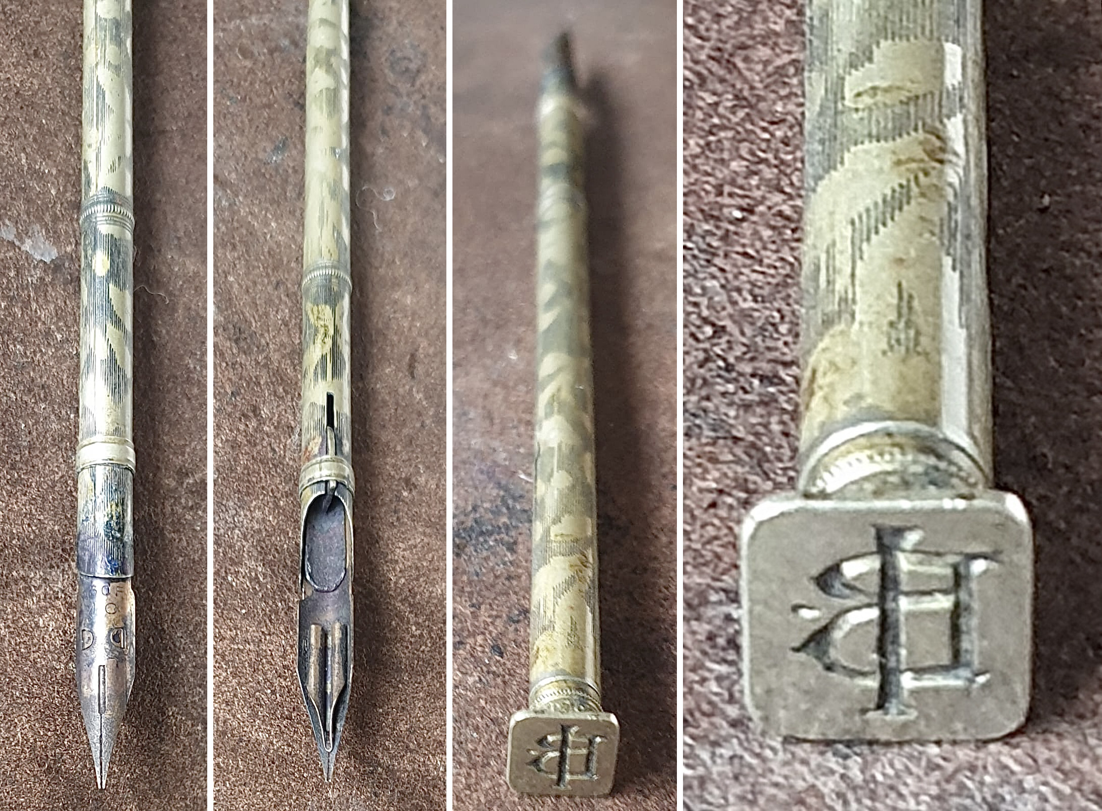 Una vera scatola del tempo passare attraverso le immagini di questo tesoretto così ben decorato... interessante sia la struttura sotto il pennino, credo utile per fare da serbatoio di inchiostro, che il porta candela veramente particolare
