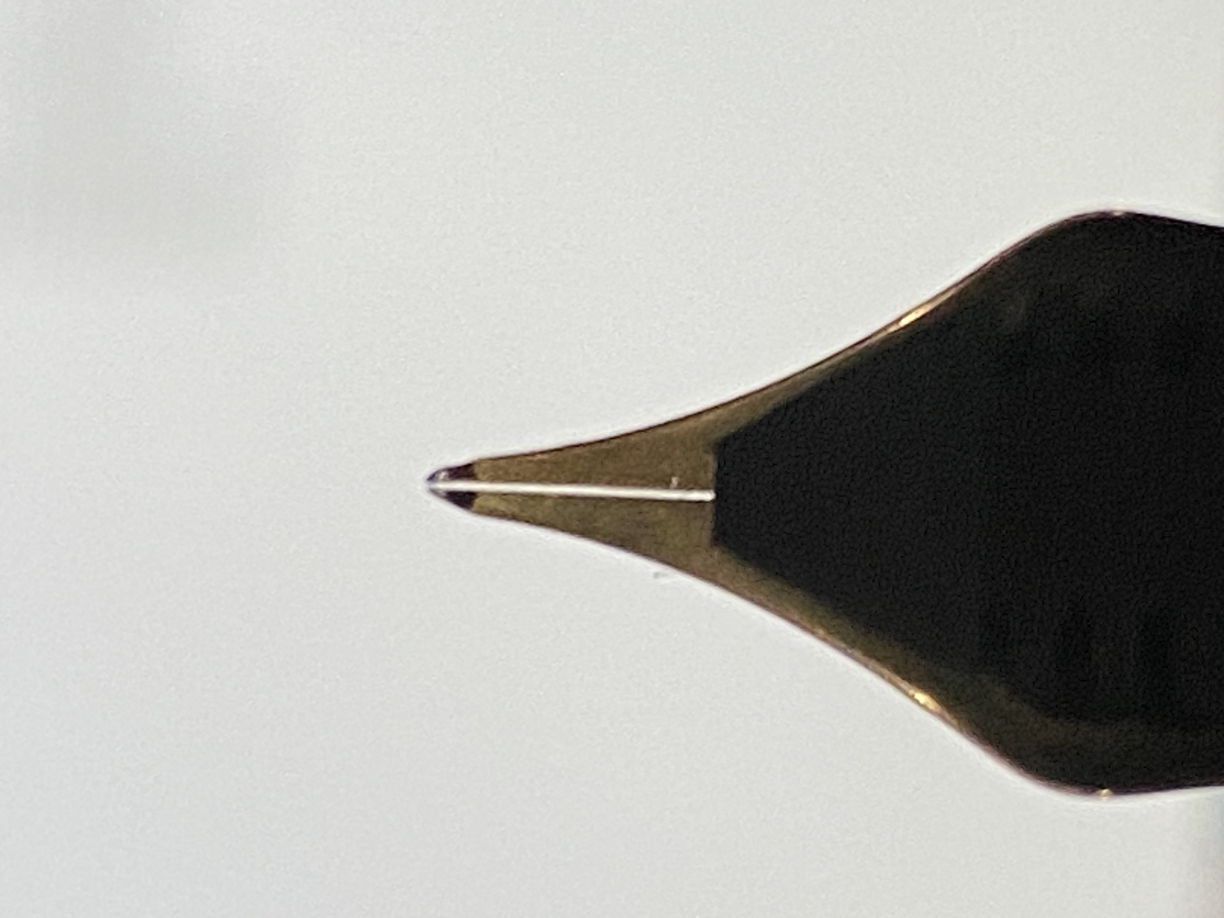 Il taglio non è simmetrico al 100% ma questo non dovrebbe essere un problema, non è poi così scentrato, il problema è sicuramente dovuto all'eccessivo spazio tra i rebbi, l'inchiostro in questo caso non riesce a tenere la tensione superficiale e "torna indietro " mentre scrivi, basta una microscopica pressione in più del normale e il pennino rimane a secco.