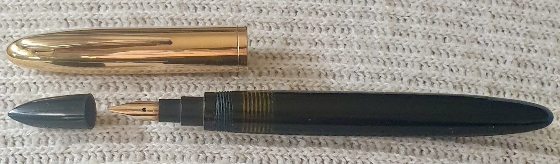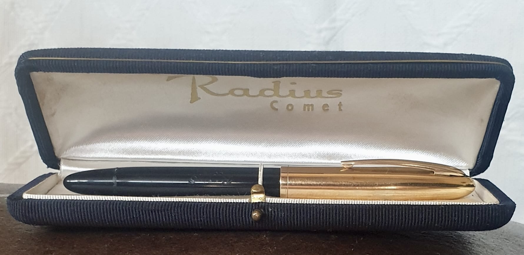 Interessante Radius Comet, pennino in oro, con ingegnoso sistema per variazione tratto calligrafico ruotando di 180° la cuffia del blocco pennino. Evidente ascendenza o discendenza Omas 361. Raffinato astuccio in legno, rivestito in cretonne, con sottile filo dorato lungo il perimetro del coperchio.