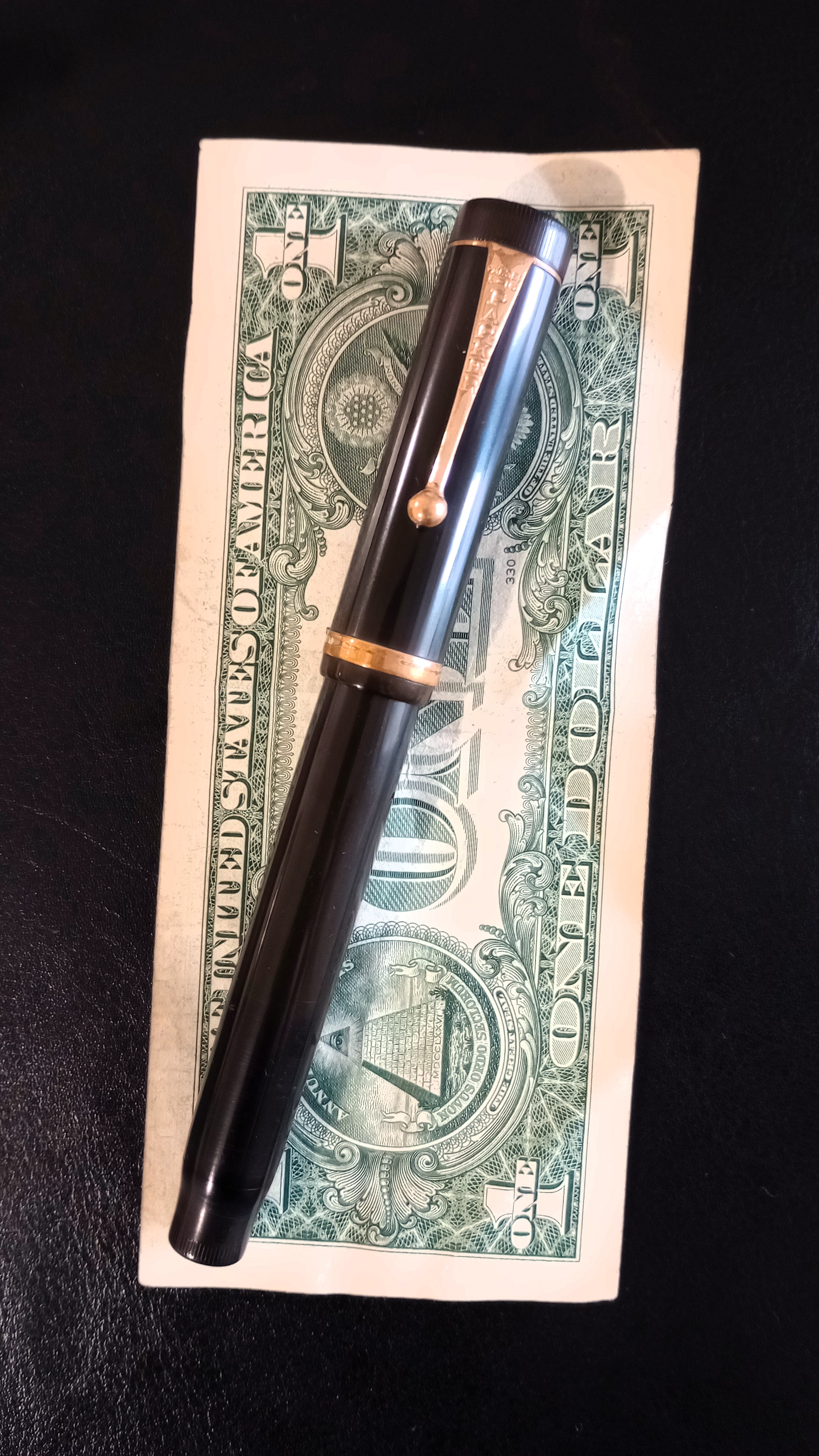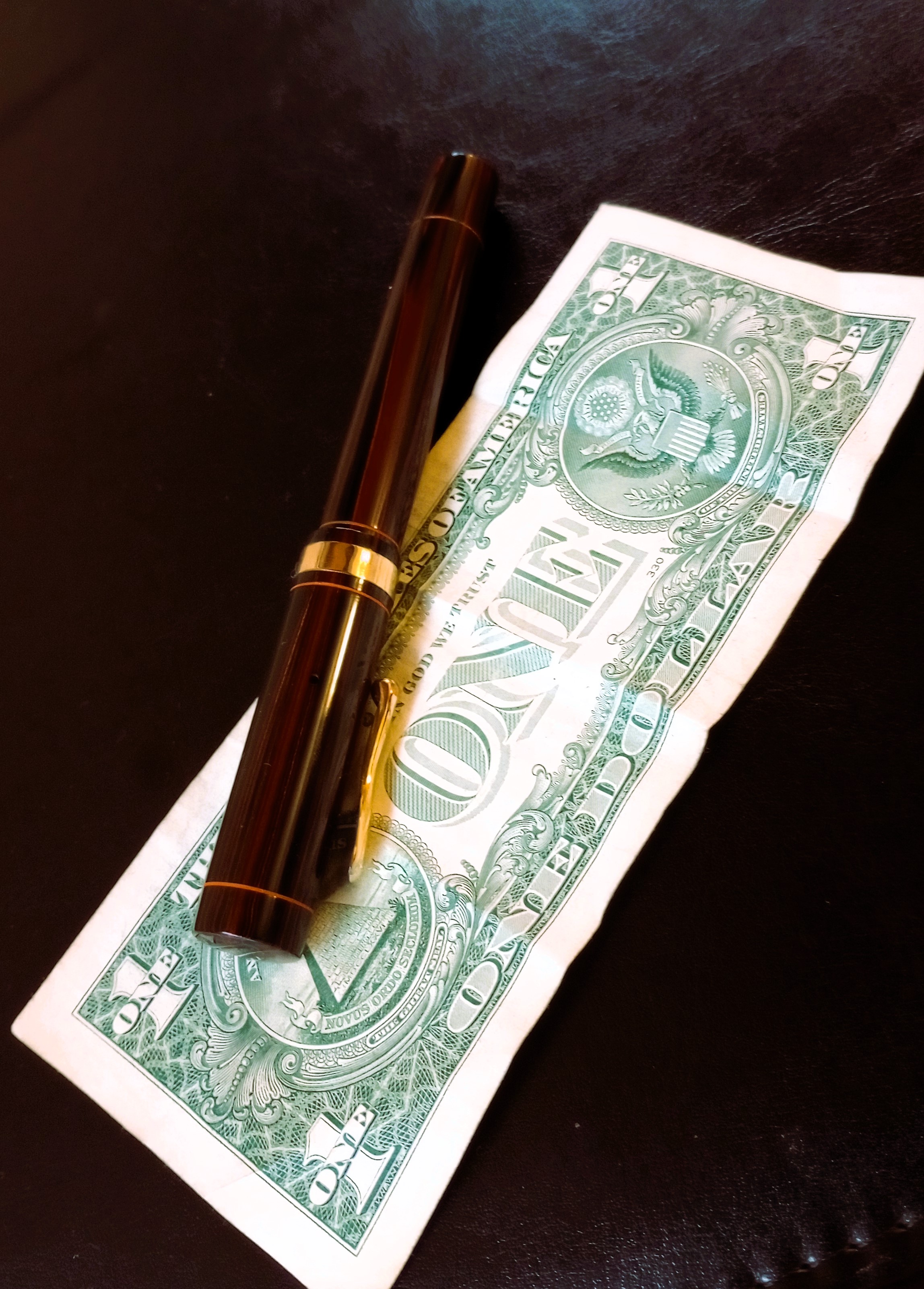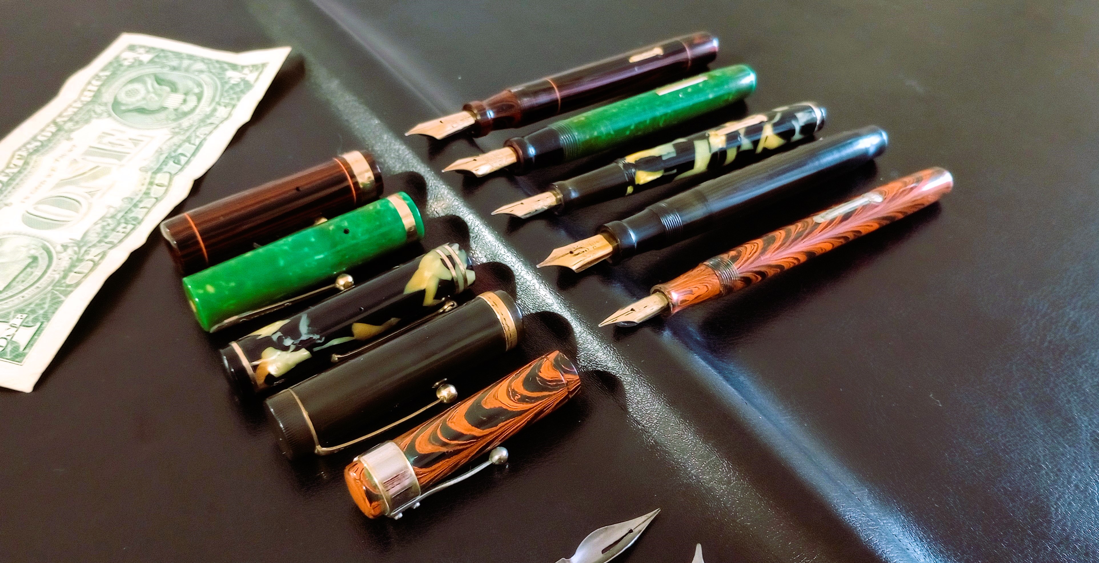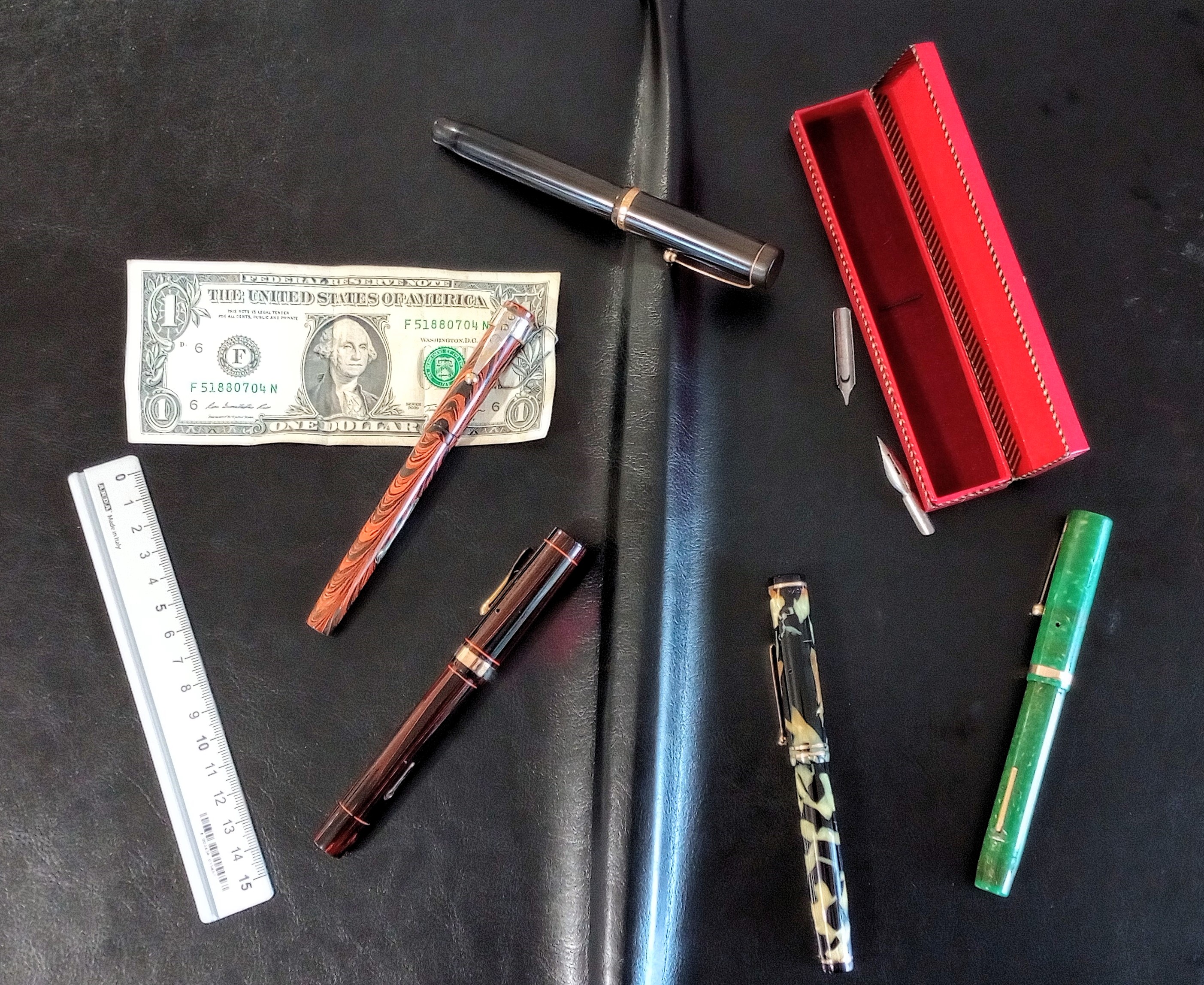 Nell’ordine, in senso orario a partire dalla banconota, troviamo una Waterman’s 52 in ebanite Rippled (1926), una Parker Duofold Black in ebanite (stranamente invenduta fino al quel momento, essendo forse del 1924), una Sheaffer’s Flat Top Lifetime in celluloide green jade (post 1924), una Whal Eversharp Signature Gold Seal (five spot, 1928) in celluloide nero e perla e, da ultimo, quella che per me è firmata dalla Fifth tra le grandi aziende produttrici di penne statunitensi, ossia la Conklin, che mette sul piatto una splendida Endura Senior in ebanite woodgrain (post 1925).