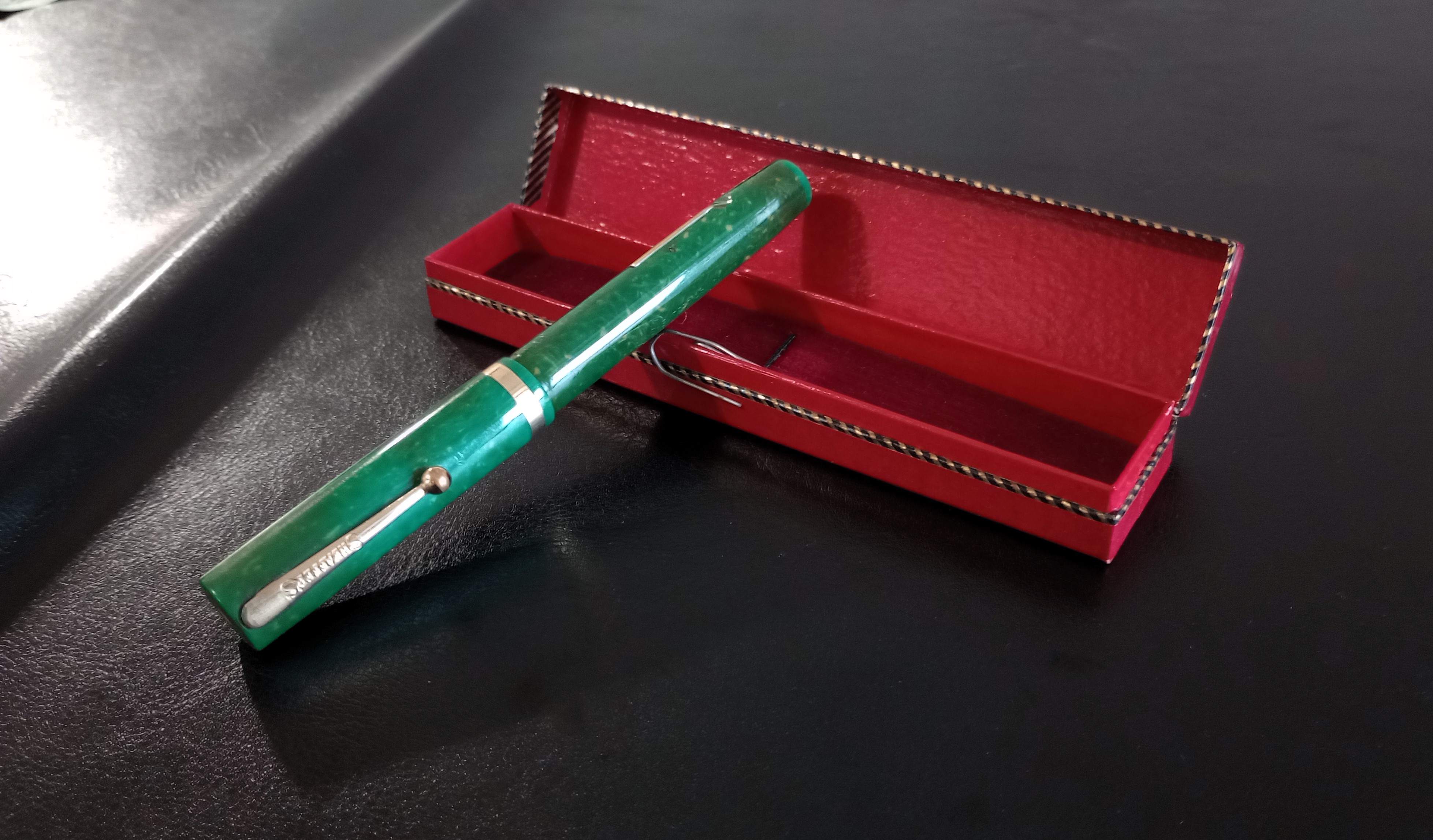 Ed ecco che il nostro giovane dirigente, messosi ormai a suo agio (si è tolto il cappotto doppio petto e il cappello), ripone da parte la Wahl, come a volerla tenere da conto senza precludersi altre possibilità, e prende in mano la Flat Top di casa Sheaffer’s. L’ambiente è rilassato, è tardi e se la prende comoda: conosce bene il marchio (molto famoso e innovativo al pari di Parker), si sente rassicurato dalla garanzia a vita, come quella offerta dalla Eversharp, ma – rispetto a quest’ultima – il marchio di Fort Madison è in anticipo di quasi un lustro sulla lavorazione della celluloide e, parlando di innovazioni, se la vede all’arma bianca con quelli di Janesville. La penna è di sostanza, senza fronzoli e in pura Radite verde giada, molto tosta, tozza, ma con classe.
