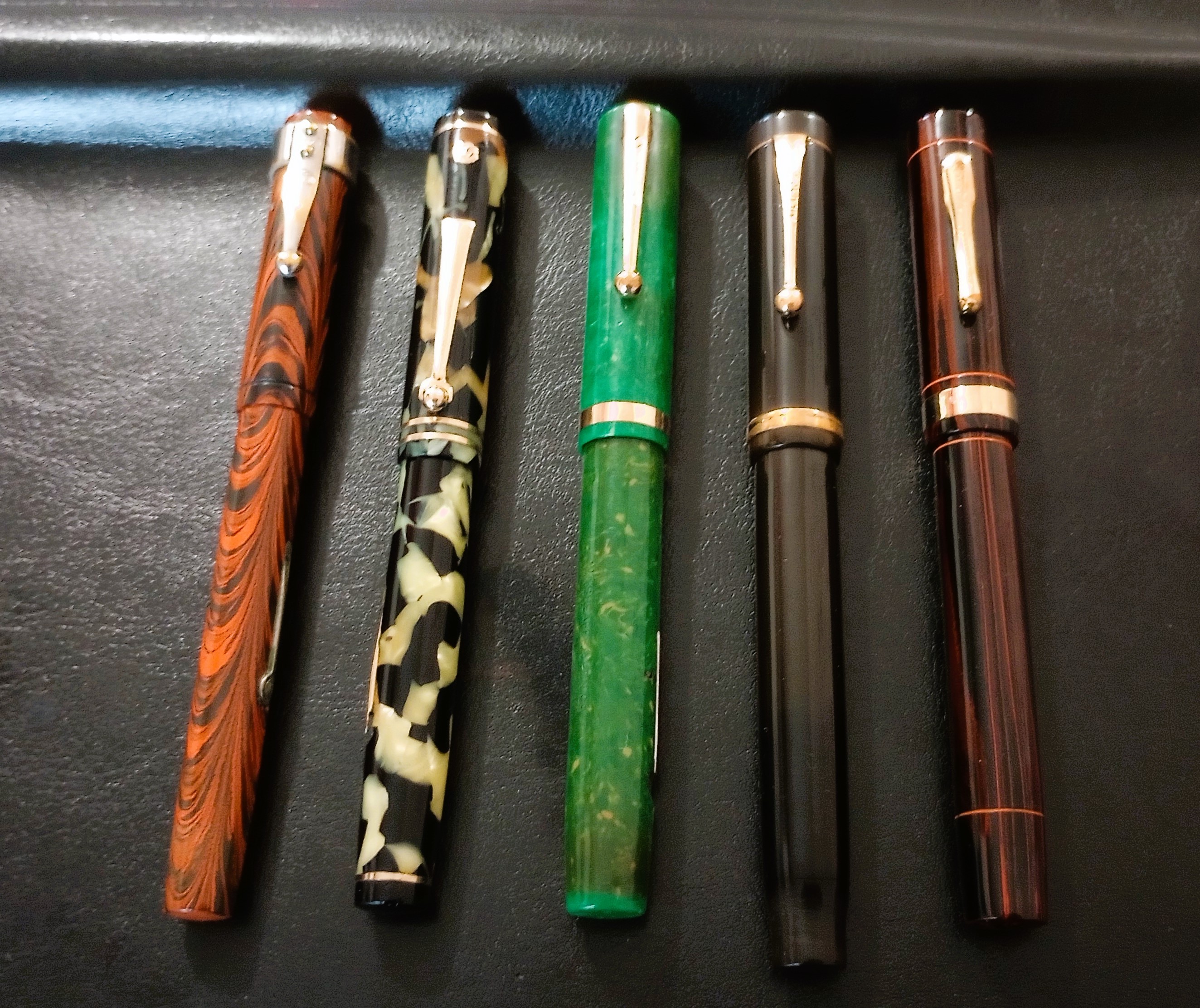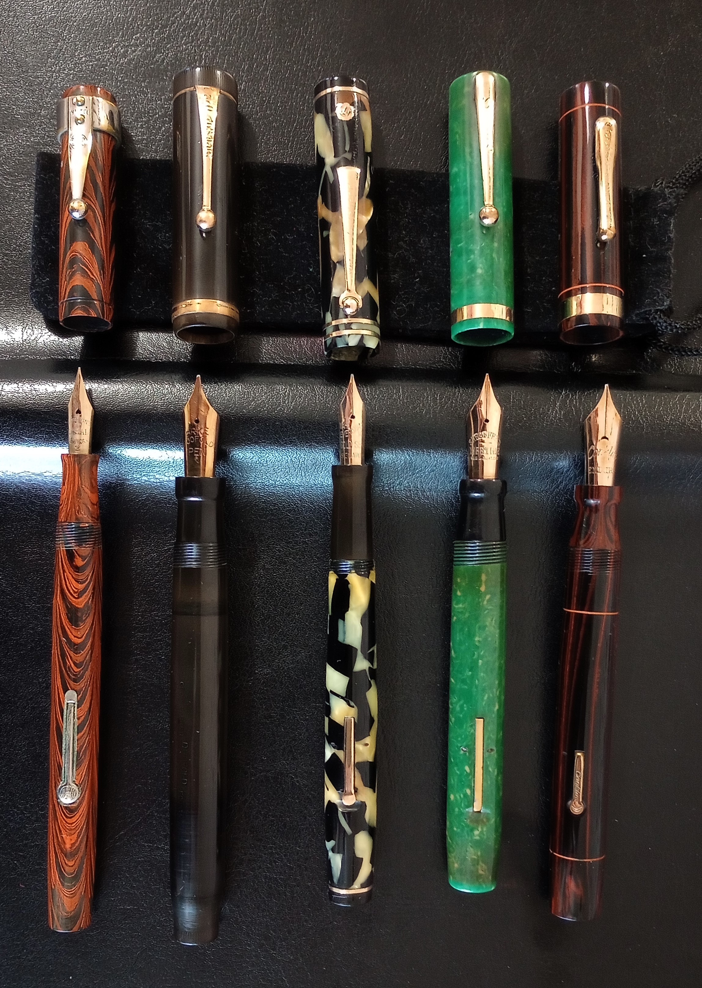 Insomma, le penne che qui vorrei collazionare avrebbero potuto essere tranquillamente in compresenza nella vetrina di una fornita bottega di cancelleria in Fifth Avenue. Rigorosamente Flat Top (ma il termine è seriore, nonché proprio del collezionismo americano) questi strumenti di scrittura sarebbero probabilmente stati proposti insieme, a scelta su un bel sottomano in pelle, in favore di un dubbioso compratore dell’epoca, il quale si sarebbe goduto questo stuzzicante spettacolo.