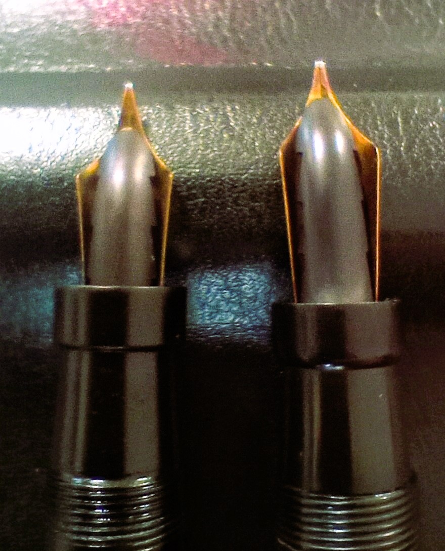 Qualche differenza è presente nel cappuccio: il modello in ebanite, made in Janesville, presenta un anello di rinforzo interno che, tuttavia, non è valso la salvezza del labbro da una “capillimetrica” venatura (prontamente fermata dalla vera pochi millimetri soprastante). Queste stilografiche gemelle testimoniano così il passaggio di Parker dall’ebanite alla cosiddetta Permanite (lanciata sul mercato con crash test che prevedevano la caduta della penna dal tetto di un palazzo, da un aereo o dal Grand Canyon) e, in effetti, l’esemplare in celluloide ha ancora le incisioni sul fusto ben evidenti mentre quelle sull’ebanite sono quasi scomparse.