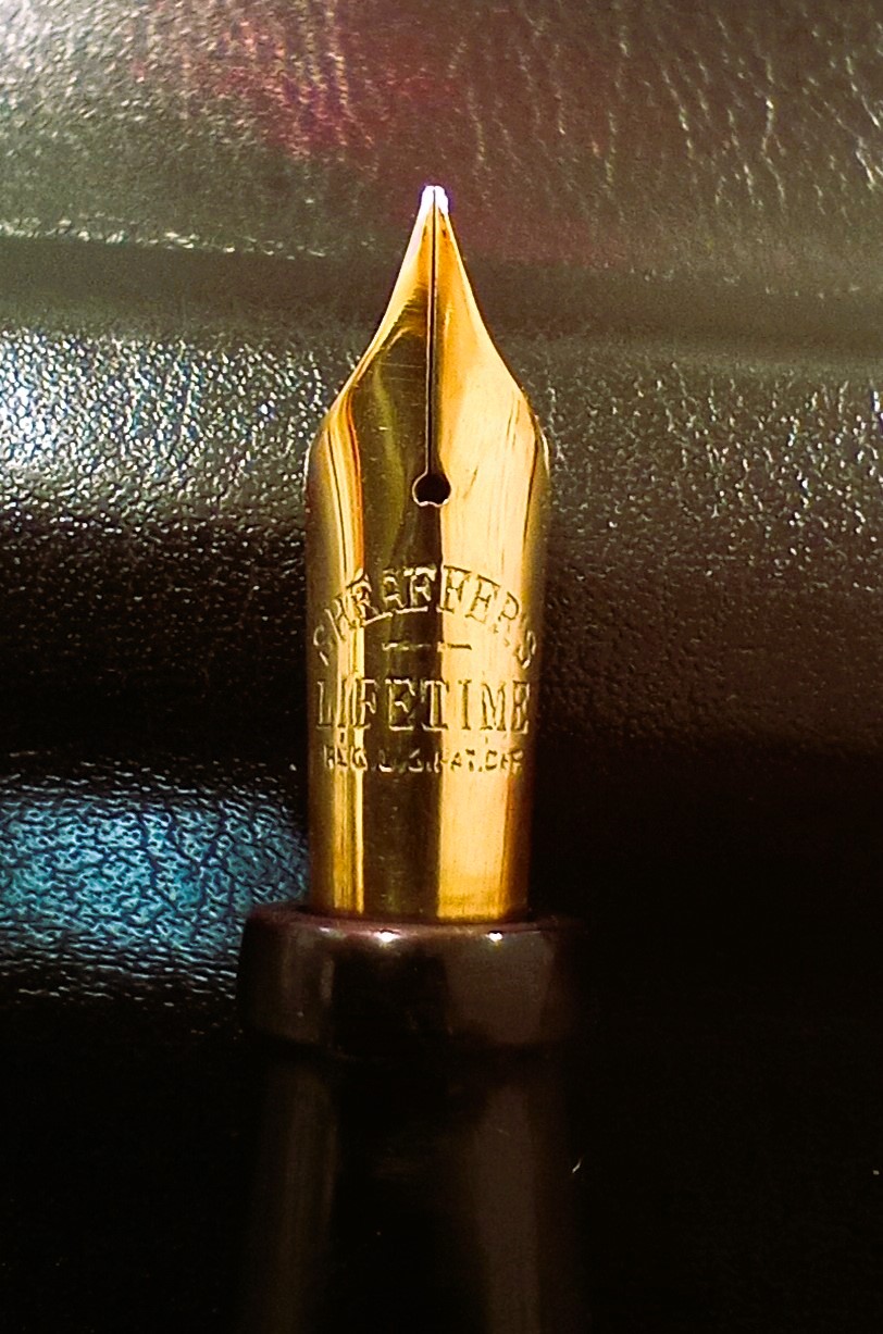 Tocca alla Flat top di casa Sheaffer’s e… però, che sorpresa! Il pennino è imponente, generoso, forse l’unico a tenere testa alla Duofold. La scritta Sheaffer’s – Life Time troneggia come indirizzata ai posteri, un secolo dopo, a futura memoria di chi le penne sapeva farle meglio di tutti. Che sfrontata presunzione! Viene voglia di scrivere con questo pennino, indubitabilmente.