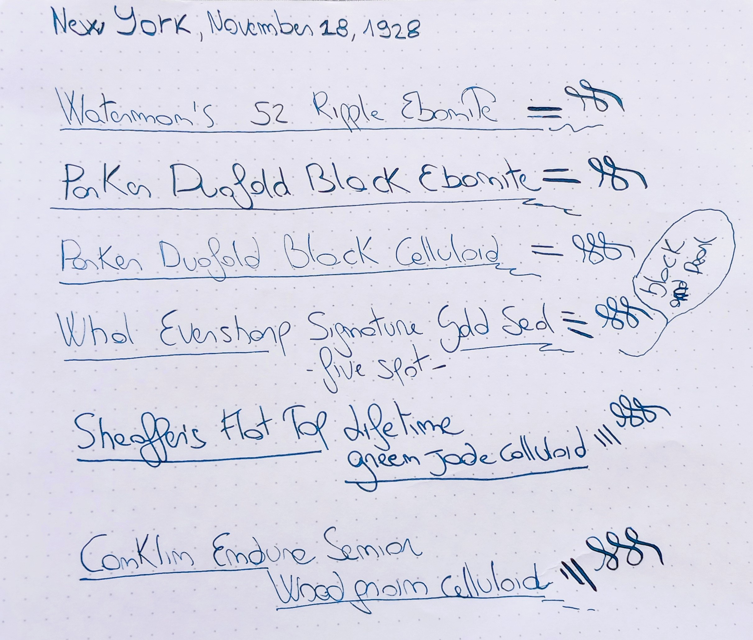 A decidere sono stati i pennini e la Parker in ebanite ha sbaragliato la pur agguerrita concorrenza: il suo pennino era scorrevole come quello di Sheaffer’s, ma più flessibile e solo l’Endura poteva a malapena tenerle testa, ma il pennino di quest’ultima era meno propenso alla variazione di tratto. Che meraviglia.