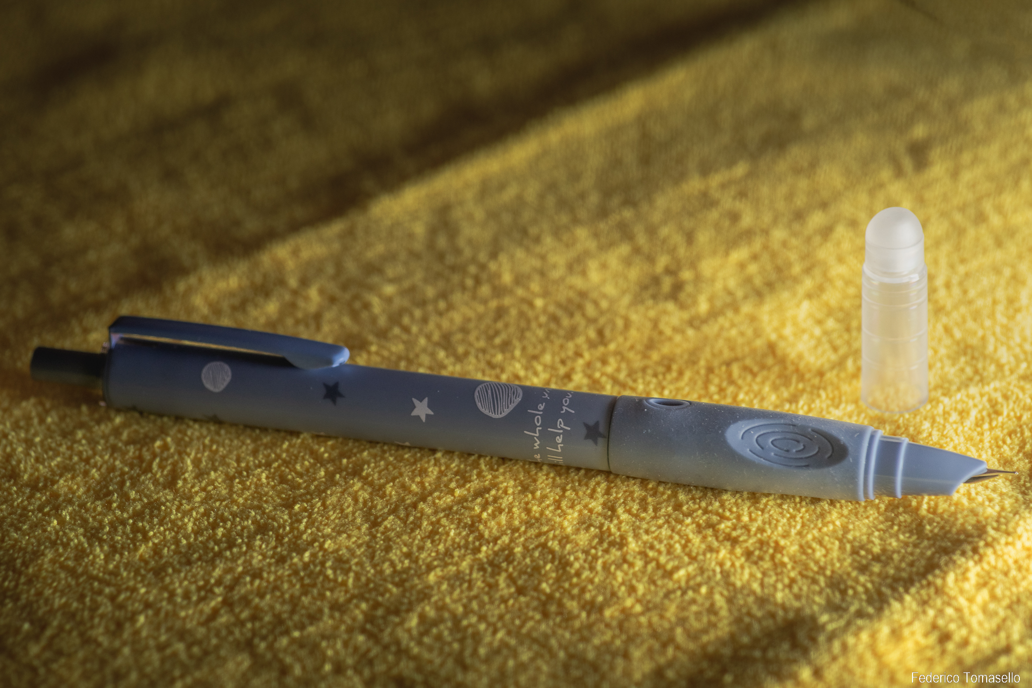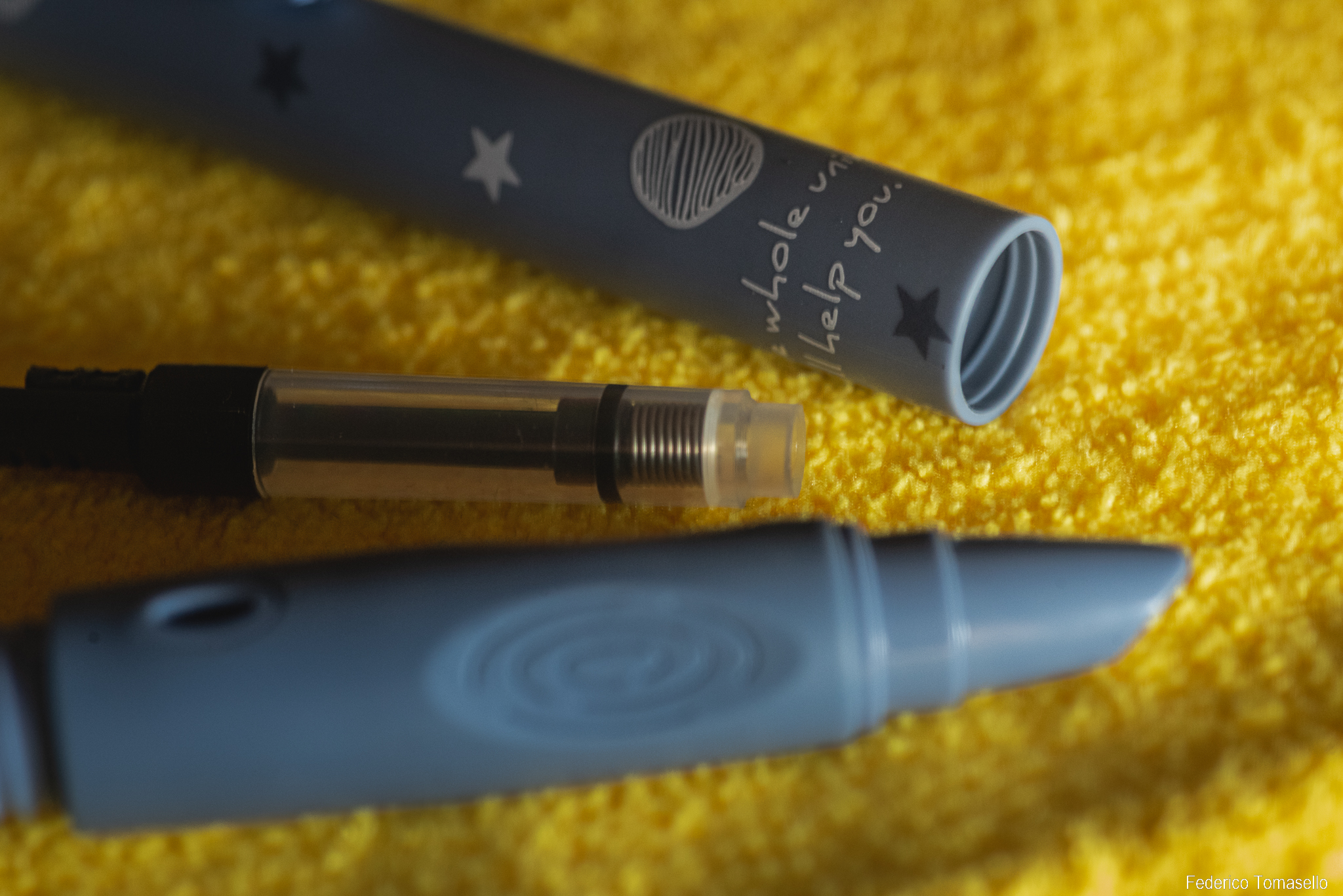 Ho provato a montare le cartucce standard passo 2,6 o 3,4, ma la penna sembra restia ad accettare (a occhio ha un attacco ancora più grande). Se qualcuno sapesse di più di come io possa inchiostrarla, faccia un fischio!