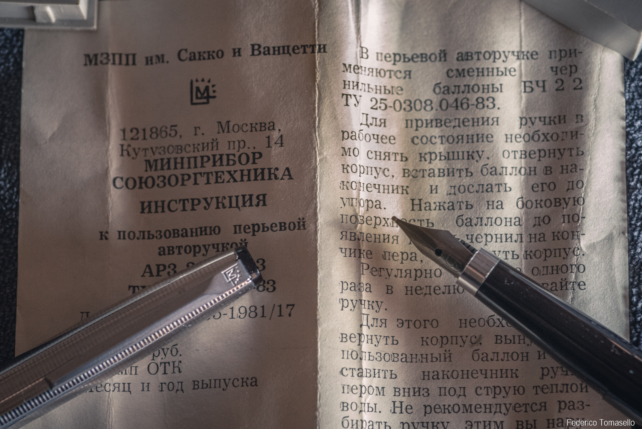 La seconda penna sovietica è giunta nelle mie mani, corredata di "passaporto" (il foglietto con le indicazioni di produzione di molti prodotti sovietici) e di scatoletta di plastica grigia (come da stereotipo occidentale sulla capacità coloristica dell'est), ma purtroppo senza alcuna pompetta, converter, cartuccia o caricatore.