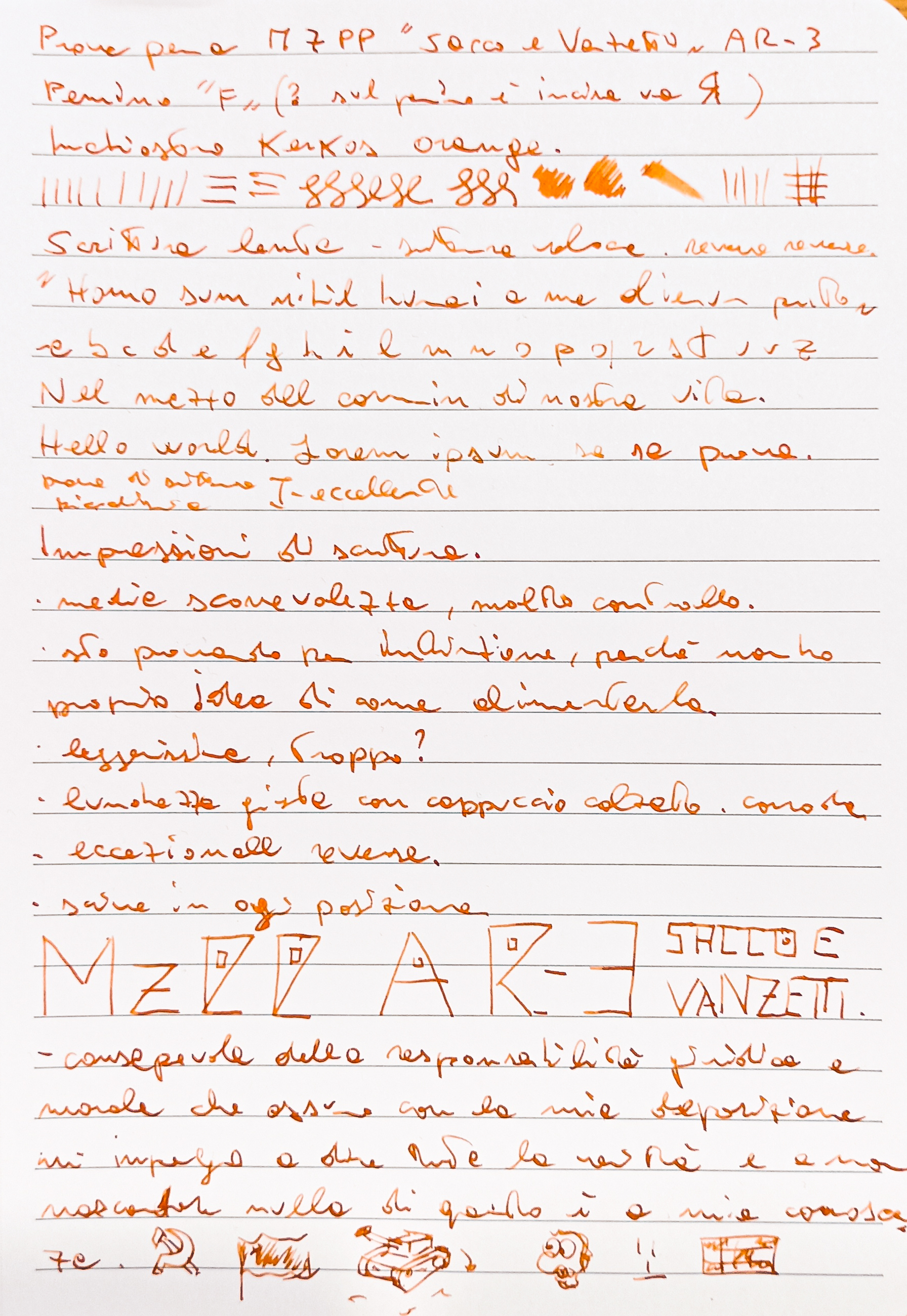 Sul foglio scorre gradevolmente, con pochissimo attrito ma buon controllo. Il pennino EF, rigidissimo, in questo caso è molto bagnato (forse anche grazie al Karkos marrone, che mi sembra bello liquido e unto).