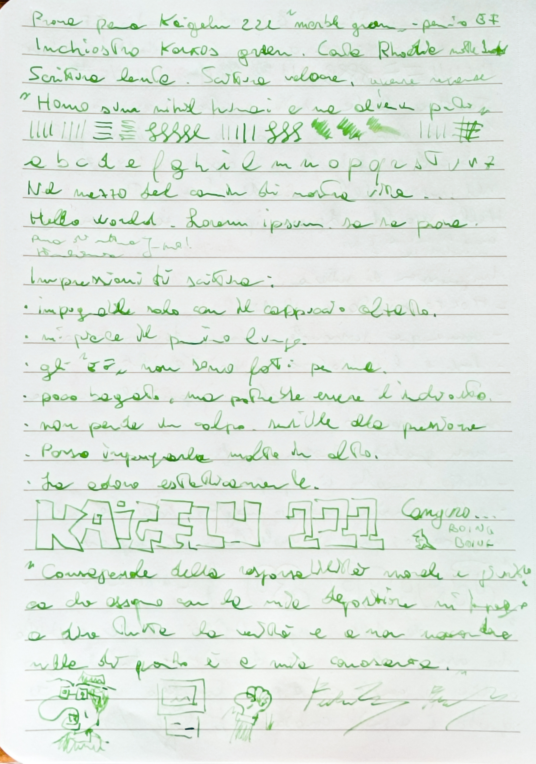 La penna, lo ammetto, mi ha un po' deluso: non la sento andare particolarmente meglio di altre che ho comprato, anche se in effetti non perde neanche mezzo millimetro di tratto ed è scorrevole e senza attrito nonostante sia molto asciutta e stitica; quest'ultimo aspetto però potrebbe essere dovuto all'inchiostro verde Karkos, che ha dato la stessa impressione in una prova successiva. Comunque, dopo un paio di pagine, anche la Jinhao 80 ha iniziato ad andare molto meglio, allargando il tratto e risultando più bagnata.