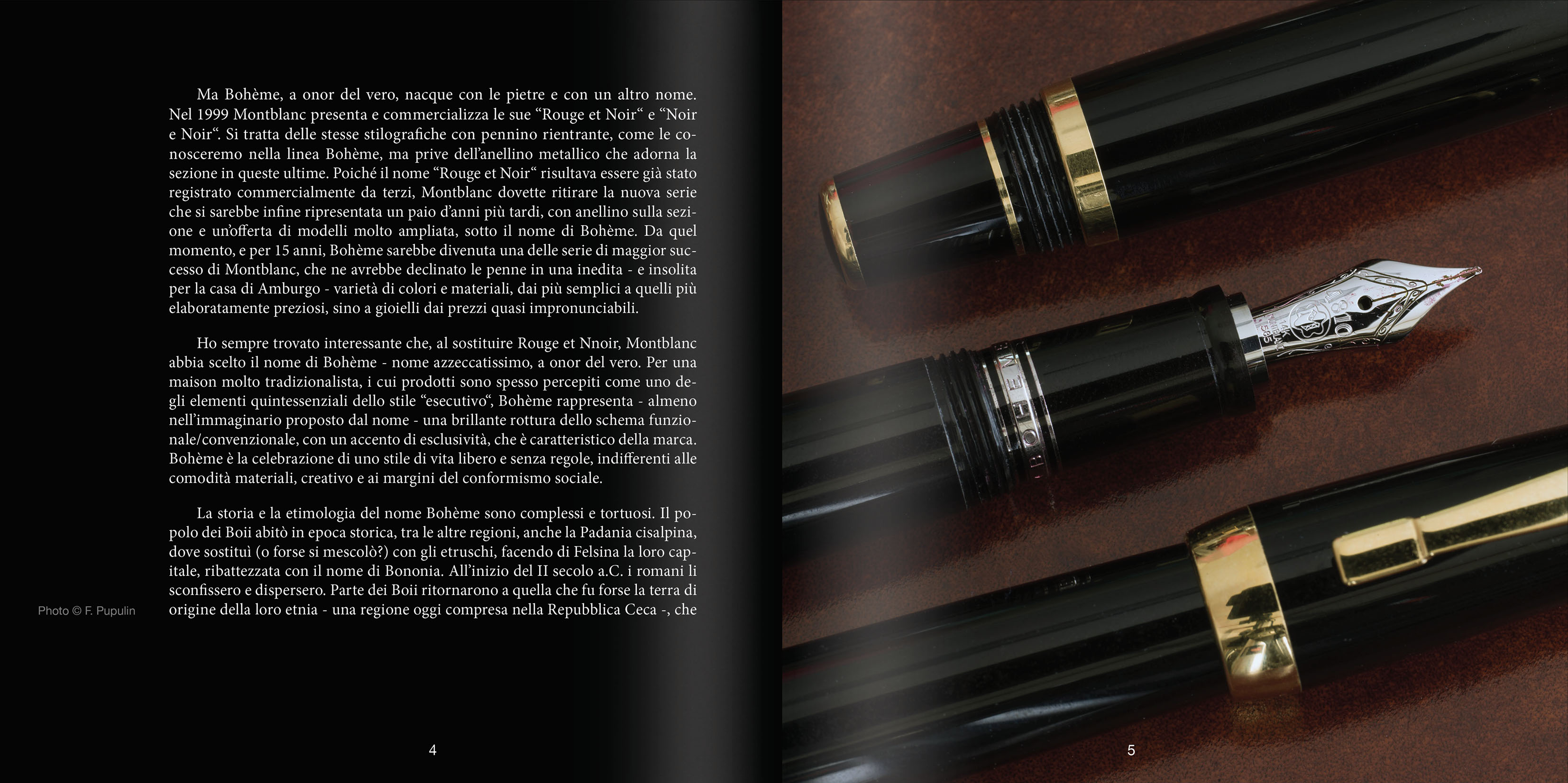 Non si tratta di una "chiacchierata" su una penna Bohème, e neppure della recensione di una Bohème, ma di una sorta di sintesi di quello che so, per appreso indirettamente o per esperienza propria, su un'intera linea di penne rimasta in produzione per 15 anni e che ha rappresentato, a mio modo di vedere, una celebrazione della attenzione meticolosa di Montblanc per i dettagli e per la coerenza estetica e stilistica del disegno.