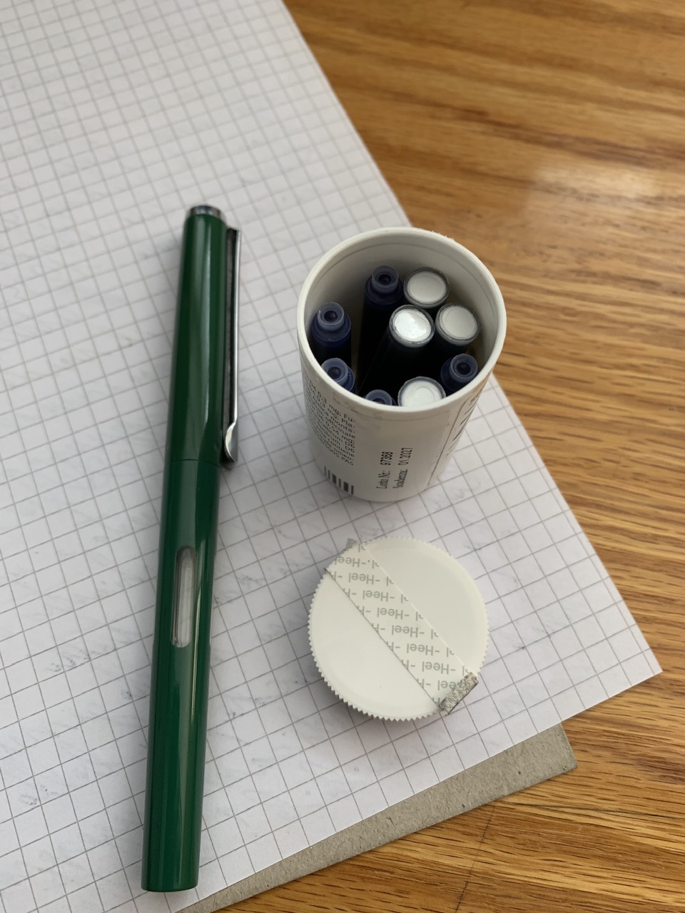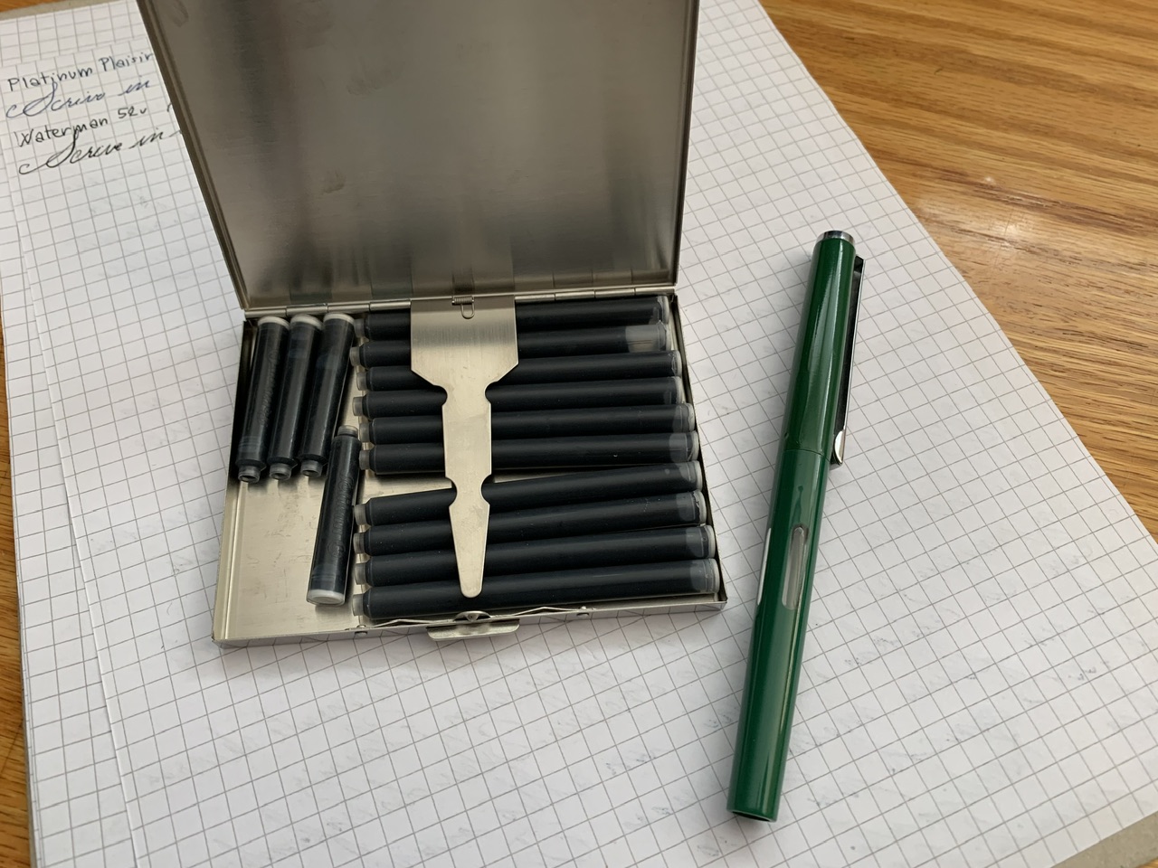 Porto in giro solo penne a cartuccia, tante cartucce devo dire, almeno tre, se vado in biblioteca o a qualche conferenza.
