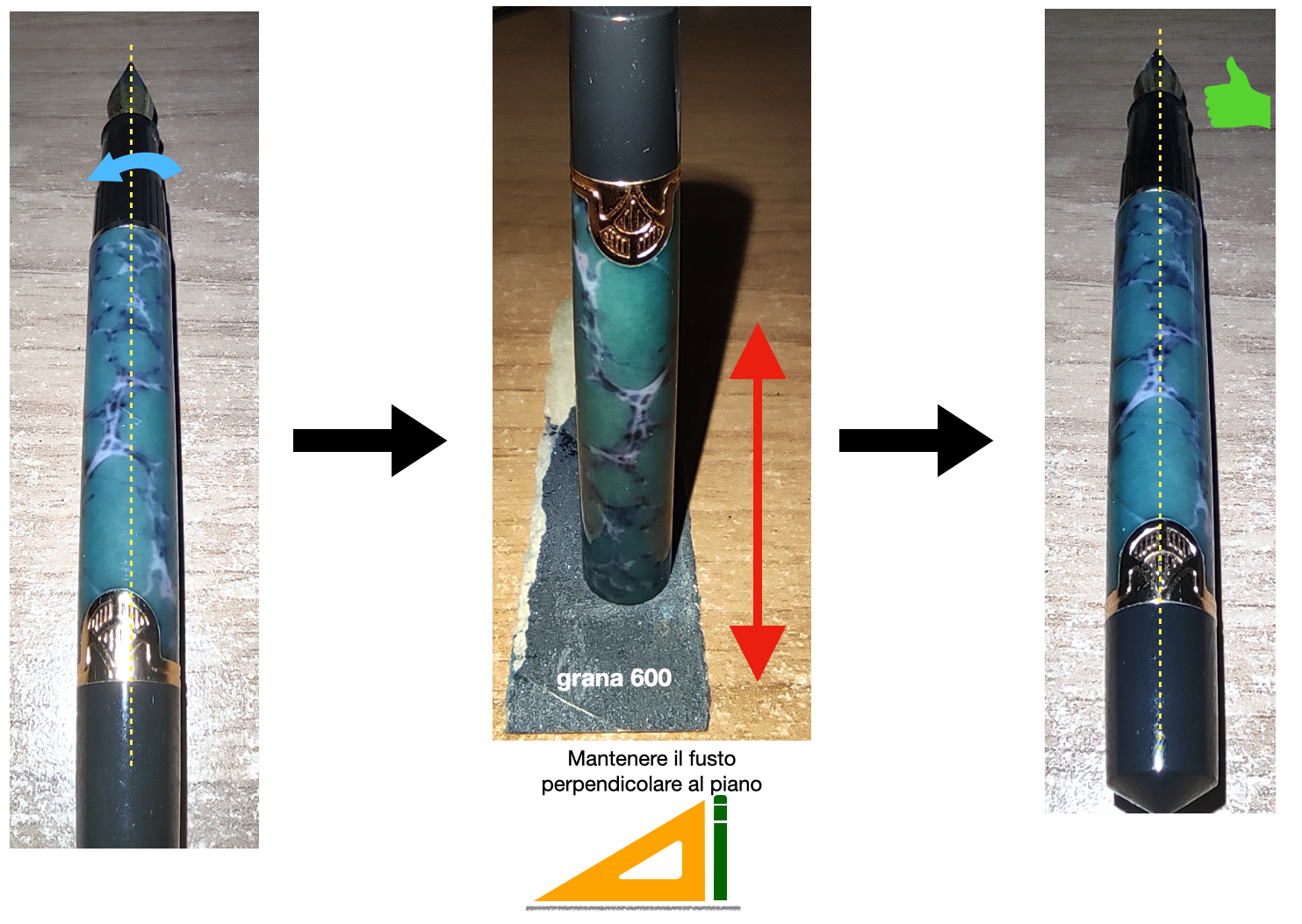 Carta abrasiva con grana 800, non più grossa (magari un pelo più fine) , si eseguono due o tre passate e si controlla l'allineamento. Si va per piccoli passi e poi si controlla, perché il rischio è quello di asportare troppo materiale, con il risultato che la decorazione risulterà disallineata sull'altro lato e non sarà più possibile porvi rimedio.