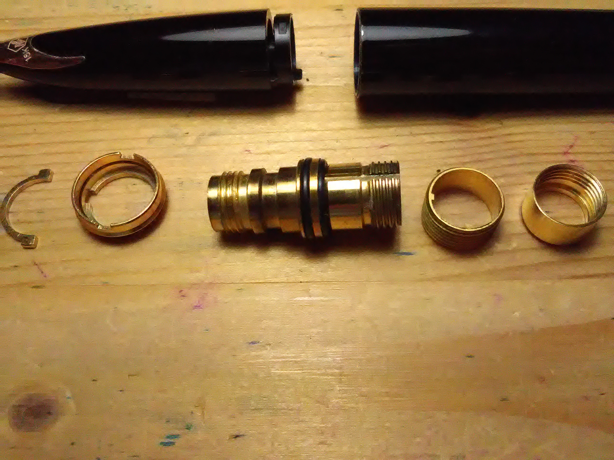 Non è possibile ruotare la ghiera filettata perché ha quel dentino che scorre sulla scanalatura del blocco. L'unica soluzione è limare il dentino in modo che la ghiera ruoti e poi venga bloccata nella posizione giusta dall'anello filettato. Quando il blocco è assemblato e vado a girarlo per allineare la "prora" si svita dalla sezione del pennino.