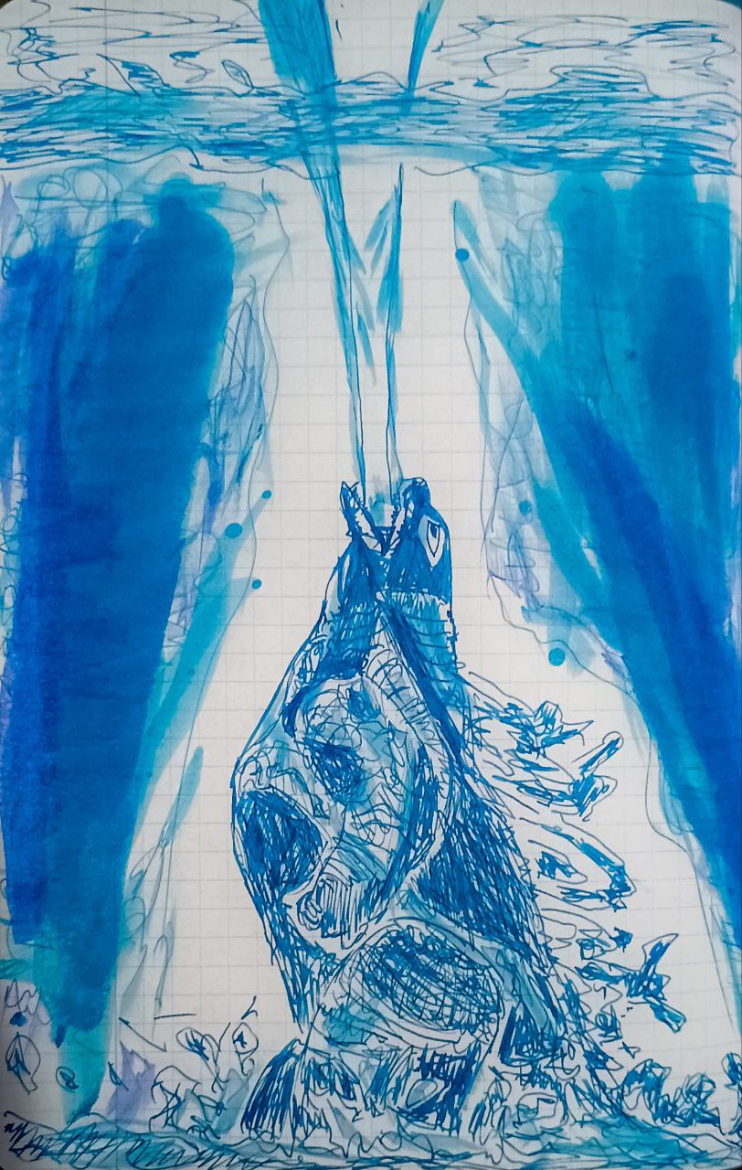 Curiosità 2: l'altra sera stavo guardando la serie TV "Monarch" e, durante la visione, m'è partita l'ispirazione e quindi oltre alla solita pagina scritta di prova, allego anche un disegnino da ragazzino delle medie con trent'anni di troppo; tutto a penna con questa Hero e il suo inchiostro, tranne un paio di gocce di 4001 buttate direttamente sul foglio per scurire i lati. :ugeek: