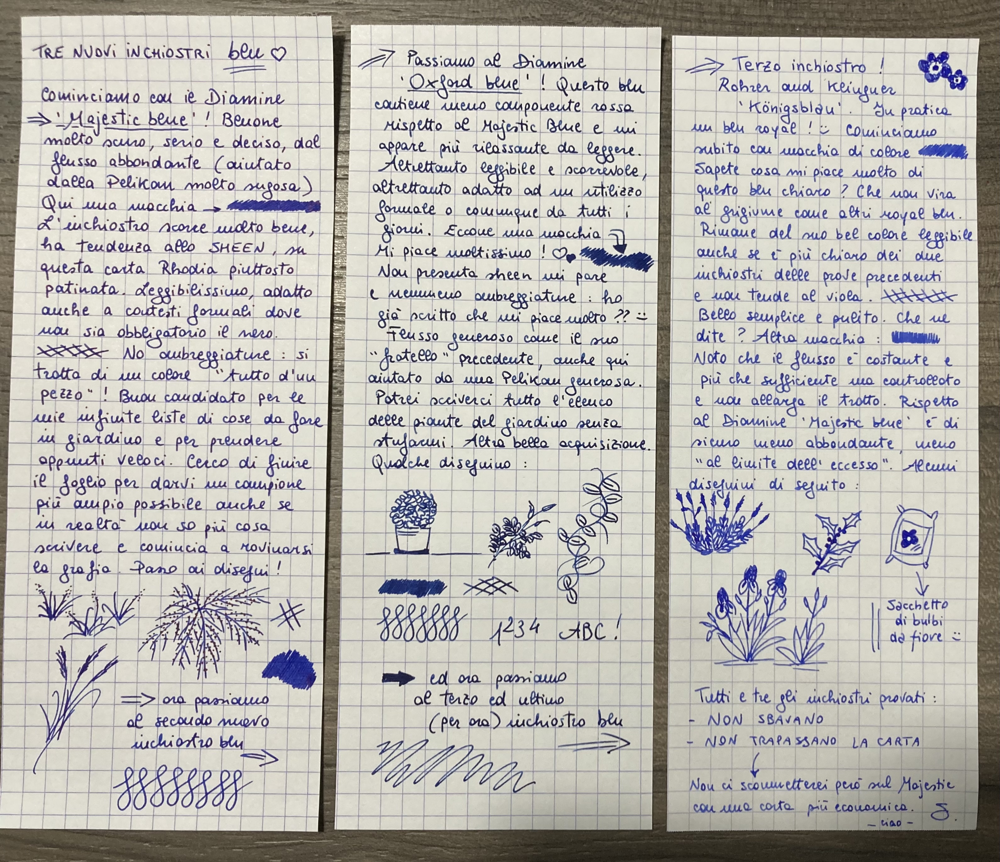 sempre bello vedere inchiostri blu a confronto. Anzi, a mio parere il confronto è fondamentale. Il problema è che scansioni e schermi dei PC alterano i colori e non restituiscono quasi mai le tonalità esatte. Per cui, a parte le proprietà dell'inchiostro che possono essere descritte, per cogliere al meglio consentito dalla digitalizzazione le sfumature di colore, il confronto è l'unica cosa che aiuta.