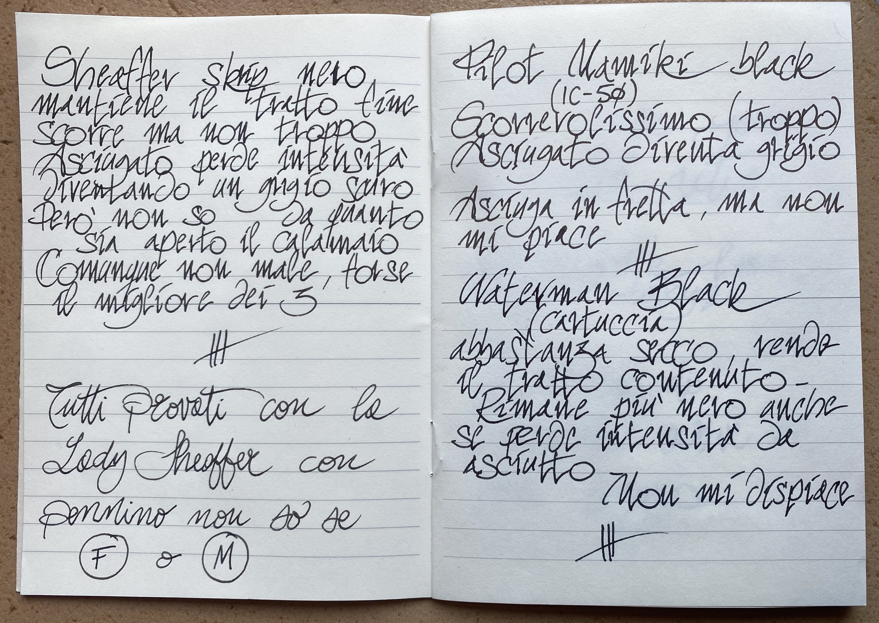 A me sta piacendo molto il Diamine Onix Black. Molto più del nero standard della Pilot o di quello della Sailor (sempre linea base) o di altri neri provati (R&K Nero di LIpsia, MontBlanc Permanent Black, Pelikan Black, Waterman Black, Lamy Nero, Platinum Carbon Ink, Platinum nero base).