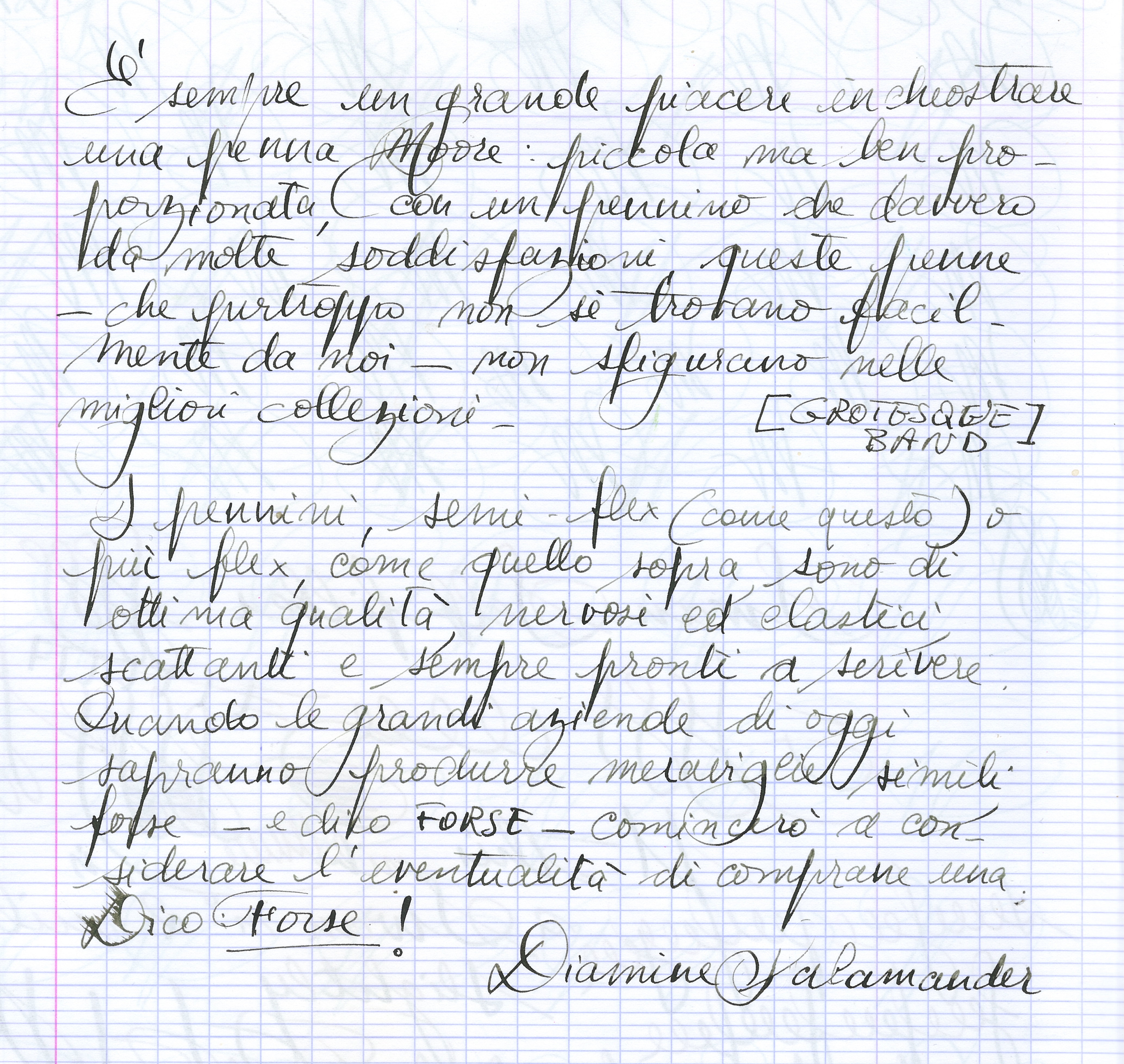 Ma c’è anche la MIA storia con questa penna : tre o quattro anni fa, sentendo la levetta un po’ strana, mando la Moore dal riparatore per cambiare il sacchetto. Pessima idea !!!!