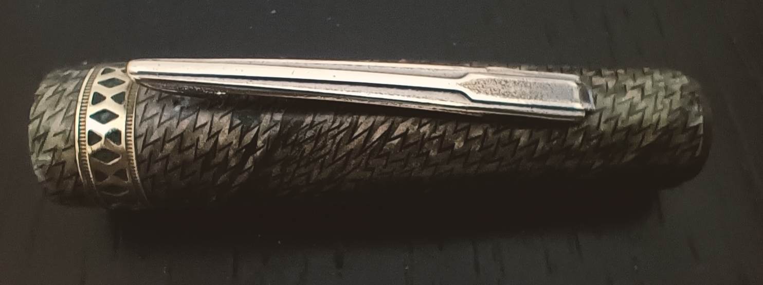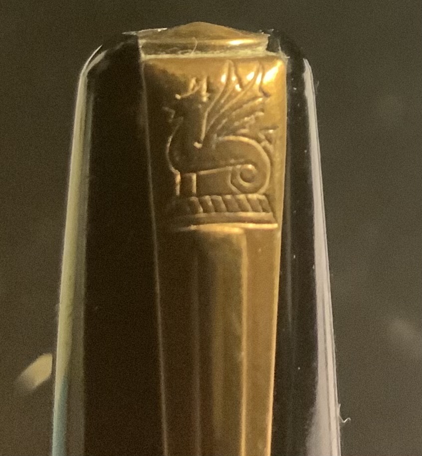 Ho scoperto però che non tutti gli esemplari riflettono queste caratteristiche quando ho messo le mani su questo esemplare, caratterizzato da un design simile ad altre penne della marca, ma con finiture e celluloide molto particolari. Si tratta, come dicevo, di una penna piuttosto semplice, con caricamento a levetta e pennino warranted, cosa piuttosto comune, dato che ho altre Wyvern con pennino simile. Però la celluloide è decisamente più ambiziosa della media, e io la trovo molto bella. Spicca la raffinata veretta traforata in stile art decò Alcune cifre, senza pretese di completezza