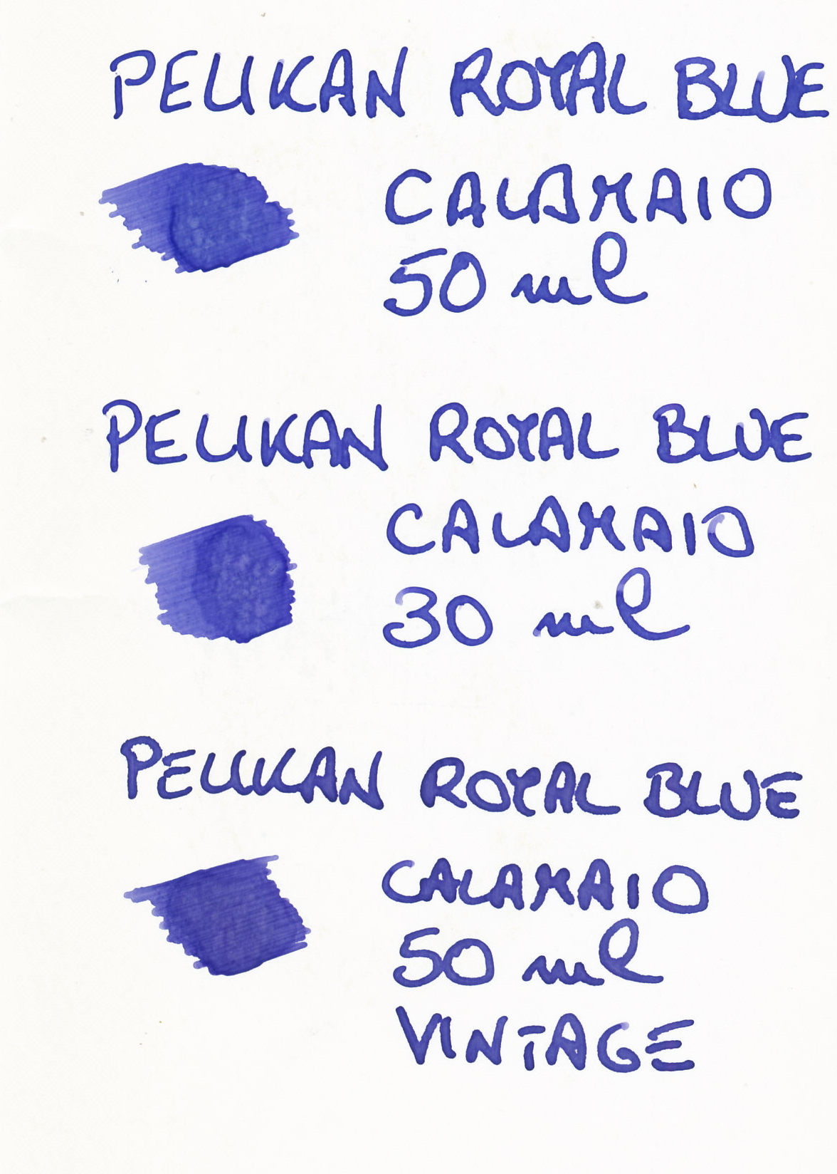 Comunque per curiosità ecco il royal blue da tre calamai diversi (50 e 30 ml moderni, 50 ml vintage)