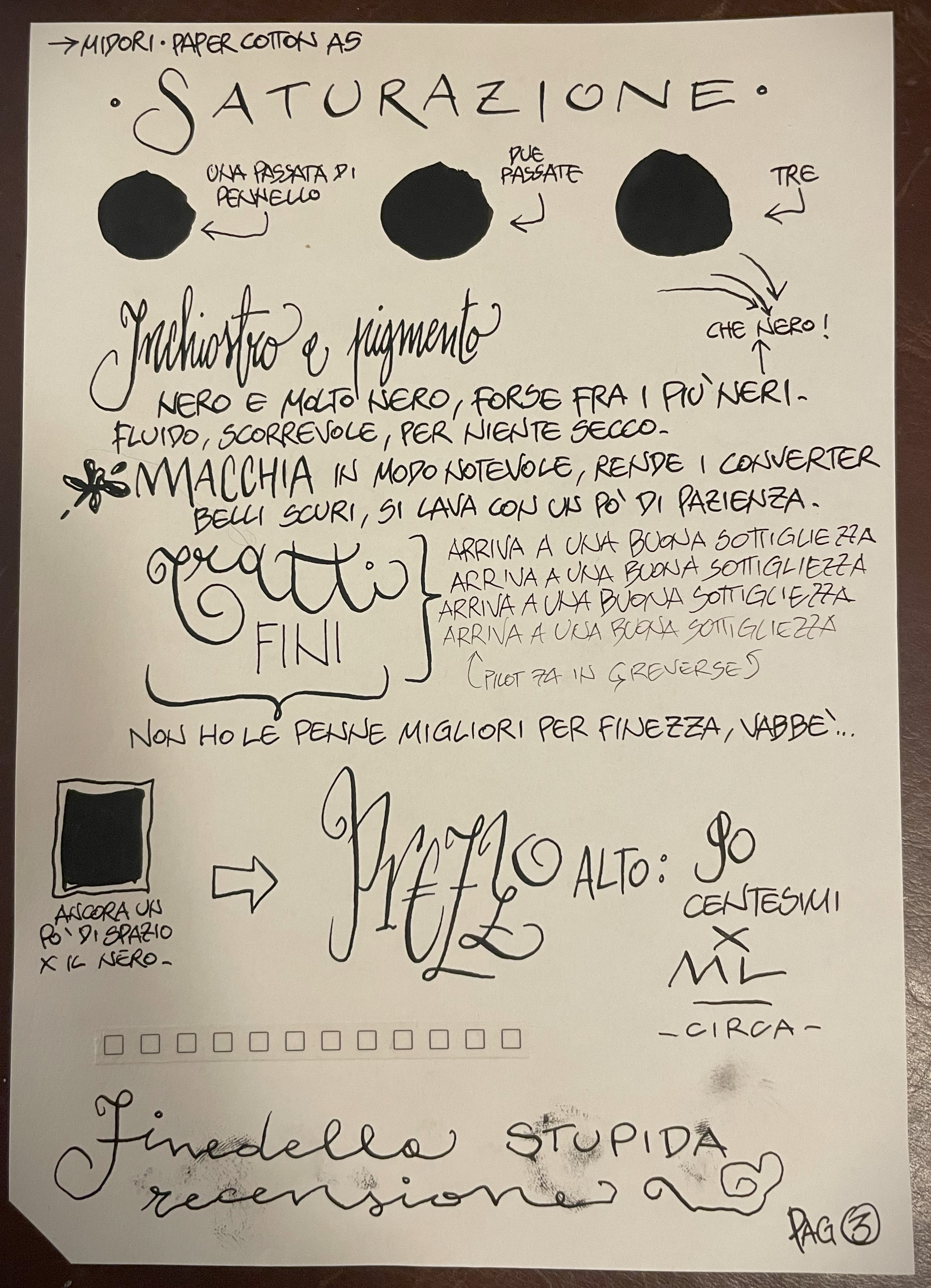 Il costo sì, senza dubbio è caro: circa 95 sent a millilitro. Se però penso ad altri inchiostri indelebili neri e costosi (il mio pensiero va da sempre al permanent della MB, l'apoteosi per me dell'inchiostro dannoso e inutile), su questo chou kuro posso dire che dietro vedo una ricerca, un prodotto pensato.