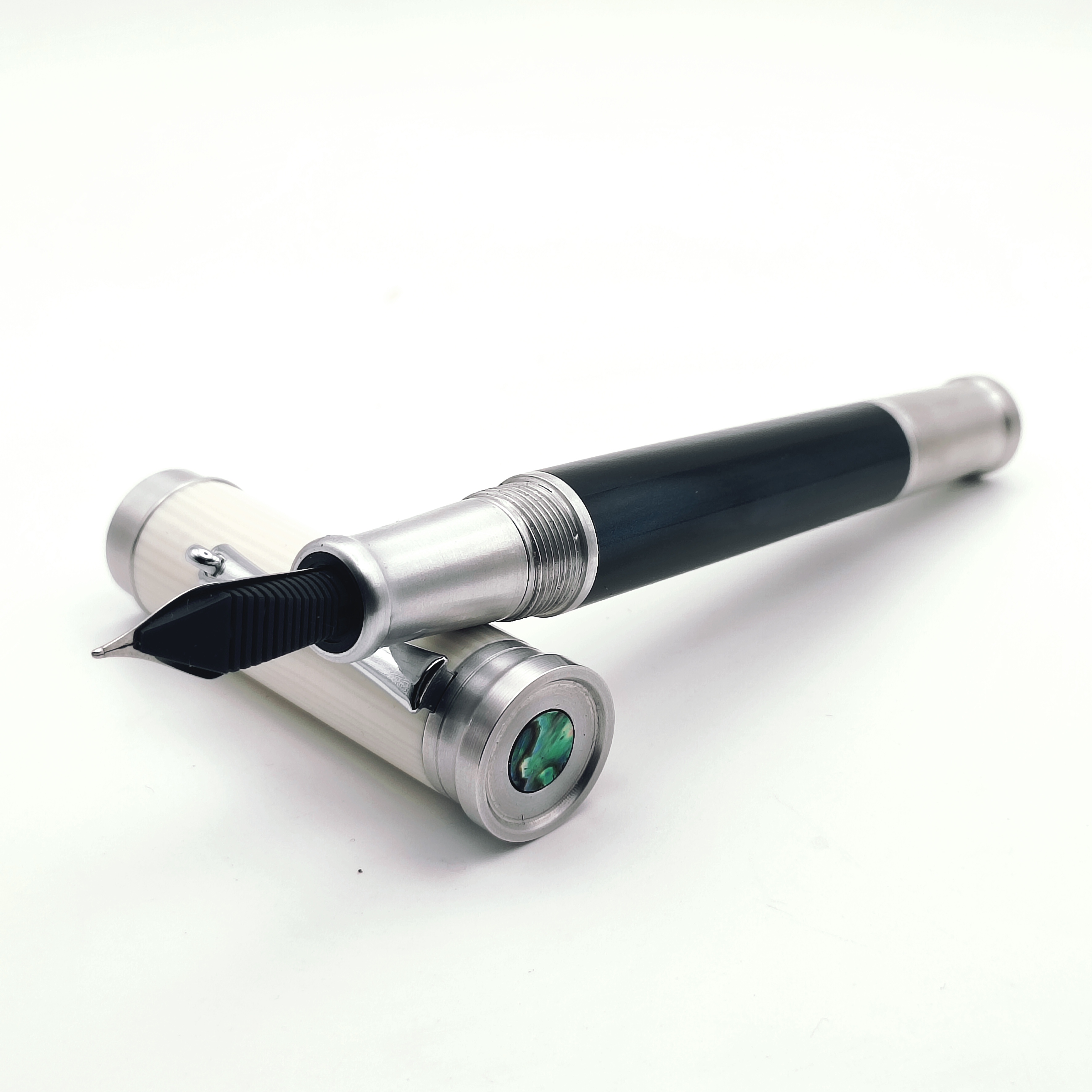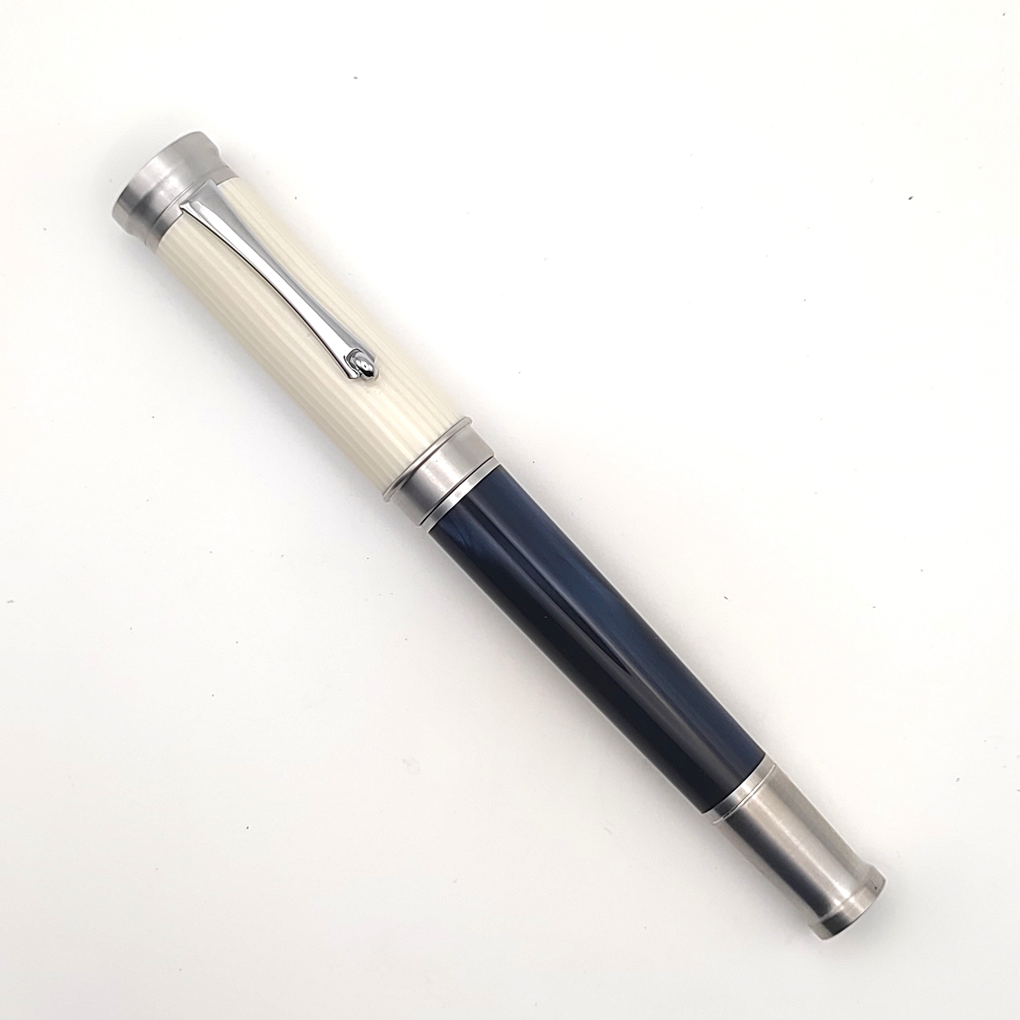 Volevo presentarvi la mia ultima realizzazione: ispirata ad un modello writing edition della Montblanc ho realizzato questa stilografica in galatite bianca e acrilico perlaceo blu. Tutte le parti metalliche in alluminio satinato e pennino Jowo no.6 con converter. Misura142mm da chiusa, il diametro del cappuccio è di 16mm, quello del corpo di 14. Pesa 38g.