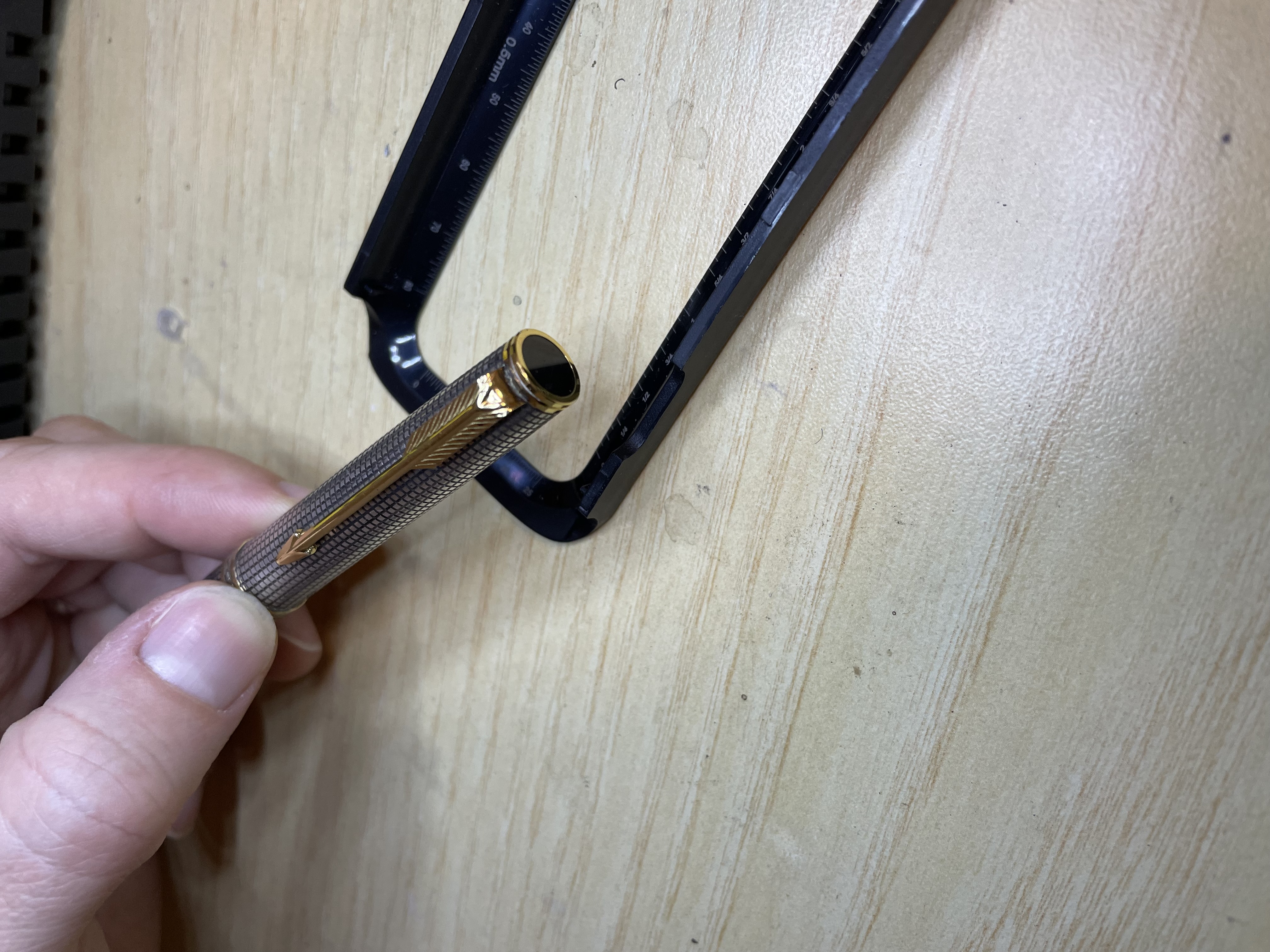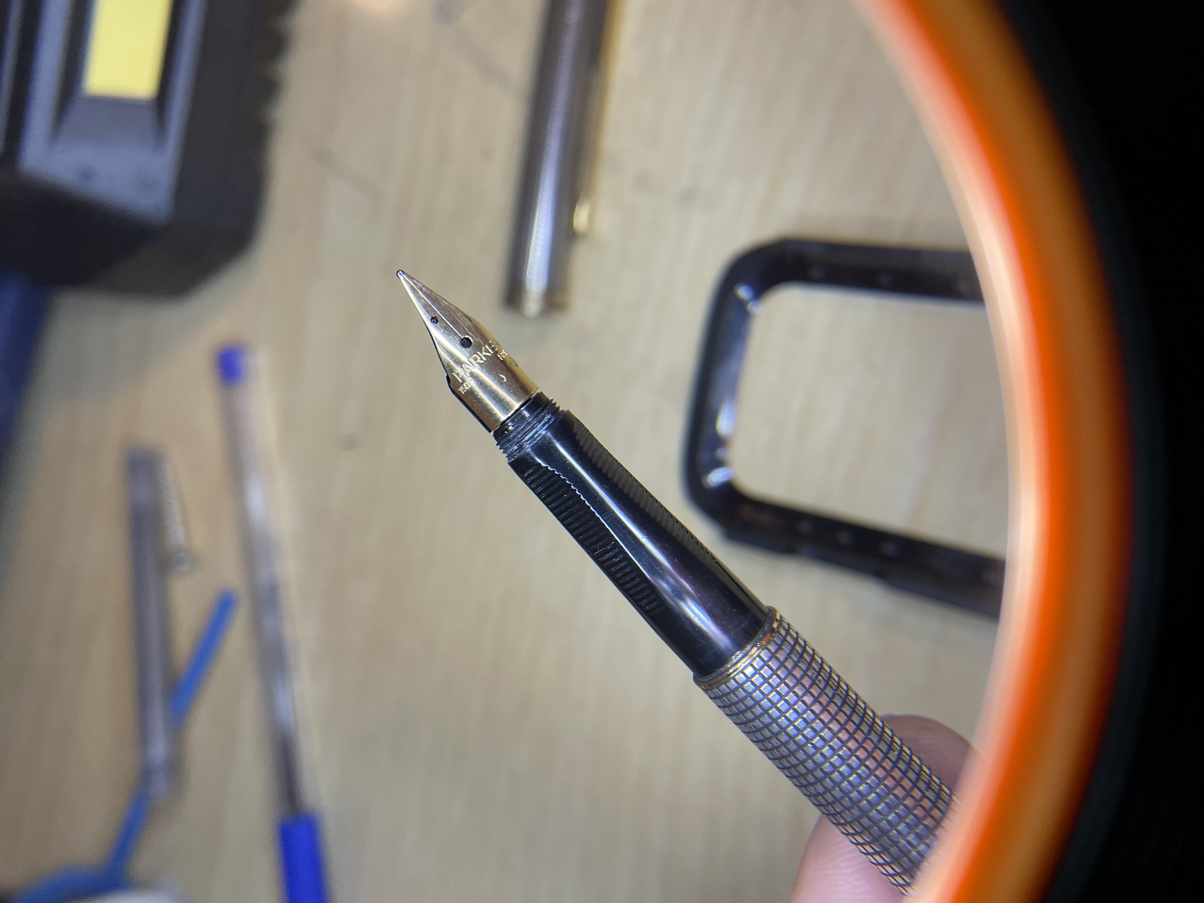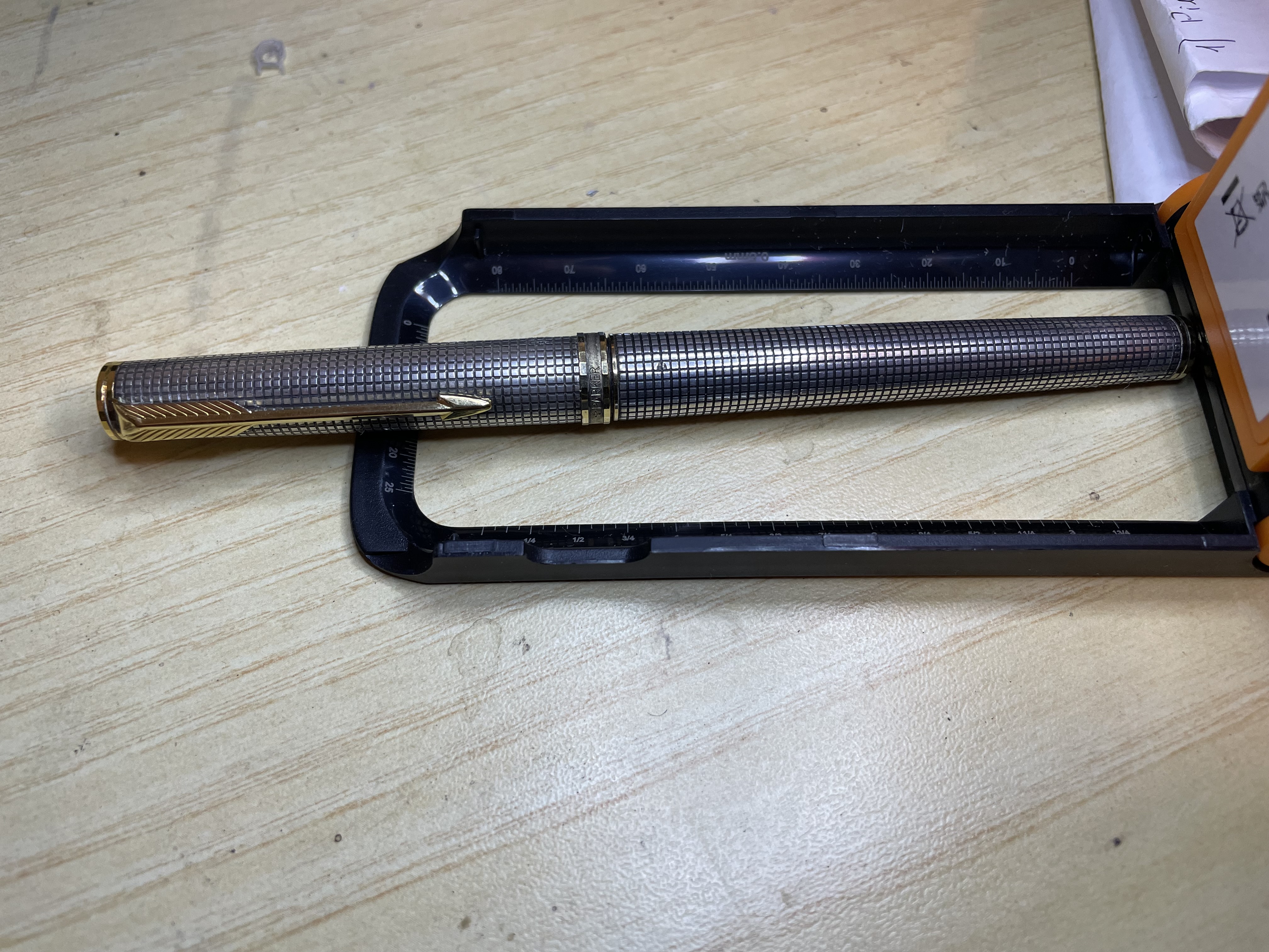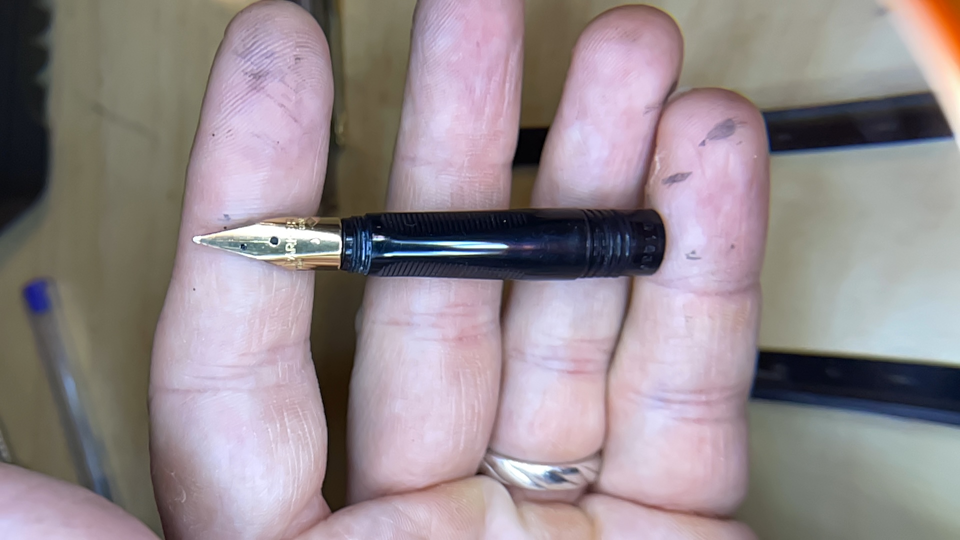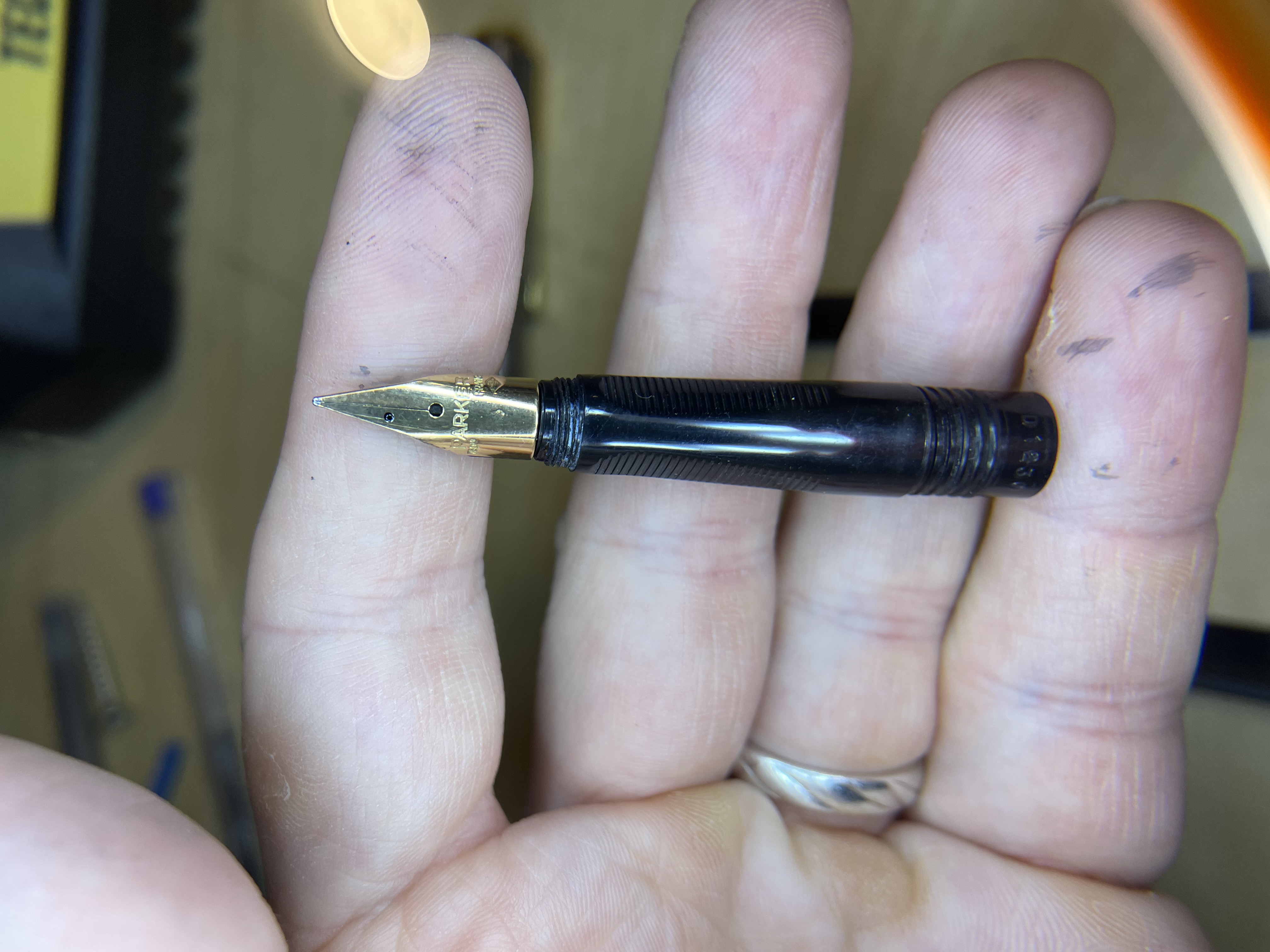 Oggi niente ritrovi da mercatino… bensì asta! Bella parler di cui ignoro il modello, il venditore ha dichiarato che ha il tappo rotto e quindi non si chiude. Io ho acquistato lo stesso, il pennino in oro fa gola ormai. Ma mi domando… non é che le manca un pezzo sulla sezione? Quel filetto scoperto mi mette la pulce all’orecchio… una identificazione aiuterebbe a reperire un eventuale ricambio.