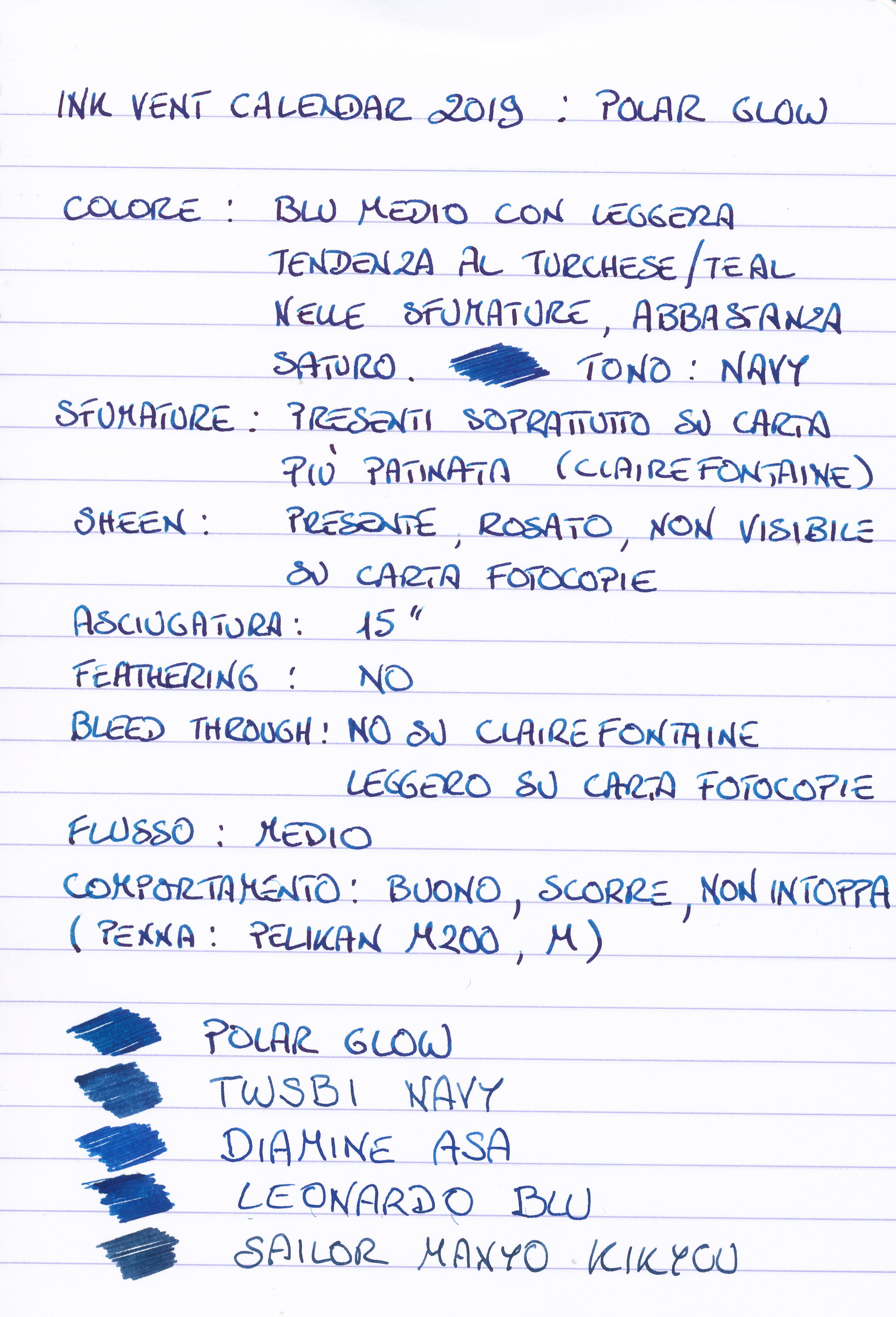 Molto bello il Polar Glow, soprattutto nelle sue sfumature mentre si scrive. Della stessa famiglia, ma una serie successiva, a me piace molto l'Holly, stesse sfumature e bello shading. Se si vuole un blu più serioso ma con insolito sheen nero/blu scuro, consiglio il Midnight Hour, altro bell'inchiostro a mio avviso. Soprattutto se non si cerca la resistenza all'acqua (per l'Holly basta una mano un po' umida e l'inchiostro sbava anche dopo giorni), ci sono belle idee nelle serie Inkvent.
