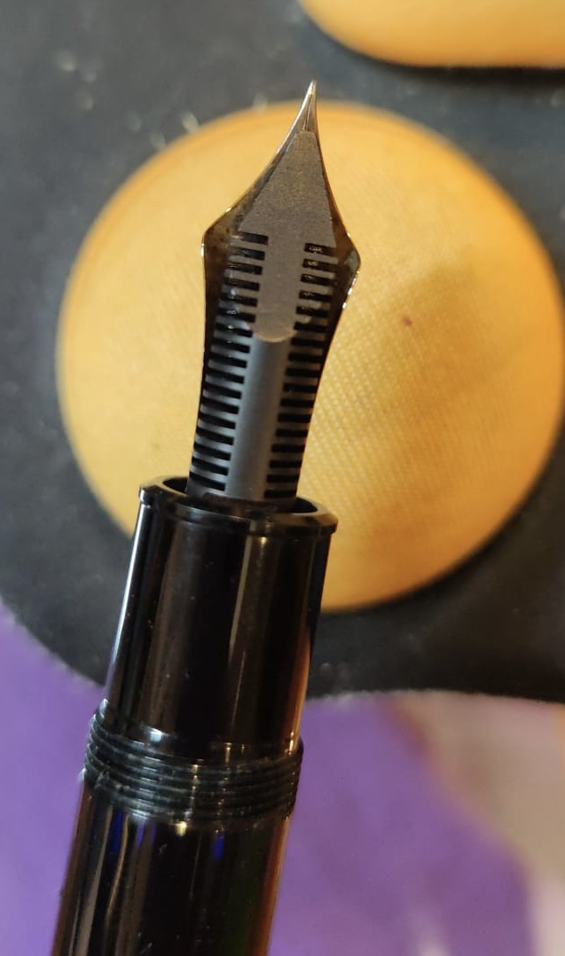 Ho riempito la penna e pare non perdere. Il pennino non mi sembra deformato ed è ben centrato sull’alimentatore, i rebbi sembrano ben allineati. Vi dirò se continua così…