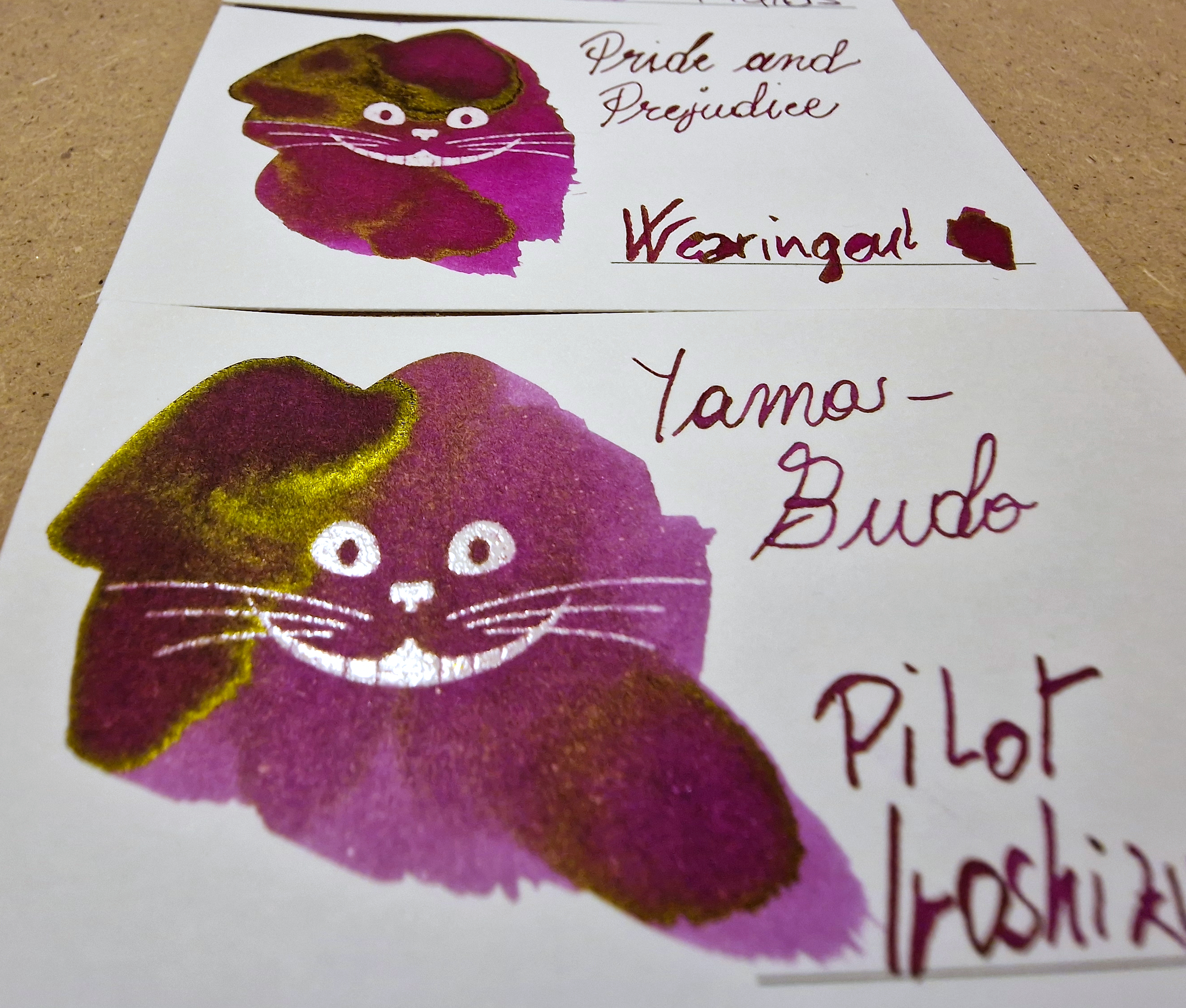 Il colore di base di questo inchiostro è molto comparabile al Pilot Iroshizuku Yama-Budo. Yama-Budo è un poco più violaceo e desaturo rispetto a Pride and Prejudice, meno vellutato e avvolgente. C'è somiglianza anche con Octopus Fluids Purpur. Questi tre inchiostri differiscono nello sheening. Purpur di Octopus Fluids ha un tipico sheen bronzo, Yama-Budo ha uno sheen che tende di più al verdognolo.