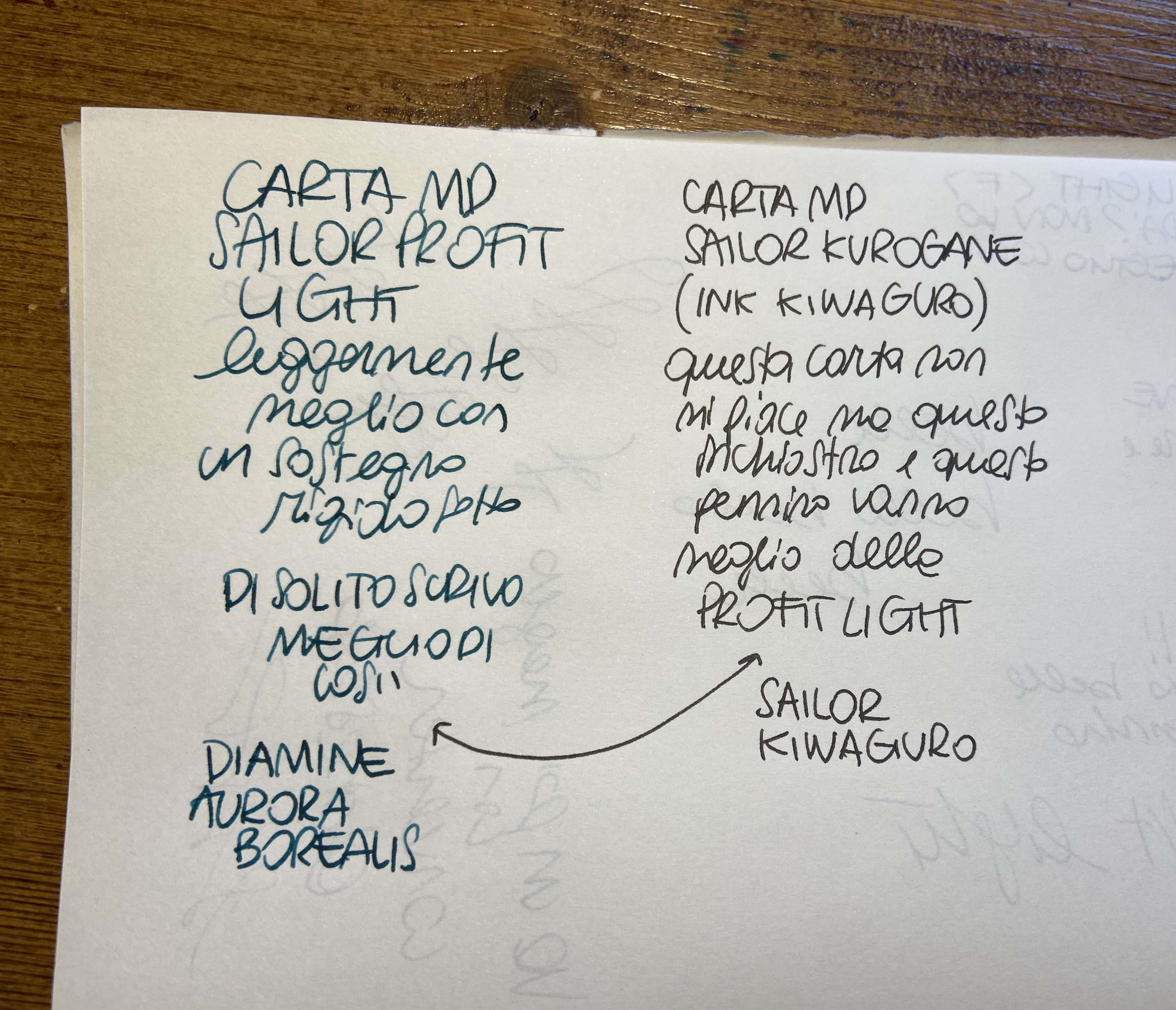 Il kiwaguro è leggermente lubrificato , sulla punta della sailor profit light dovrebbe essere ben bilanciato, anche sulla mia platinum 3776 F dava una sensazione di scrittura migliore rispetto al già lubrificato pelikan 4001