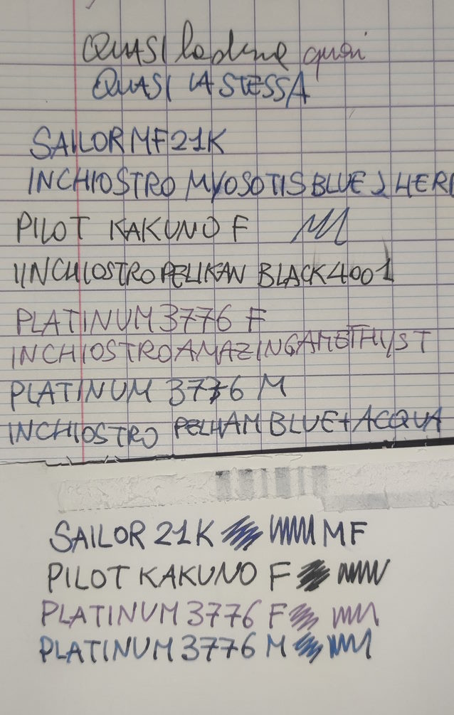 E' una sensazione difficile da descrivere: la mia kakuno pure scrive benissimo ( con quel 4001 black e la sua lubrificazione ) ed è più liscio della 3776, però sulla carta il pennino tira di più, è come se dovessi usare più forza per scrivere con la kakuno, mentre con la 3776 anche avendo più feedback scorre meglio.