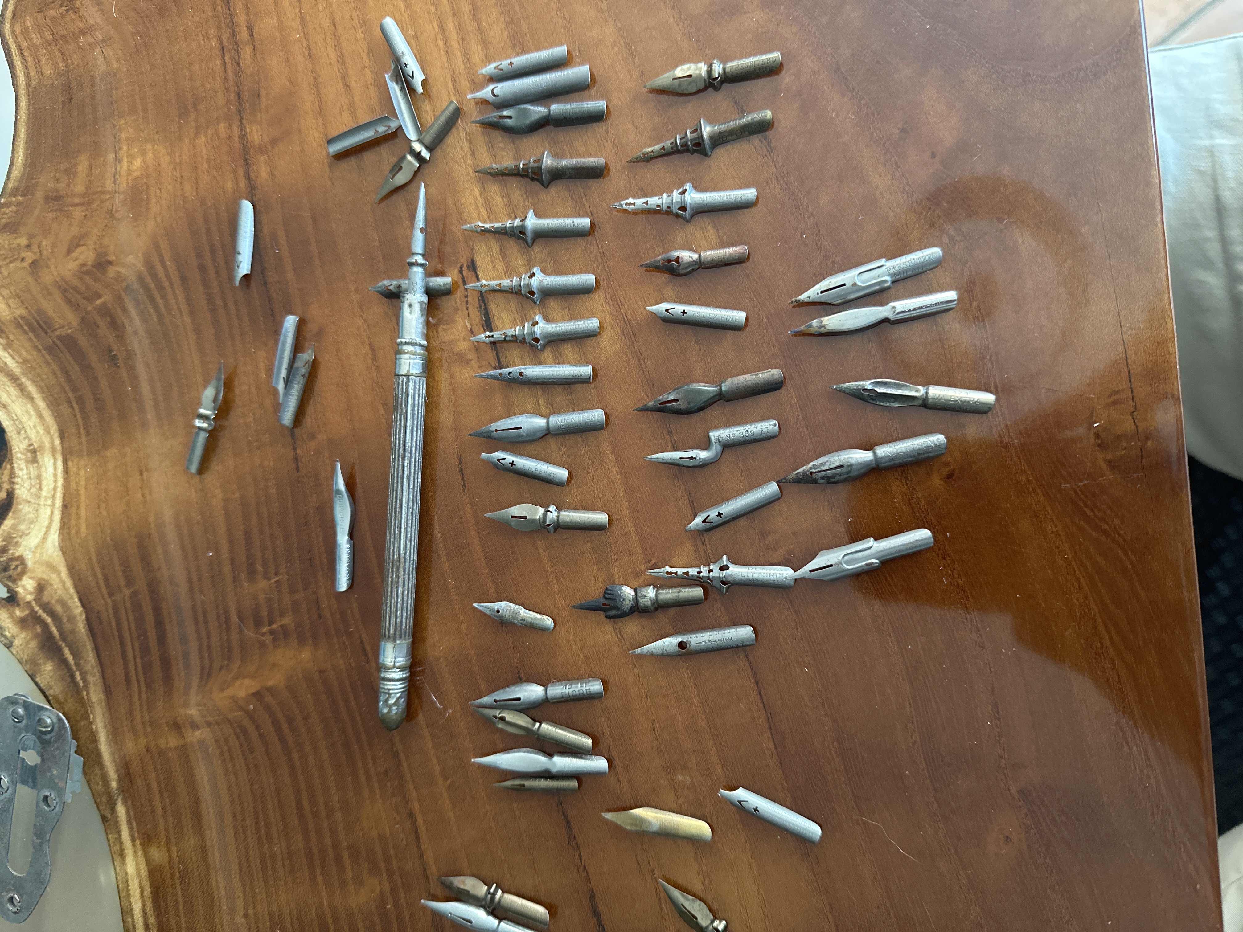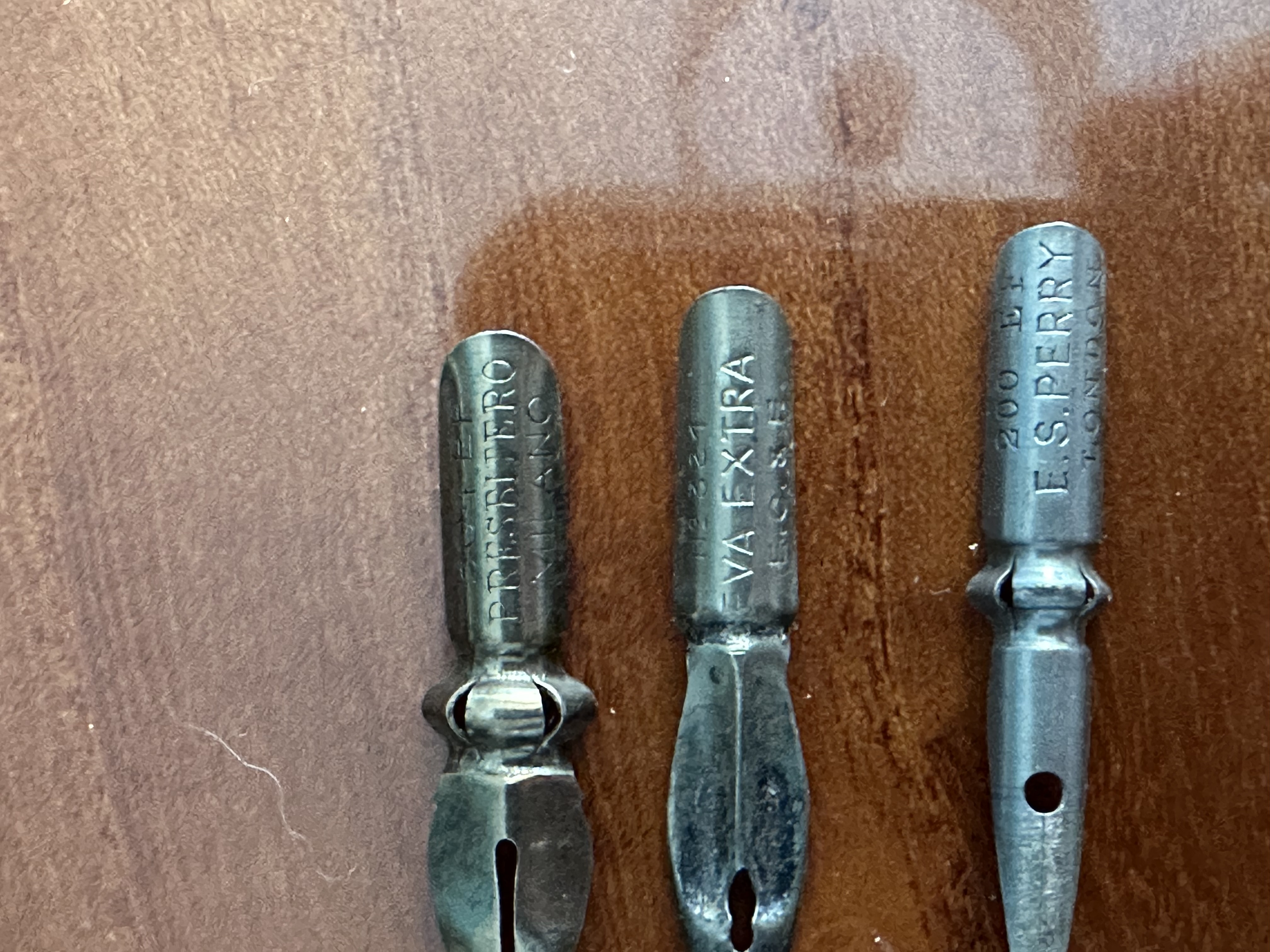 Non conoscevo questo aneddoto, mi ricordo soltanto vagamente di questi pennini che aveva mio nonno, ovviamente, in gran quantità. Il mio favorito è il dito indice puntato in avanti !