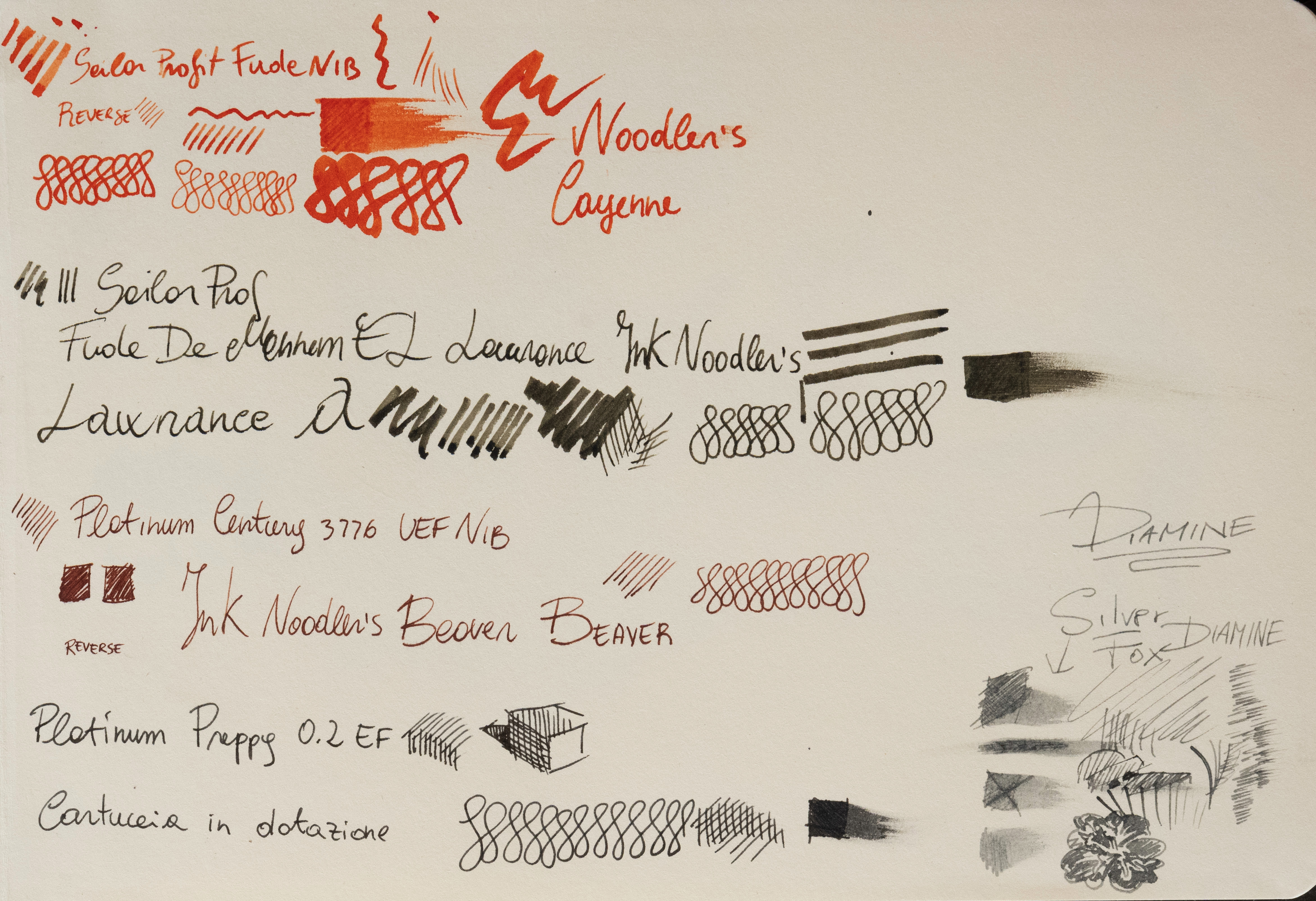 Da notare i vari inchiostri su questa carta Sakura. Il Cayenne spiuma ancora abbastanza (sarà una sfida per me trovare la carta giusta), El Lawrance sembra leggermente più secco ma non lasciatevi ingannare dalla trama della carta da disegno, è molto scorrevole ed è un bulletproof. Addirittura non fa una piega con i pantoni all'alcol!!! Beaver... fa shading persino con un pennino uef, cos'altro posso aggiungere? contiene dentro una variazione cromatica di magenta e verdi incredibile... e poi gli ultimi due. Diamine Silver Fox super scorrevole e preciso (scorrevole come il Cayenne ma con una precisione estrema) e cartuccia platinum di cui ignoro l'inchiostro